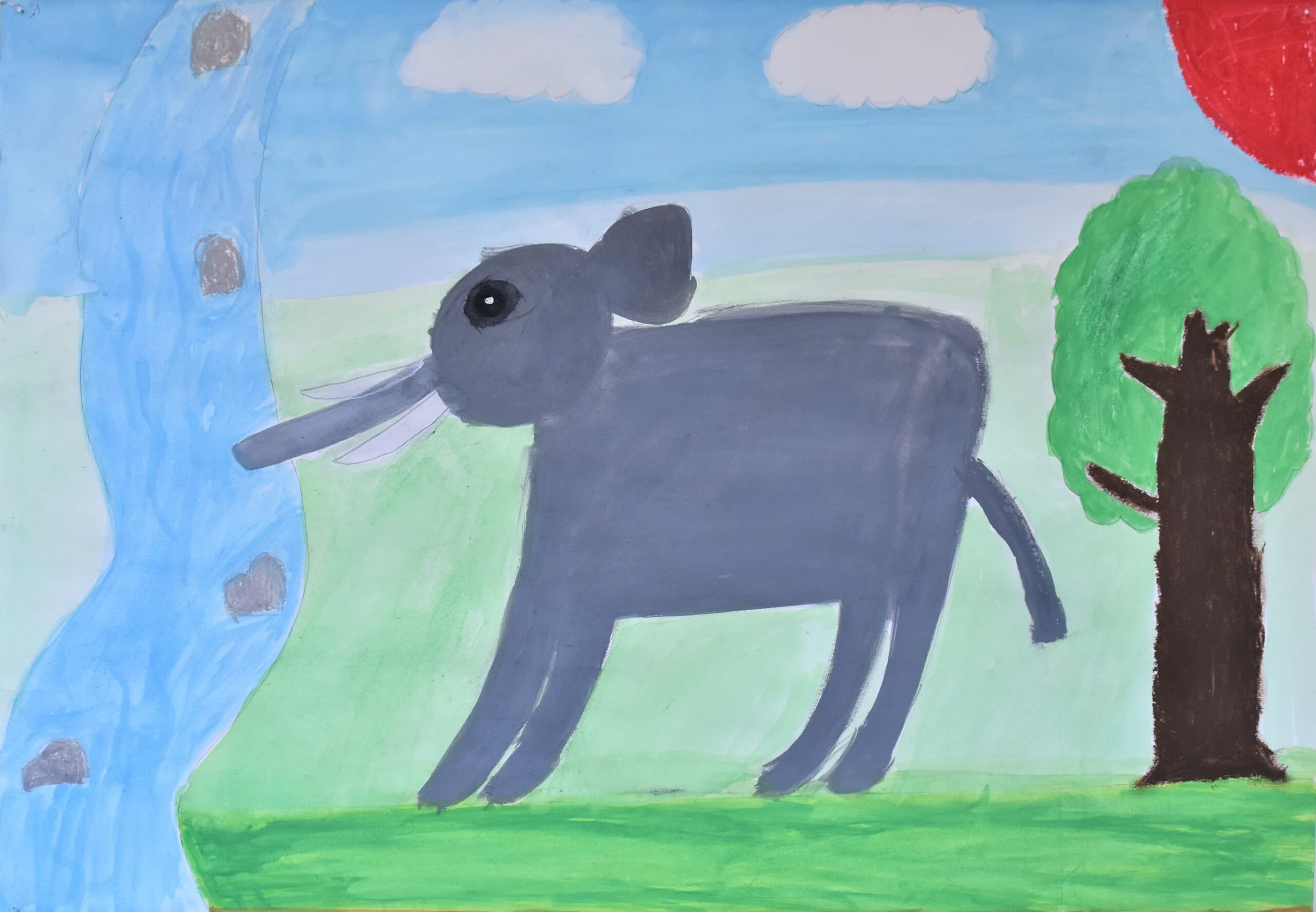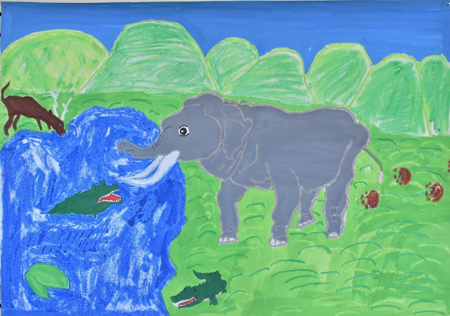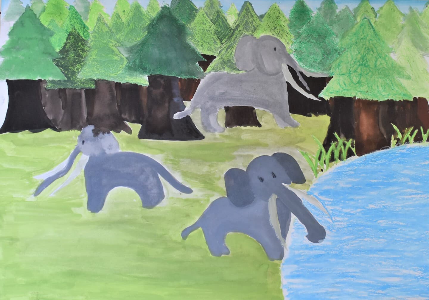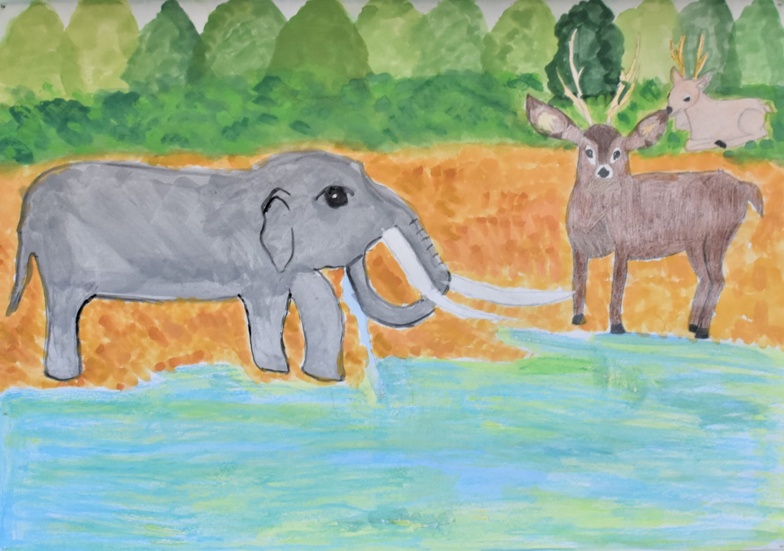 アケボノゾウの生活を想像して描きました。 湿地帯はクレパスを使って、手で伸ばして描きました。川は、水の流れをリアルに出したかったので水で薄めた青色を薄っすら塗りその上から白色と黄色を混ぜた色で細く色を載せました。空は、水で薄めた青色の上から水を含ませない白色で塗りました。アケボノゾウは、絵具だけ塗りました。アケボノゾウが川に水を飲みに行く様子を描きました。