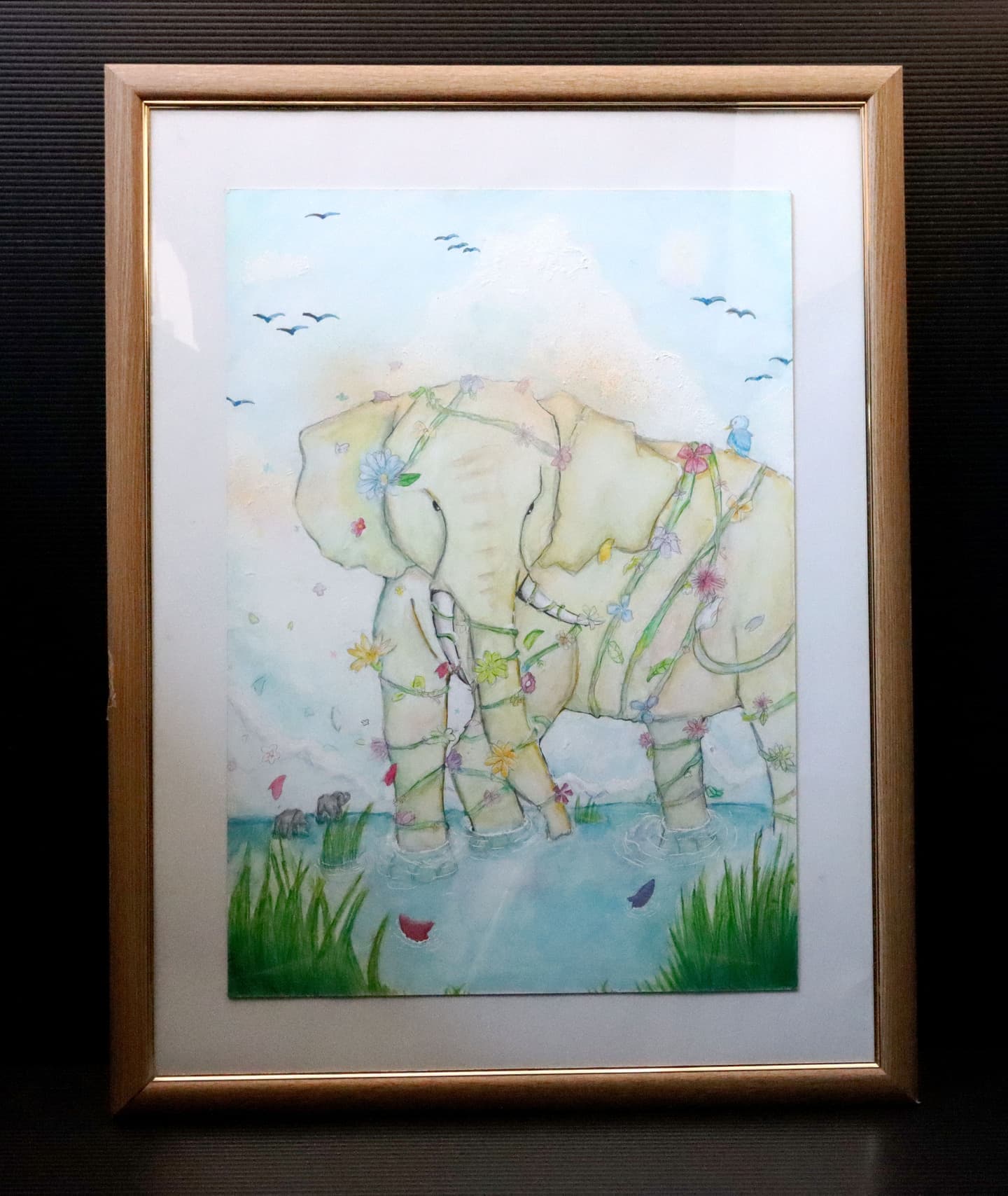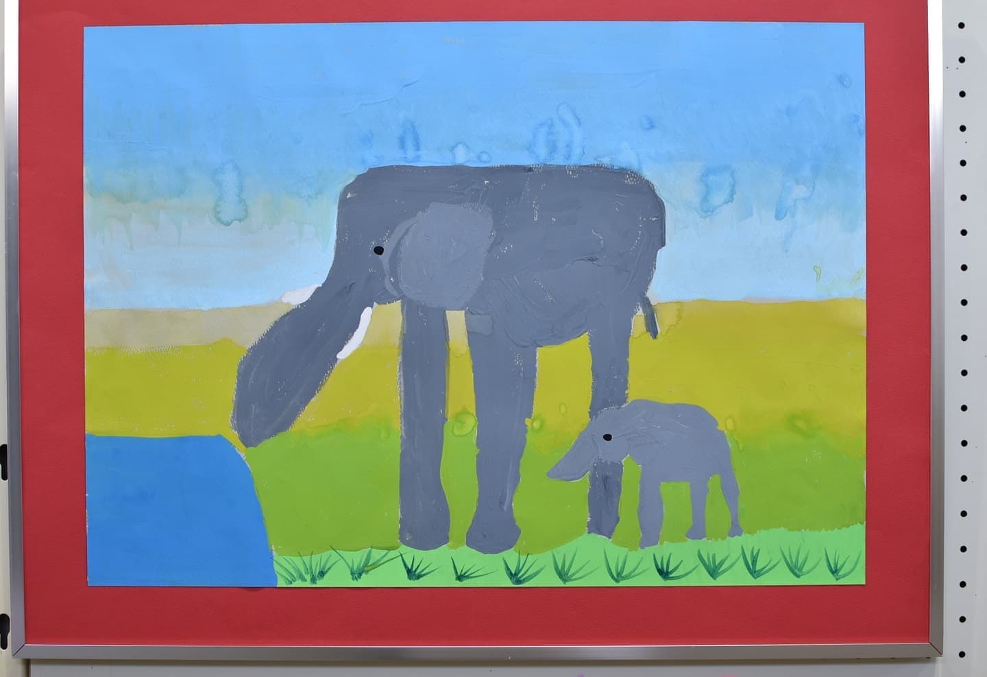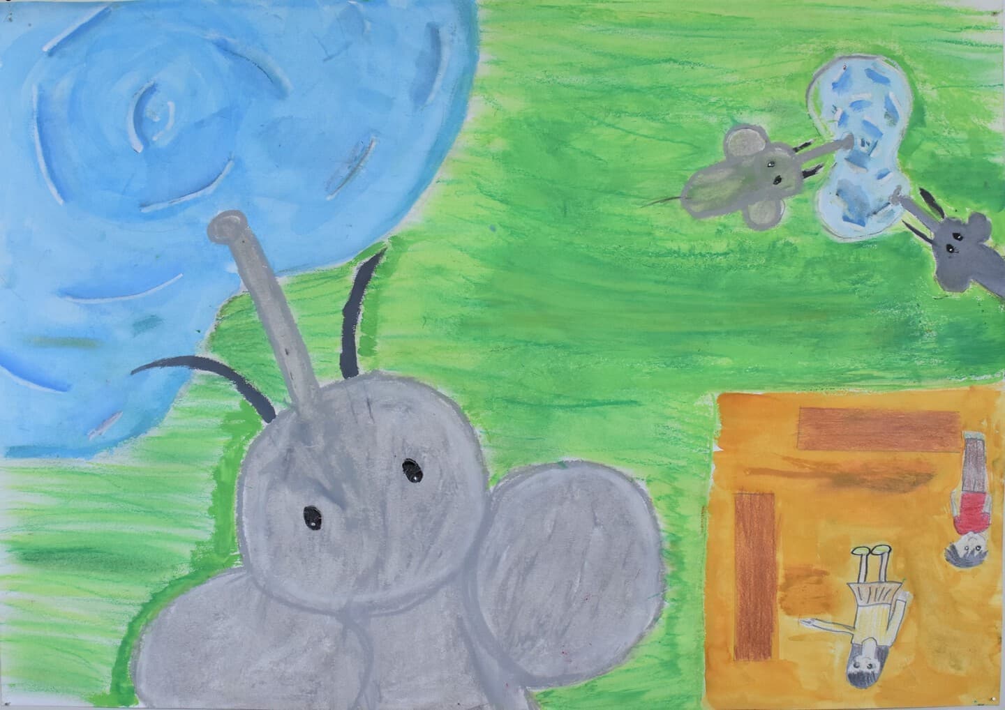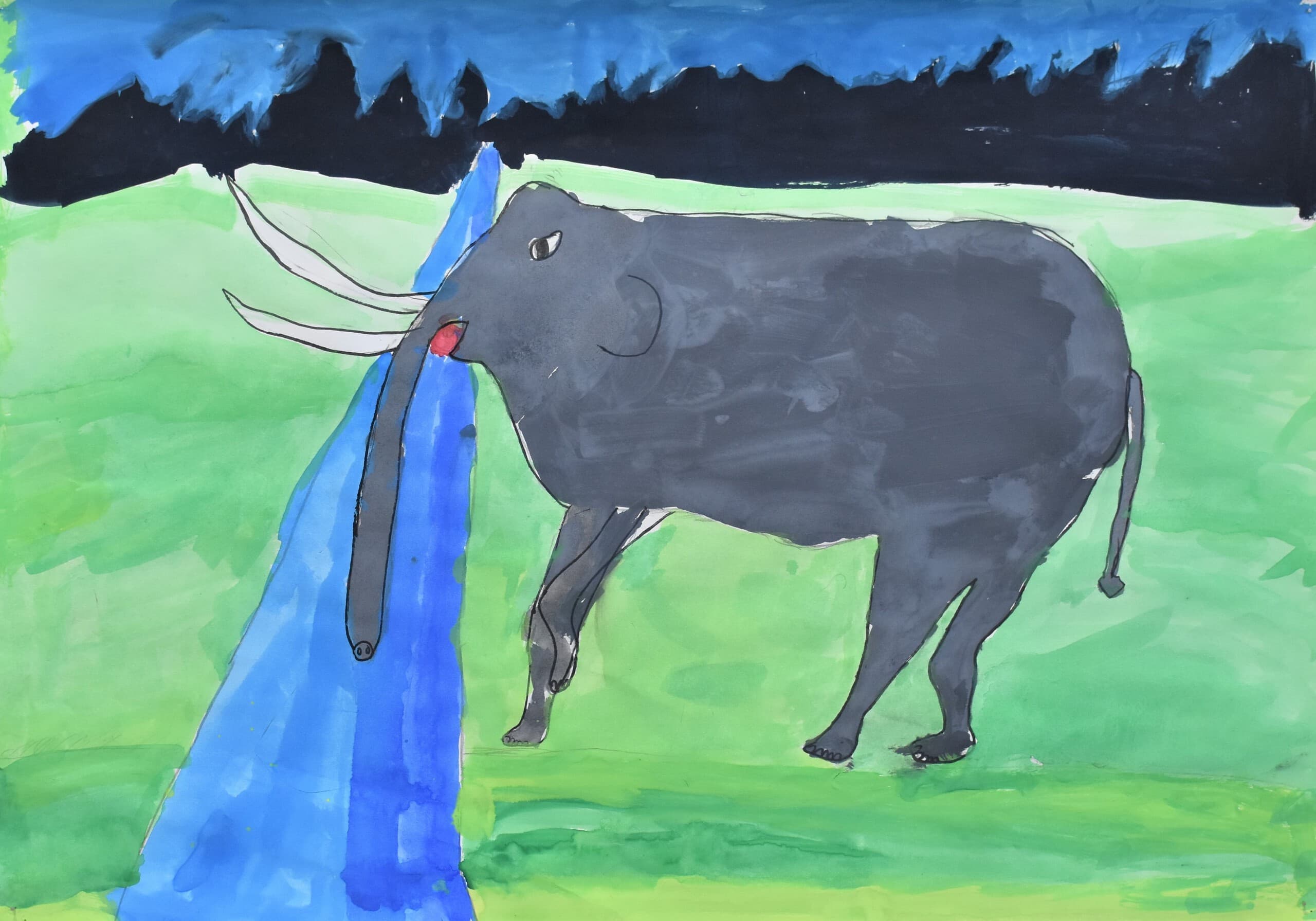 アケボノゾウの生活を想像して描きました。 湿地帯はクレパスを使って、手で伸ばして描きました。川は、水の流れをリアルに出したかったので水で薄めた青色を薄っすら塗りその上から白色と黄色を混ぜた色で細く色を載せました。空は、水で薄めた青色の上から水を含ませない白色で塗りました。アケボノゾウは、絵具だけ塗りました。アケボノゾウが川に水を飲みに行く様子を描きました。