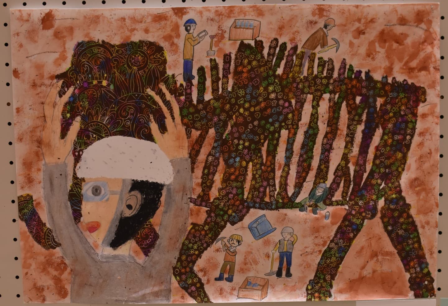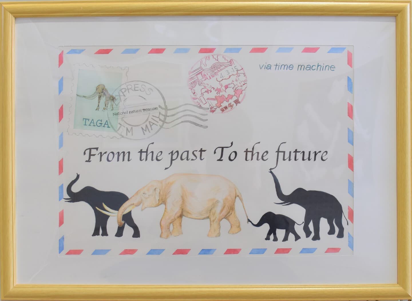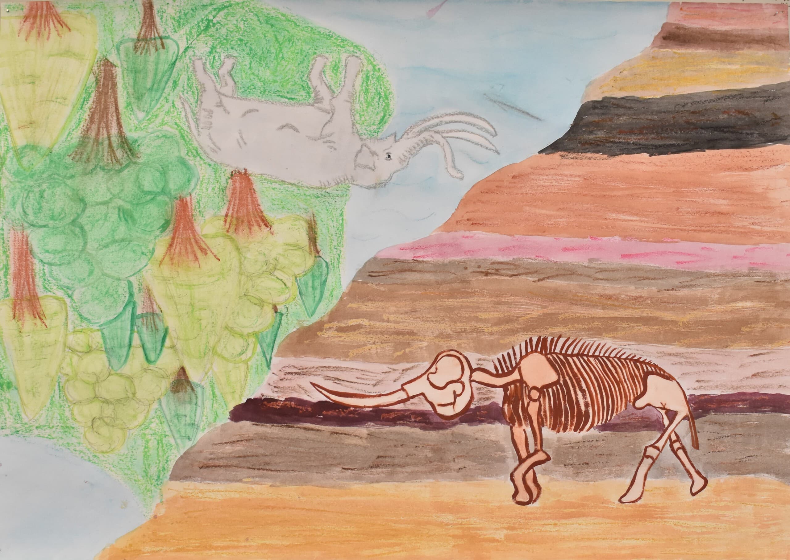 約180万年前に生きていたアケボノゾウと今化石となってこの令和の時代を生きているアケボノゾウ、何100万年ものときがたって、今このアケボノゾウは姿を変えてこの時代に現れているという意味を込めました。見て欲しいところは地層と絵の中の世界線です。とくに地層は色を重ねて書いたのでそこに注目してほしいです。