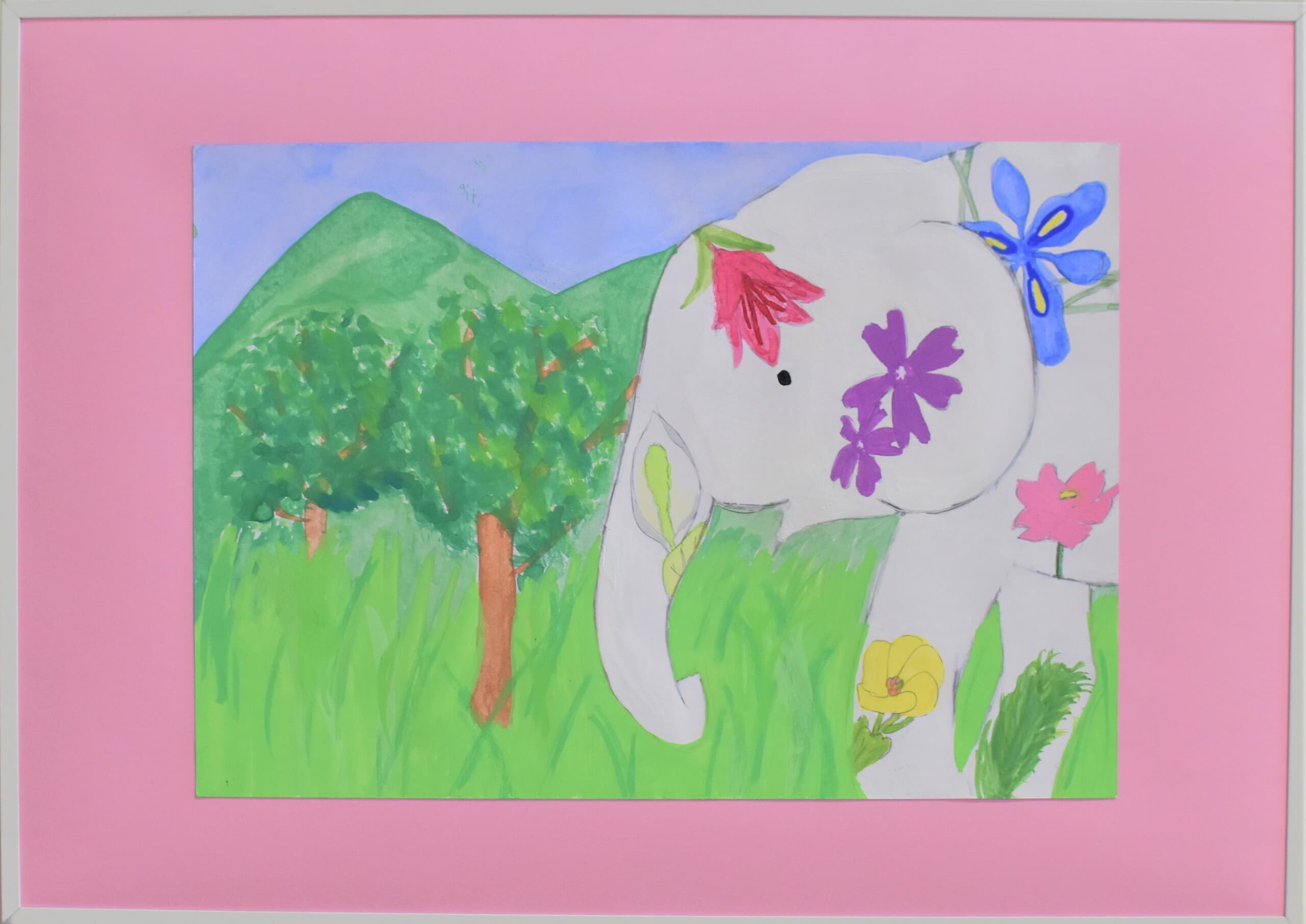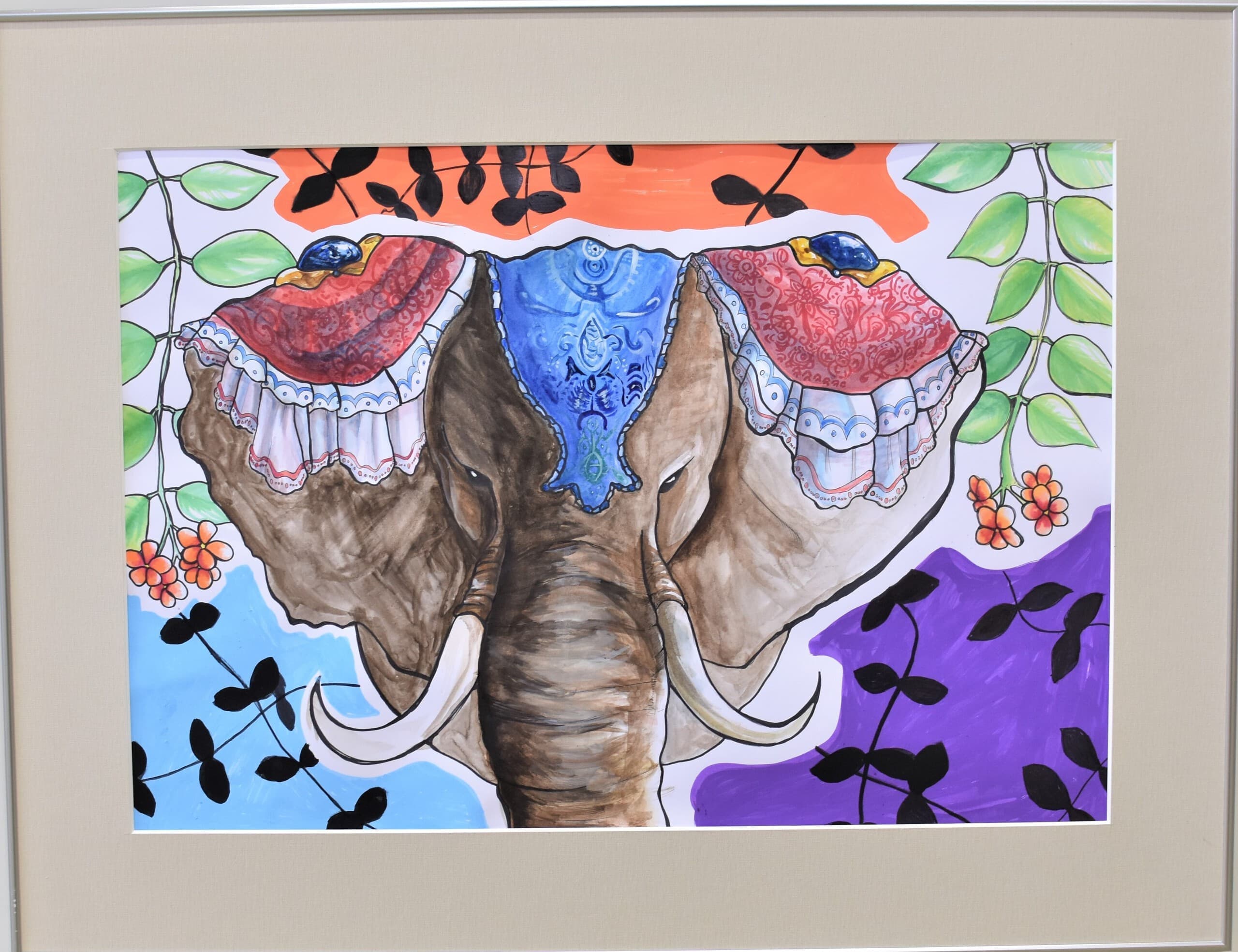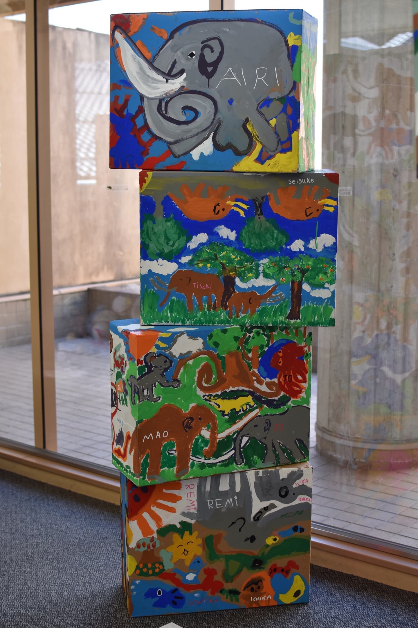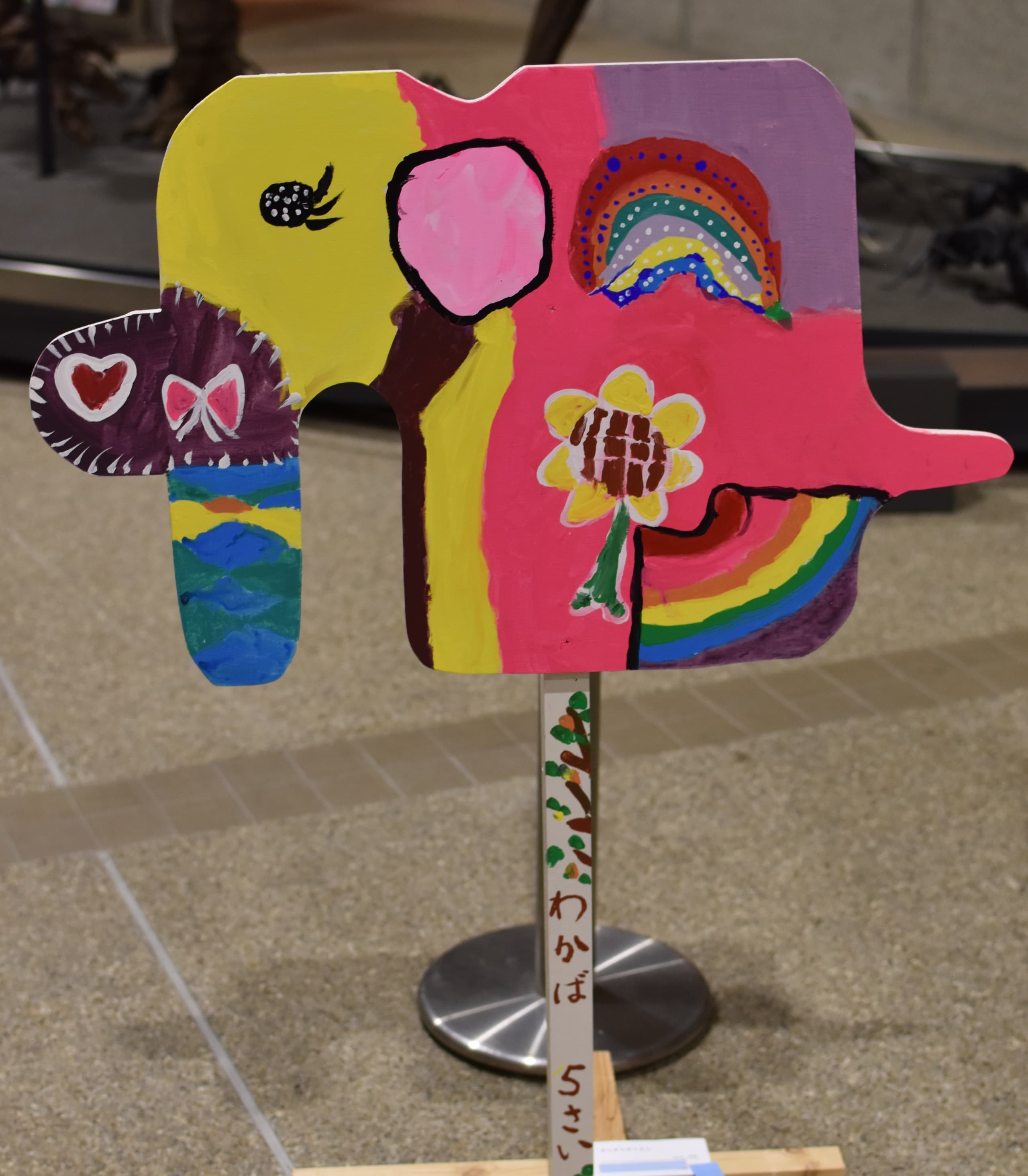 一番多くの応募がありました平面作品!展示会場は色とりどりの優しい顔をした象達の集結です!