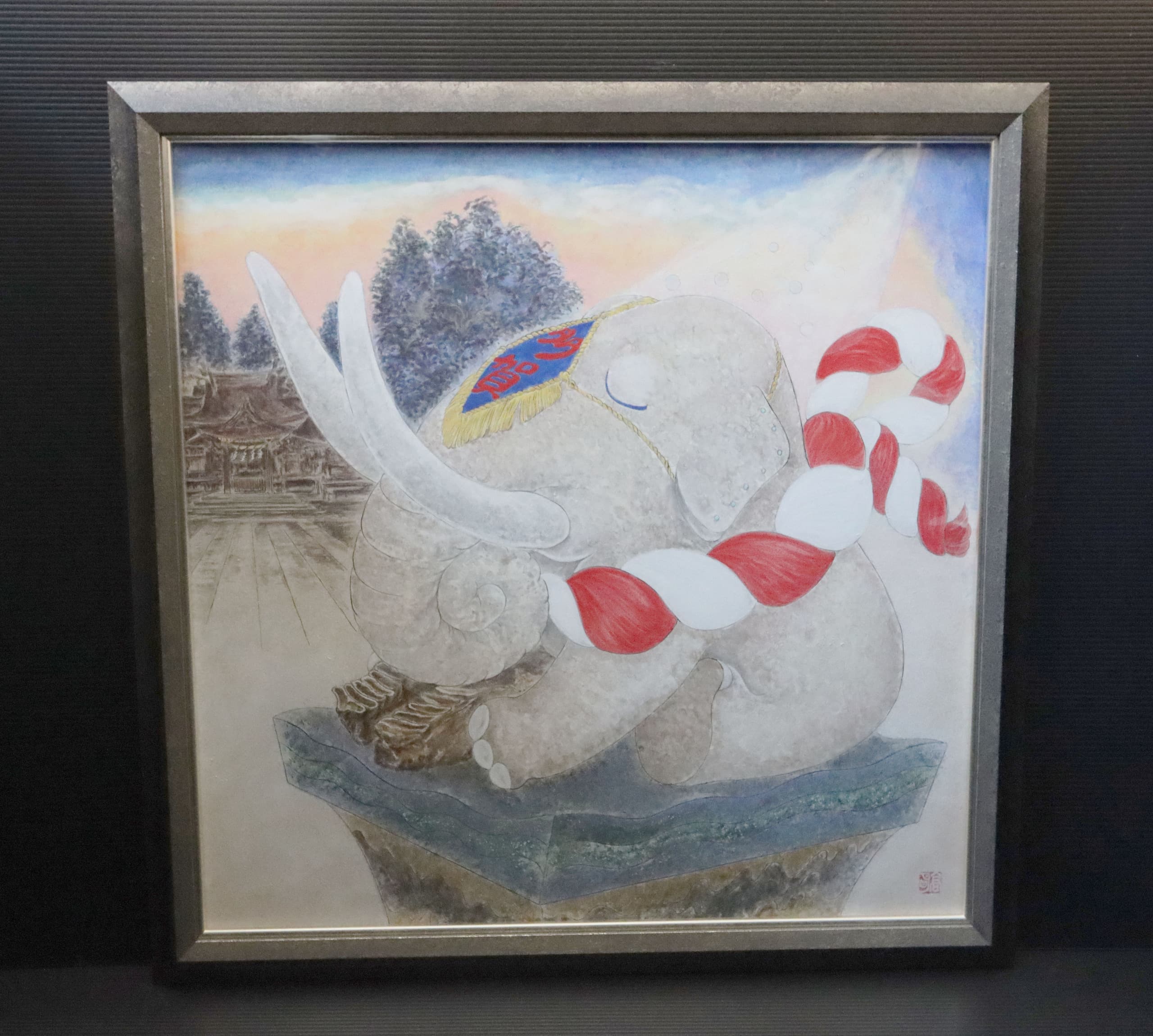 多賀の地で蘇った奇跡のシガタガゾウ。夜がほのぼのと明けるころ、シガタガゾウの化石が元の姿に戻ります。体は湖のような透明感のある白、背中には石楠花とササユリの花が彩られた赤いマントを身につけています。あけぼのの空の下、嬉しそうに歩くシガタガゾウの姿を月が微笑みながら見守っています。ほら、目を閉じてみて。想いを寄せればその姿が見えてくるかもしれませんよ。