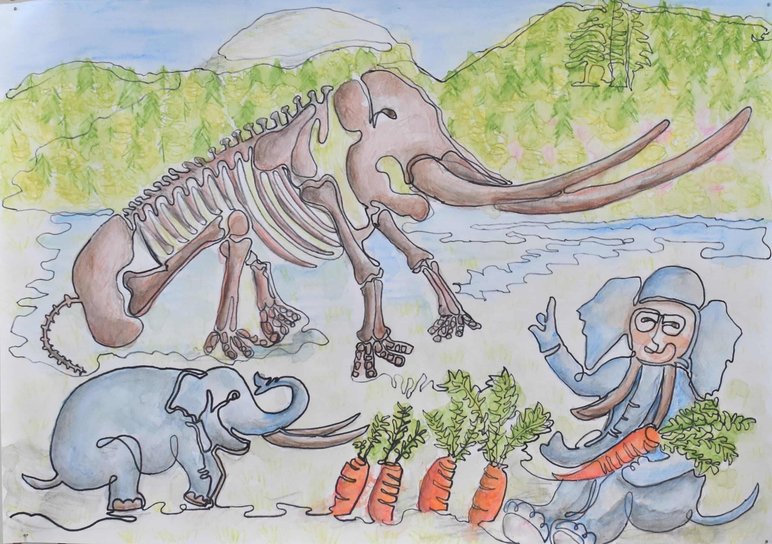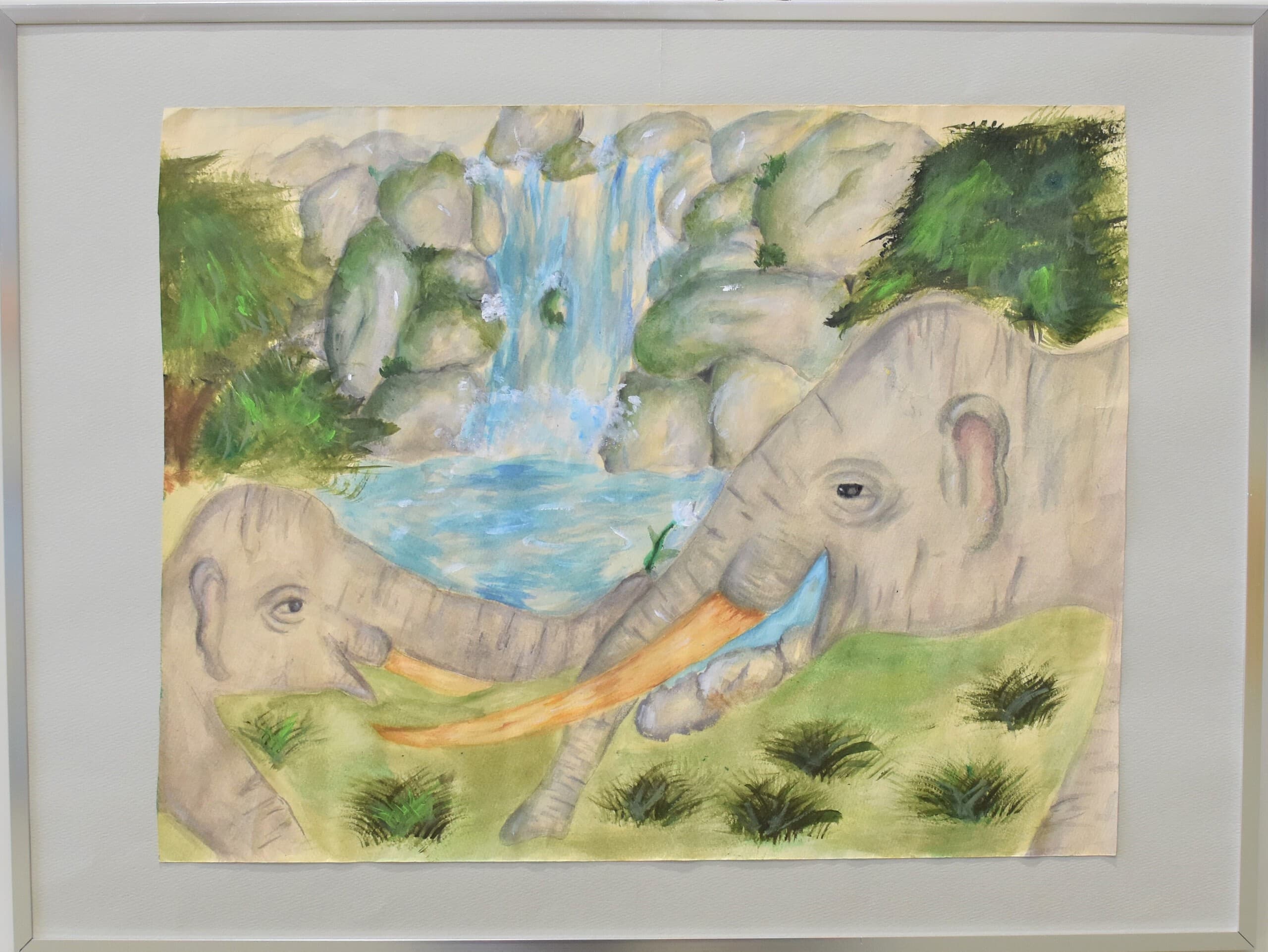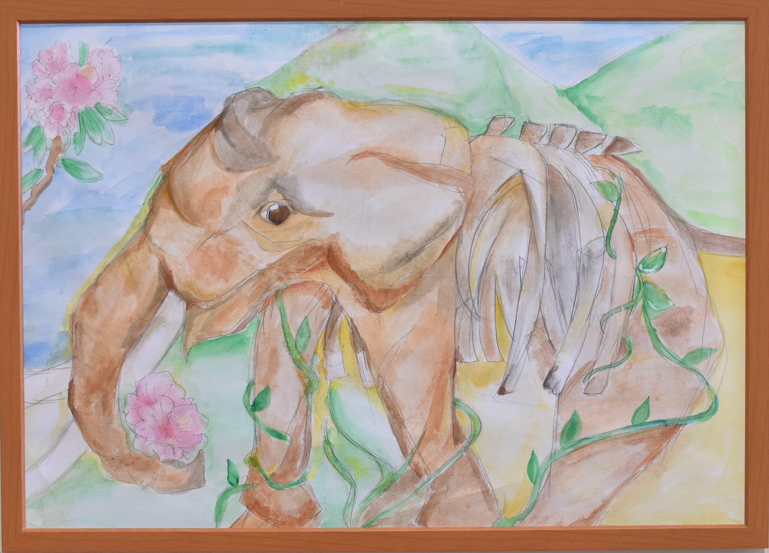 この作品は「もしも未来でアケボノゾウが生きていたらこんな風に暮らしていたらいいな」と思い想像しながら描きました。この作品で一番見て欲しい所は、子どものアケボノゾウが水を噴射しているところです。細かい水のところまで丁寧に描きました。未来でのアケボノゾウの想像の姿を想像しながら見てください。