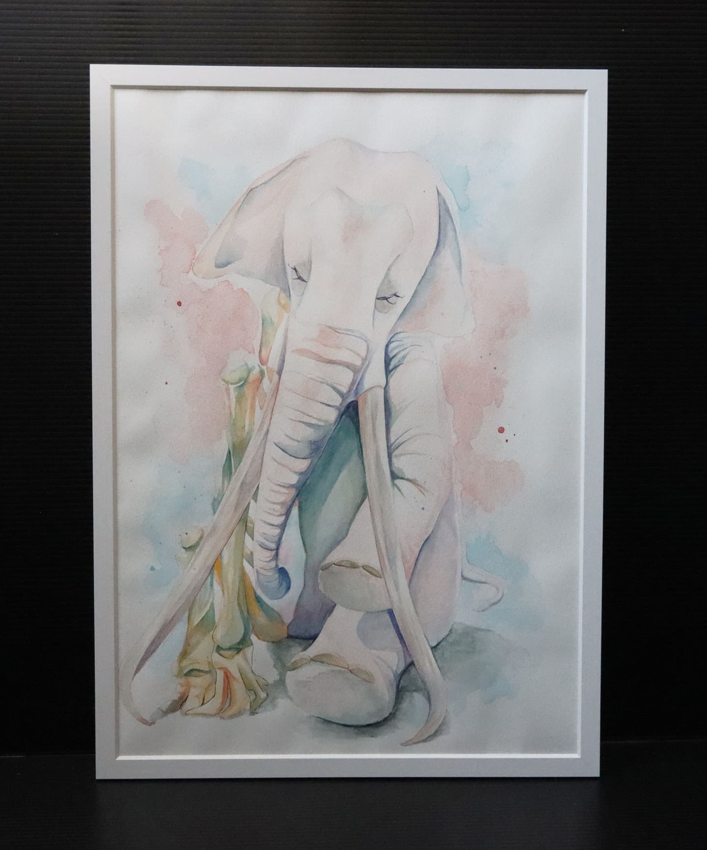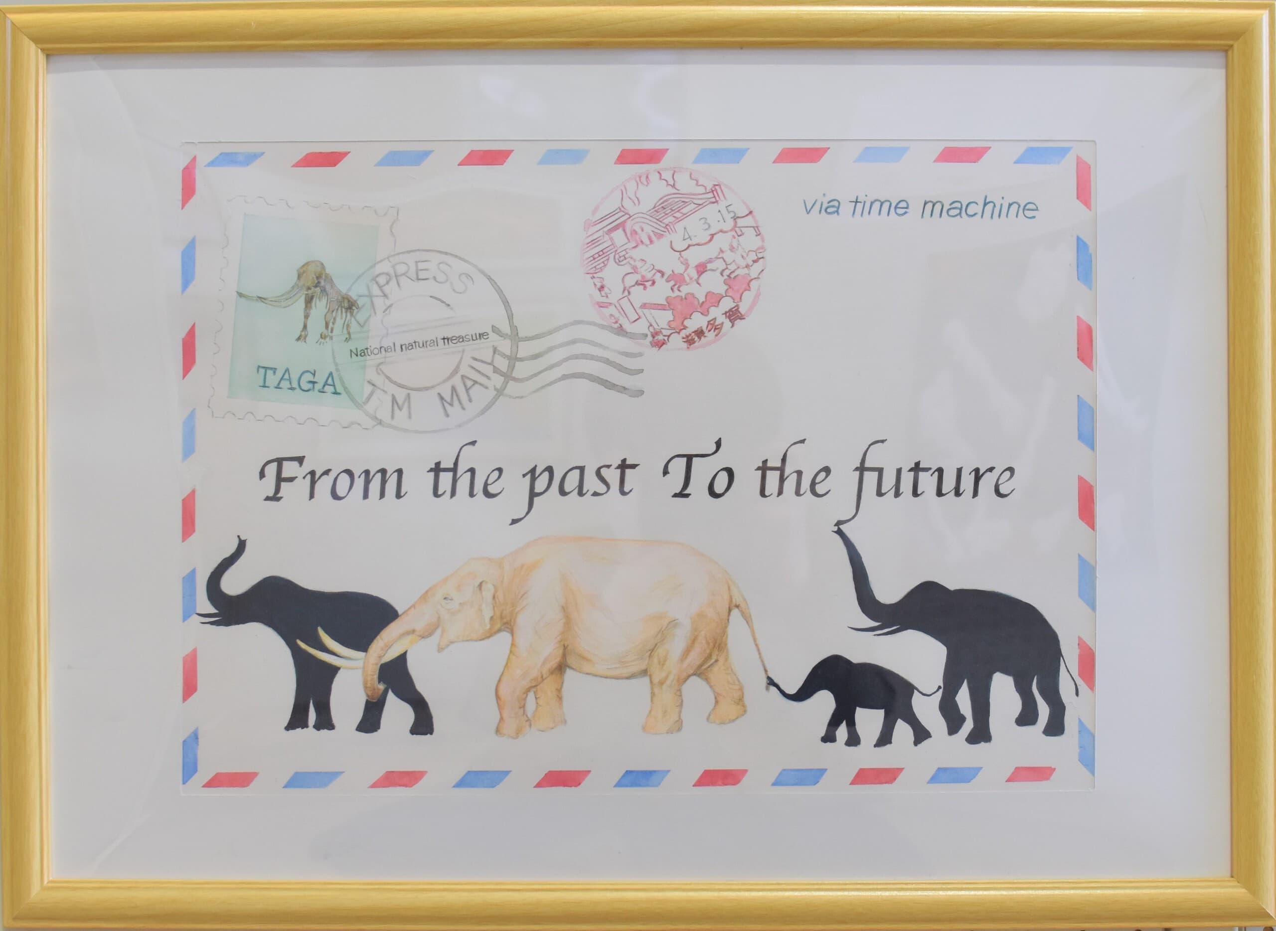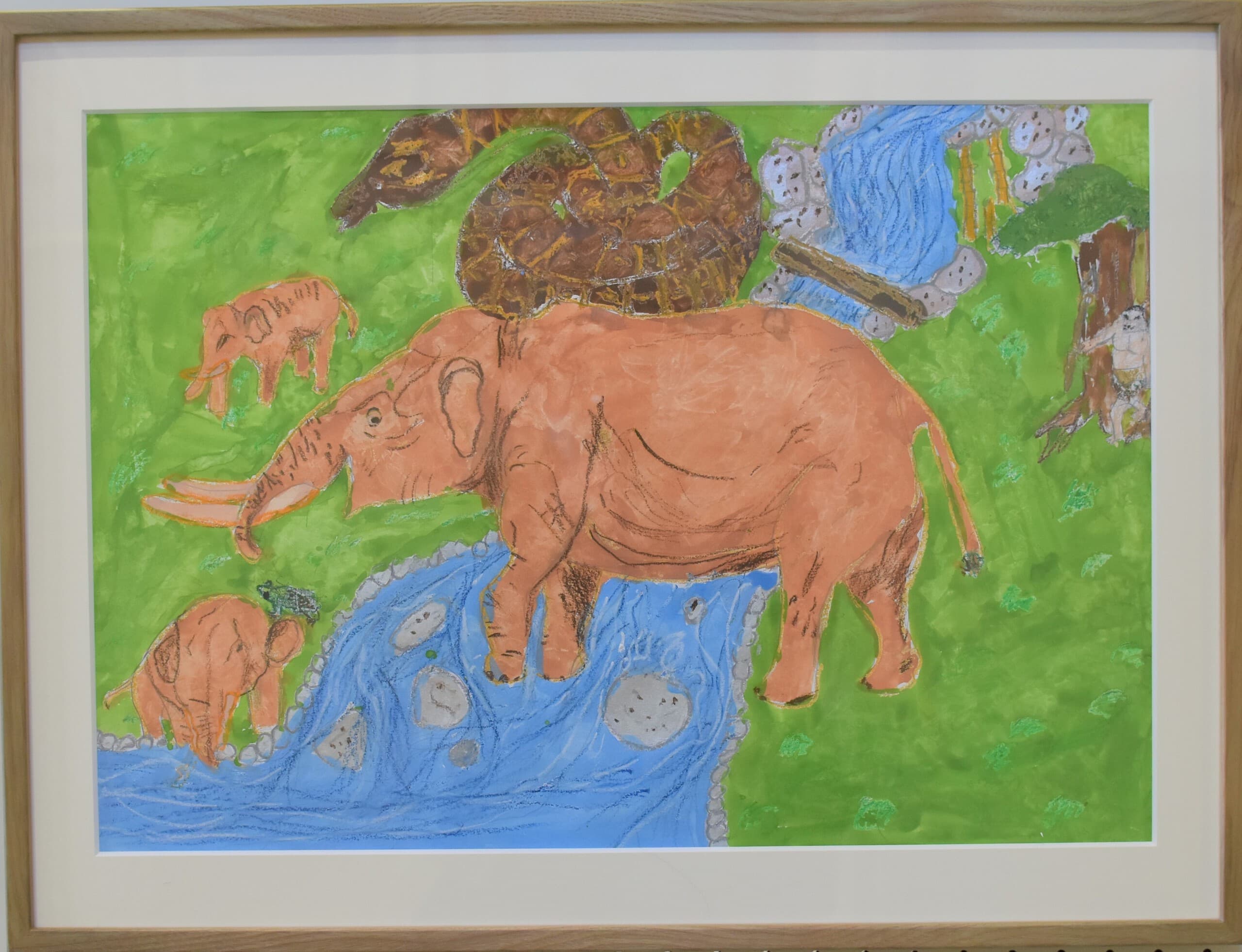 この作品は「もしも未来でアケボノゾウが生きていたらこんな風に暮らしていたらいいな」と思い想像しながら描きました。この作品で一番見て欲しい所は、子どものアケボノゾウが水を噴射しているところです。細かい水のところまで丁寧に描きました。未来でのアケボノゾウの想像の姿を想像しながら見てください。