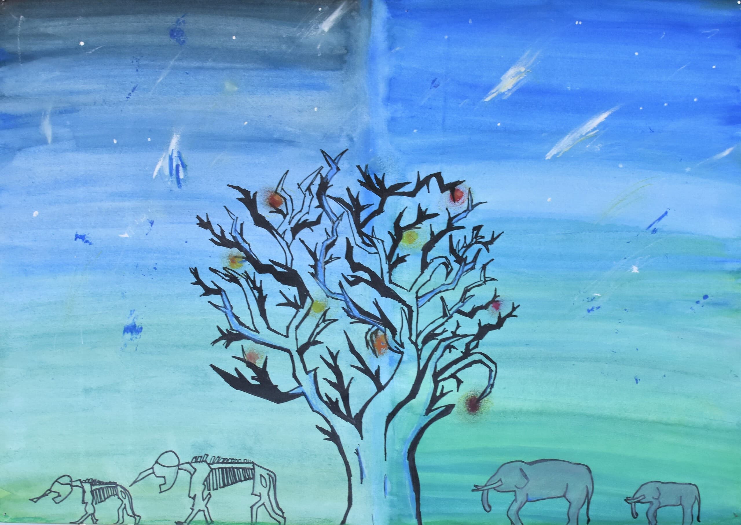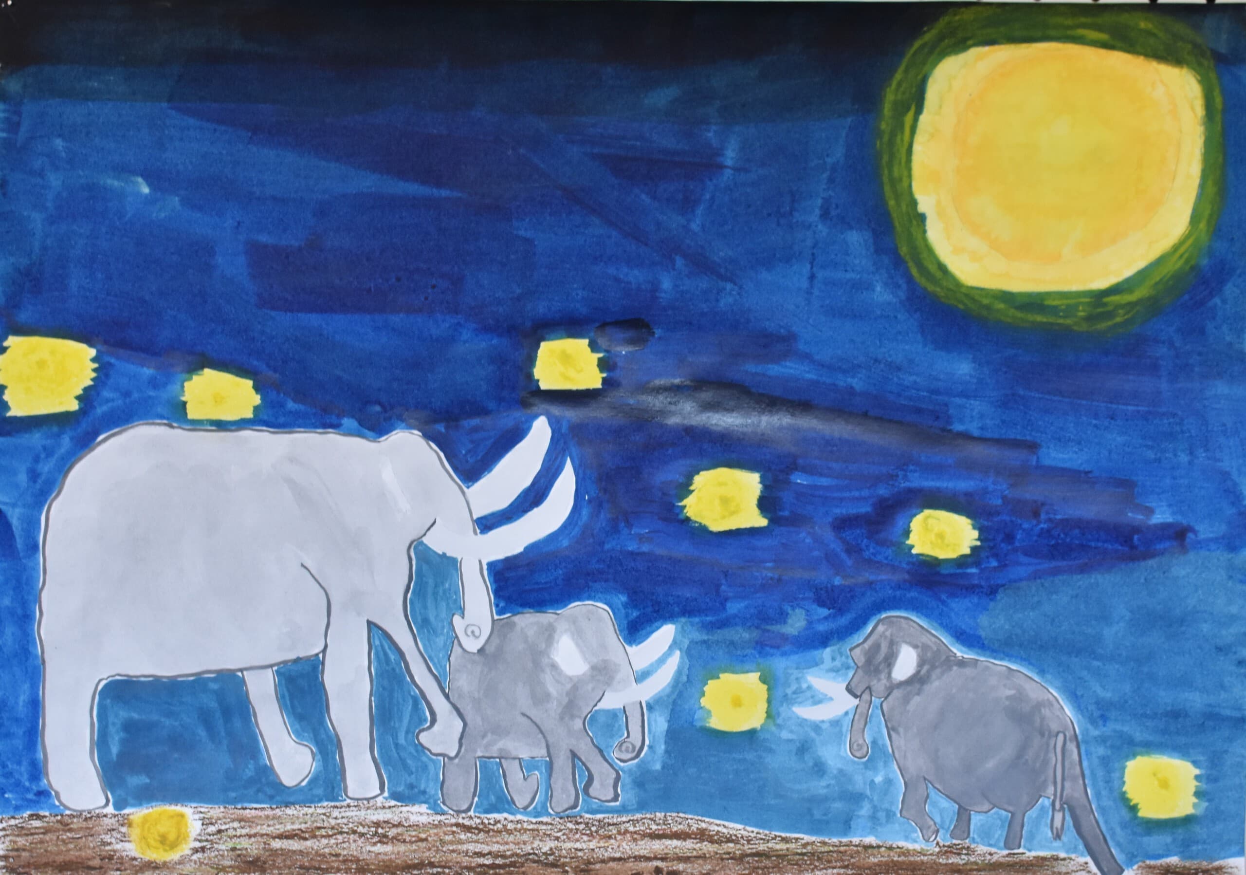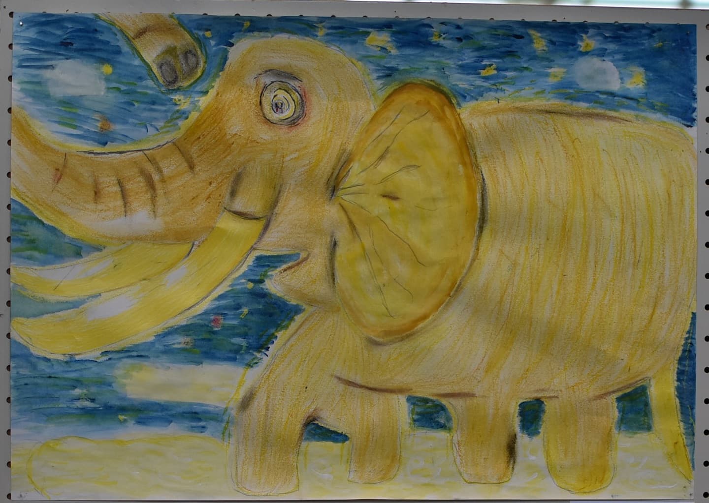 私が作品で見てほしいところは2つあります。1つ目に見てほしいところは、夜空の色です。元々、1つの色で統一しようと思っていましたが、下書きを描いてみたら少し見栄えが悪いかと思いました。その時に、グラデーションが良いのではないかと思い、もう一度下書きを描いてみたら、最初のよりよくなりました。夜空の色に使っている物は、クレパス、絵の具です。2つ目に見てほしいところは、象です。ペンで線をなぞっておらず、そのまま鉛筆で描いています。少し影をつけてみたりしました。色も、少し色が薄いところと濃いところがあります。
