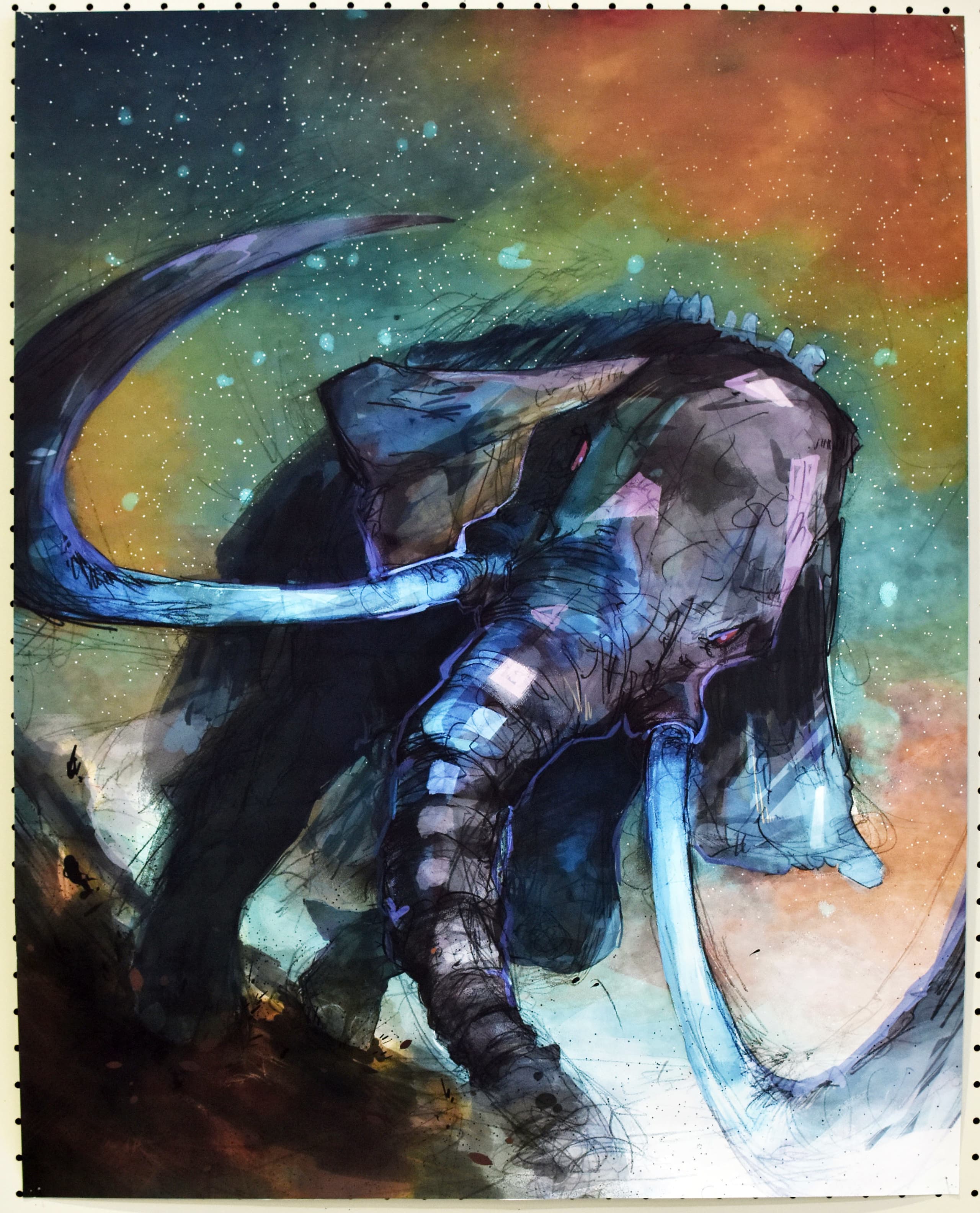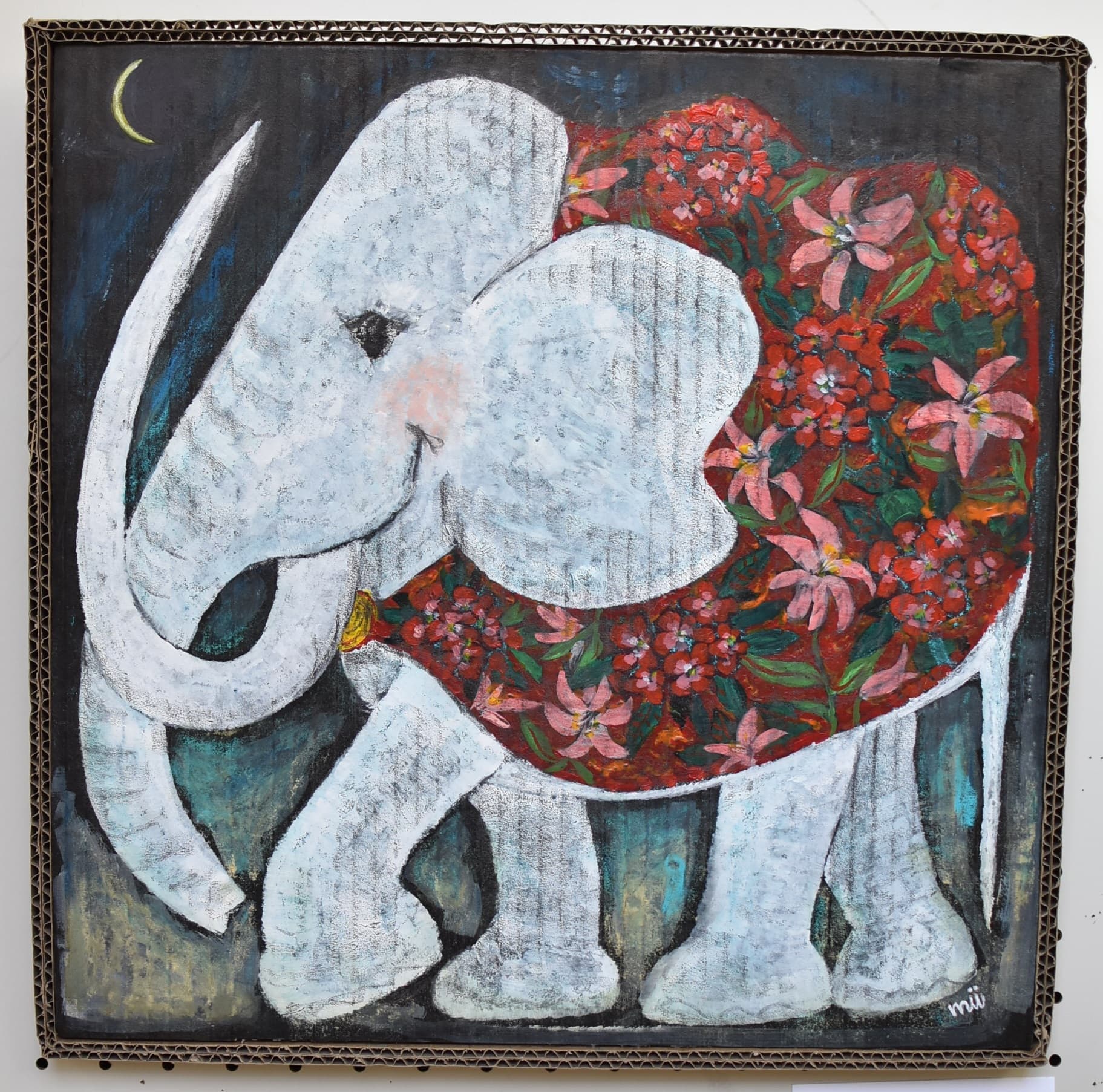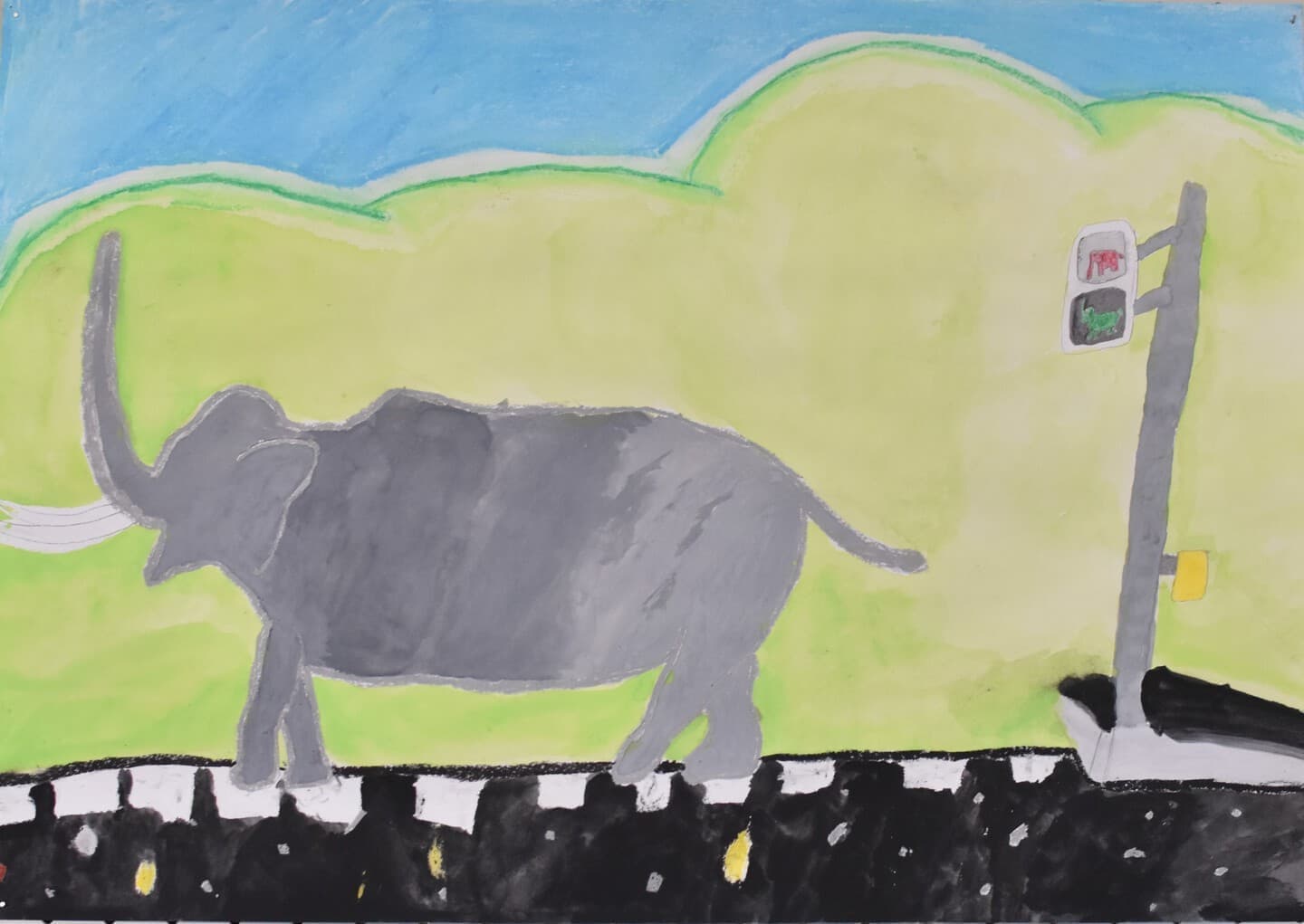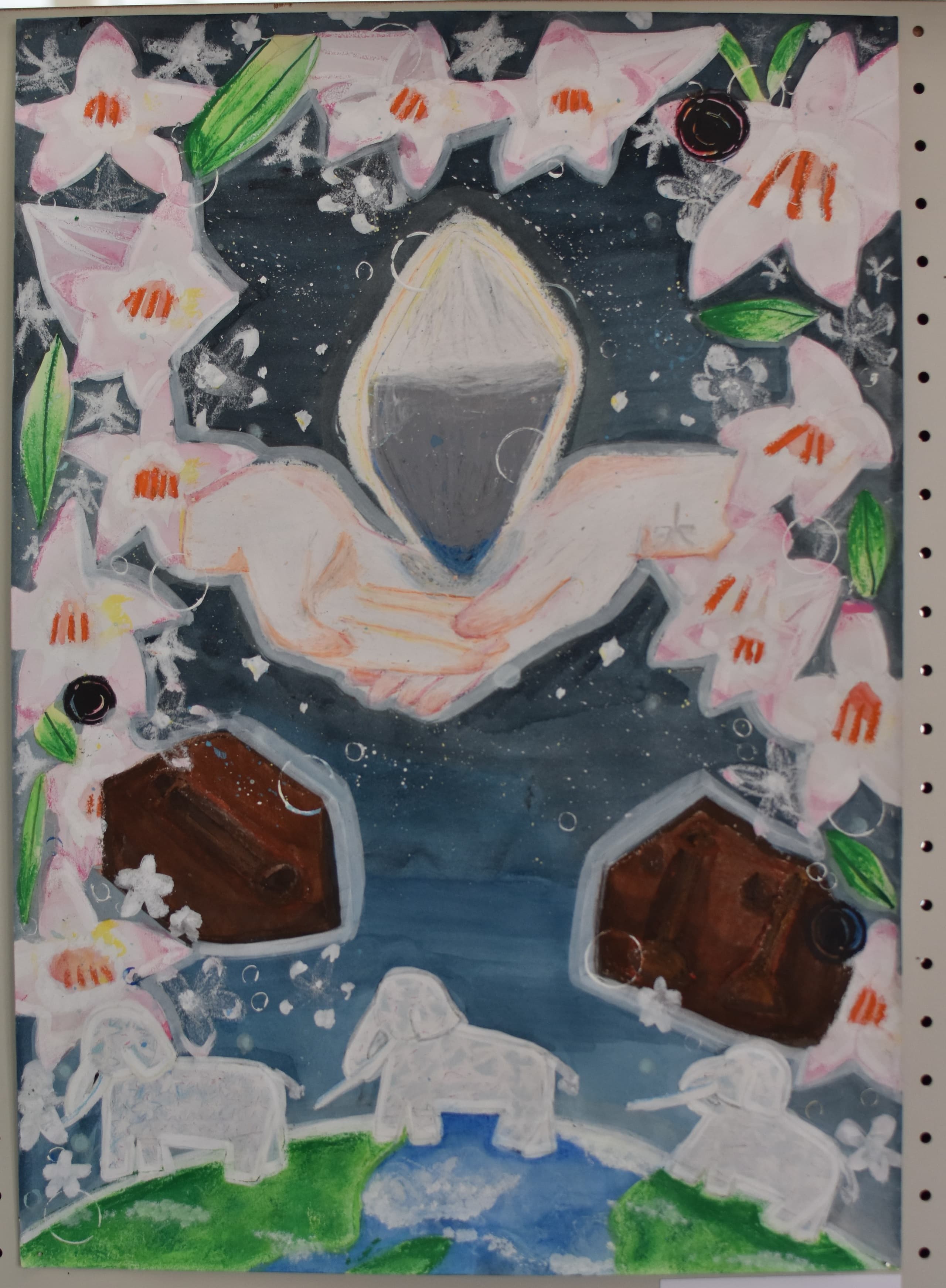 私が作品で見てほしいところは2つあります。1つ目に見てほしいところは、夜空の色です。元々、1つの色で統一しようと思っていましたが、下書きを描いてみたら少し見栄えが悪いかと思いました。その時に、グラデーションが良いのではないかと思い、もう一度下書きを描いてみたら、最初のよりよくなりました。夜空の色に使っている物は、クレパス、絵の具です。2つ目に見てほしいところは、象です。ペンで線をなぞっておらず、そのまま鉛筆で描いています。少し影をつけてみたりしました。色も、少し色が薄いところと濃いところがあります。