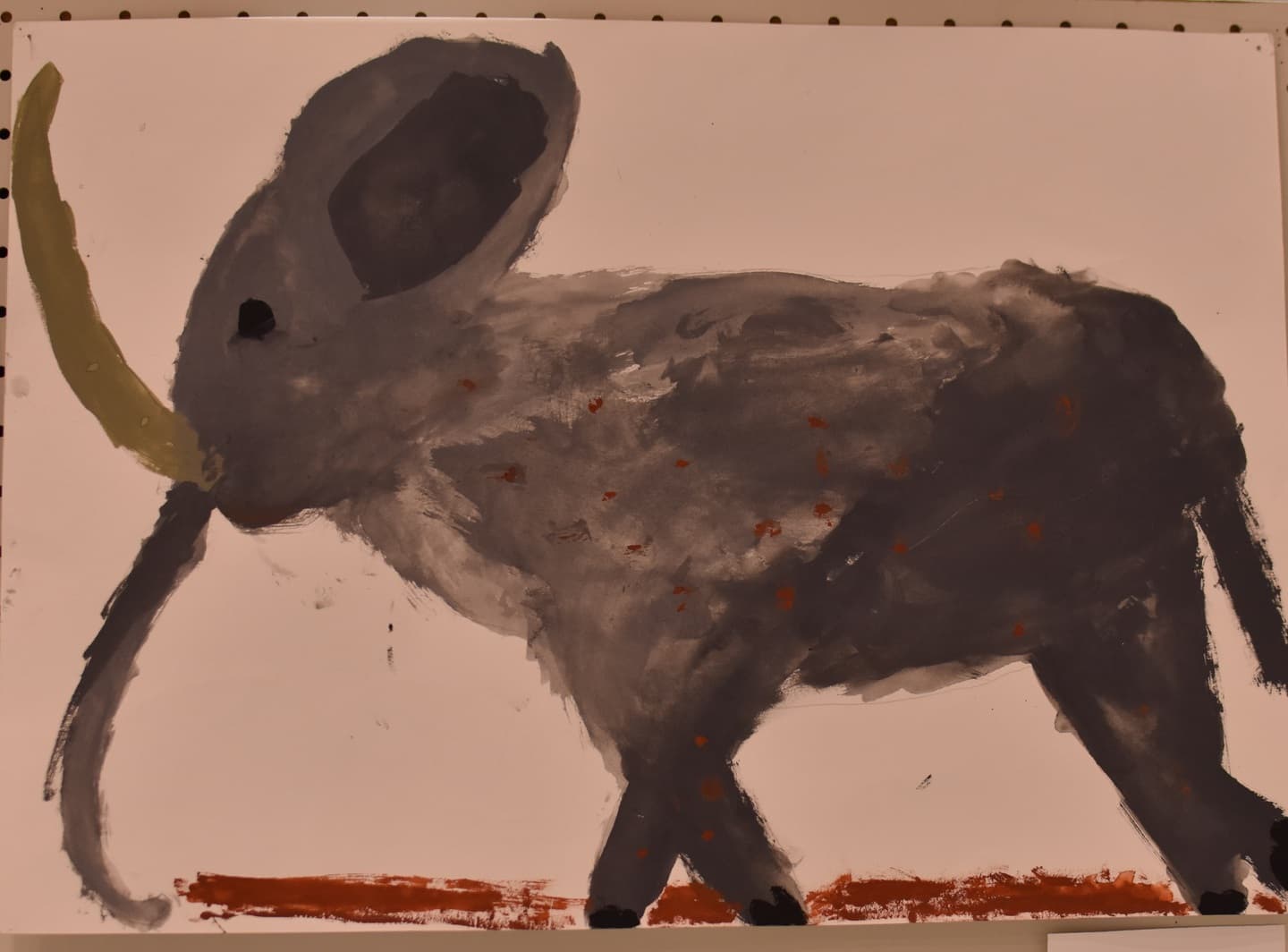 アケボノゾウの少しにじませた所や薄く塗ったところなど濃くしたり薄くしたりゾウの体を少しザラザラに描くことを頑張りました。昔のゾウを表現しているので地面に落ちている細かい点を見てほしいです。