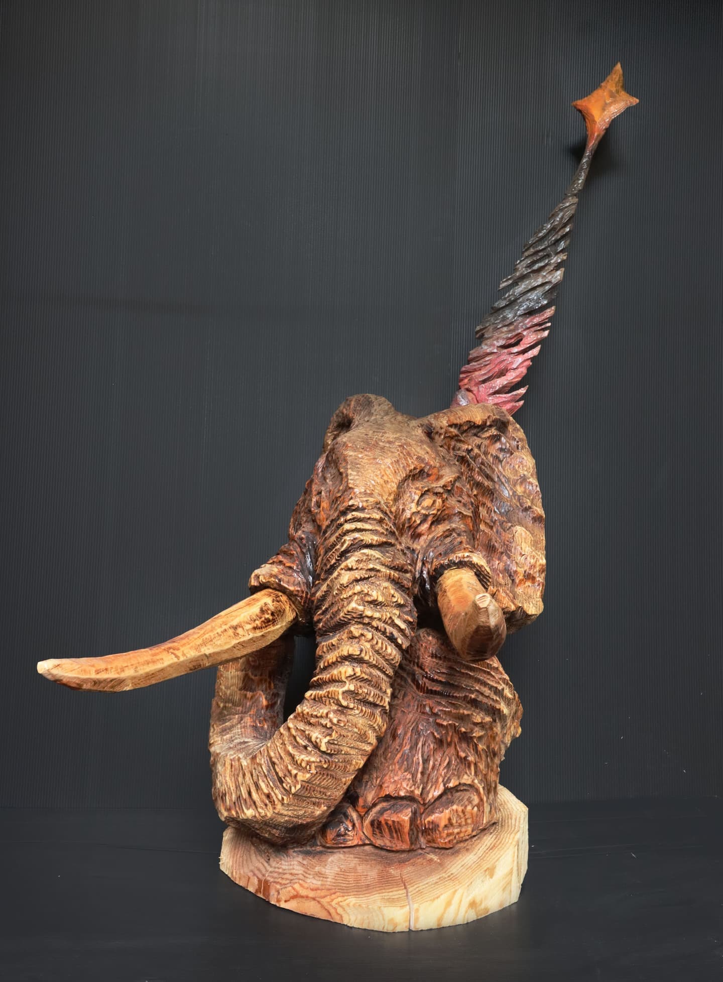 約180万年前に、滋賀県多賀の地に生息していたアケボノゾウが、時空を超えてよみがえります。作品の形態は、浮き上がる(surface)アケボノゾウのイメージです。素材は、日本のゾウなので和紙を使用。和紙の燃え残った断片を重ねて成型しています。表層(surface)で覆われた、中が空洞の構造です。表層の文様は、感情や堆積する時間やデータの渦を表します。今、アケボノゾウの生きた姿を見ることはできませんが、残った骨の化石が生前の姿や生態を示すように、燃え残った和紙の断片でその雄姿を表現しました。床面の円形は、展示会場のフロアと一体となり、立体となった頭部は中空で、その内部は無数の焦げ穴により会場空間と繋がります。今もアケゾノゾウは、私たちと共に在るのです。アケボノゾウも人も、限られた命の灯を精一杯燃えあがらせ、やがて消えていく存在ですが、共にその精神は、時空を超えて未来に繋がっているのだと思います。