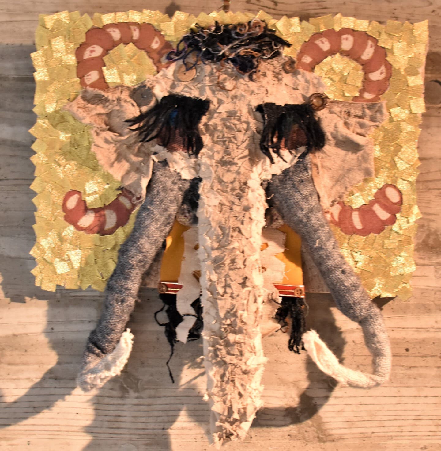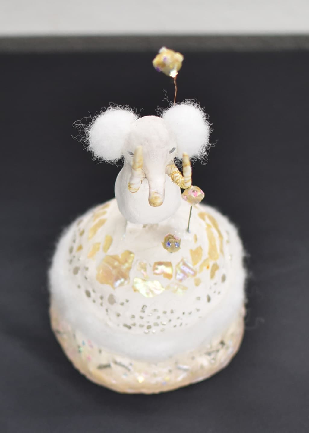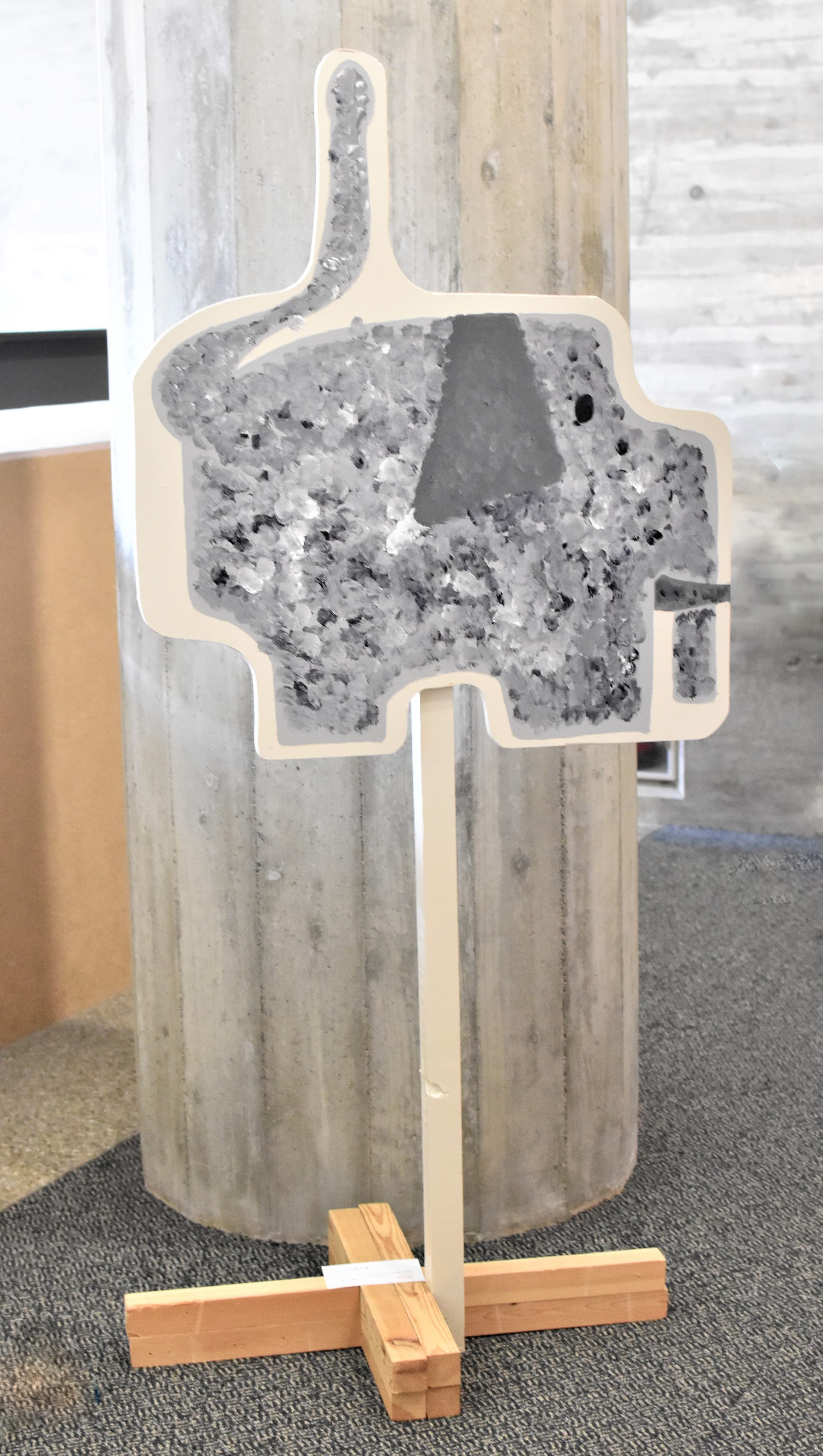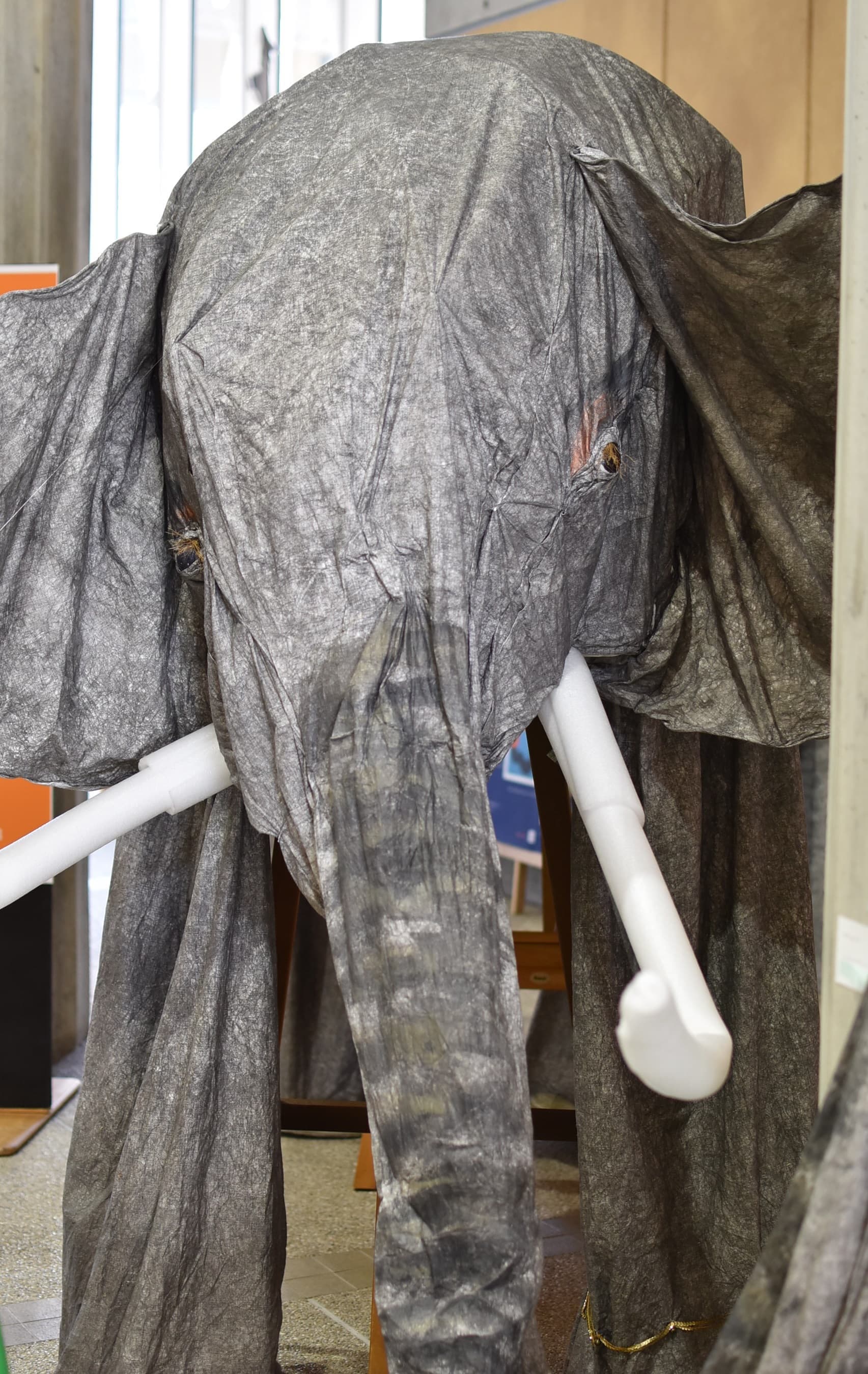 土台の材料に使った段ボールには温かみやゾウの皮膚をかもし出す凹凸があり、イメージが膨らみました。アケボノゾウの化石がシガタガゾウとしてが蘇ったらと思うとワクワクします!これから生まれるたくさんの伝説のひとつになれば嬉しいです。