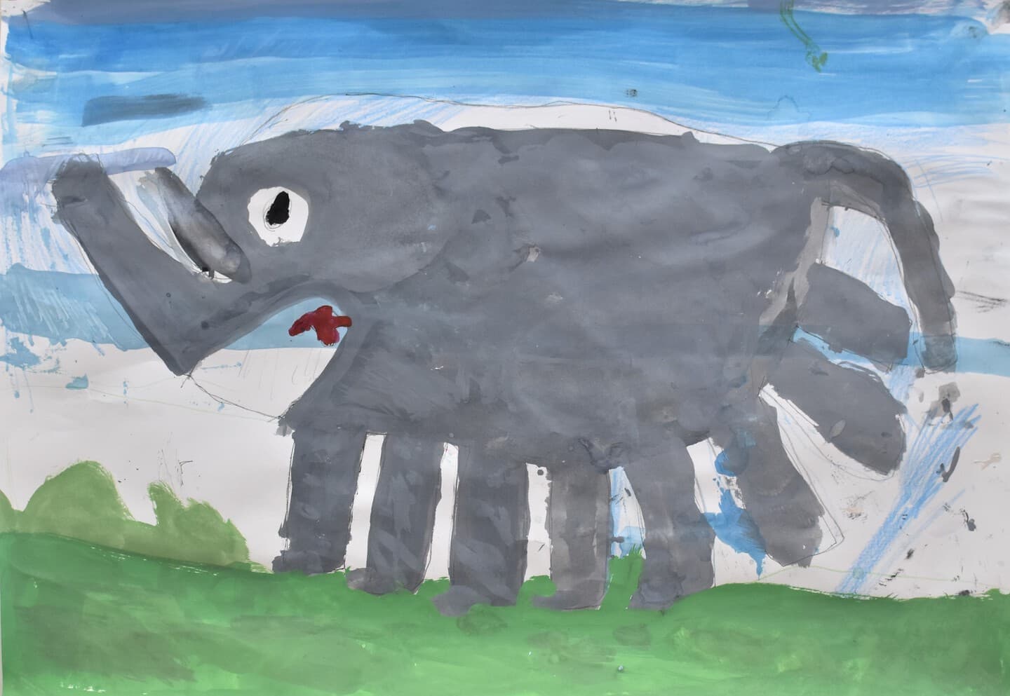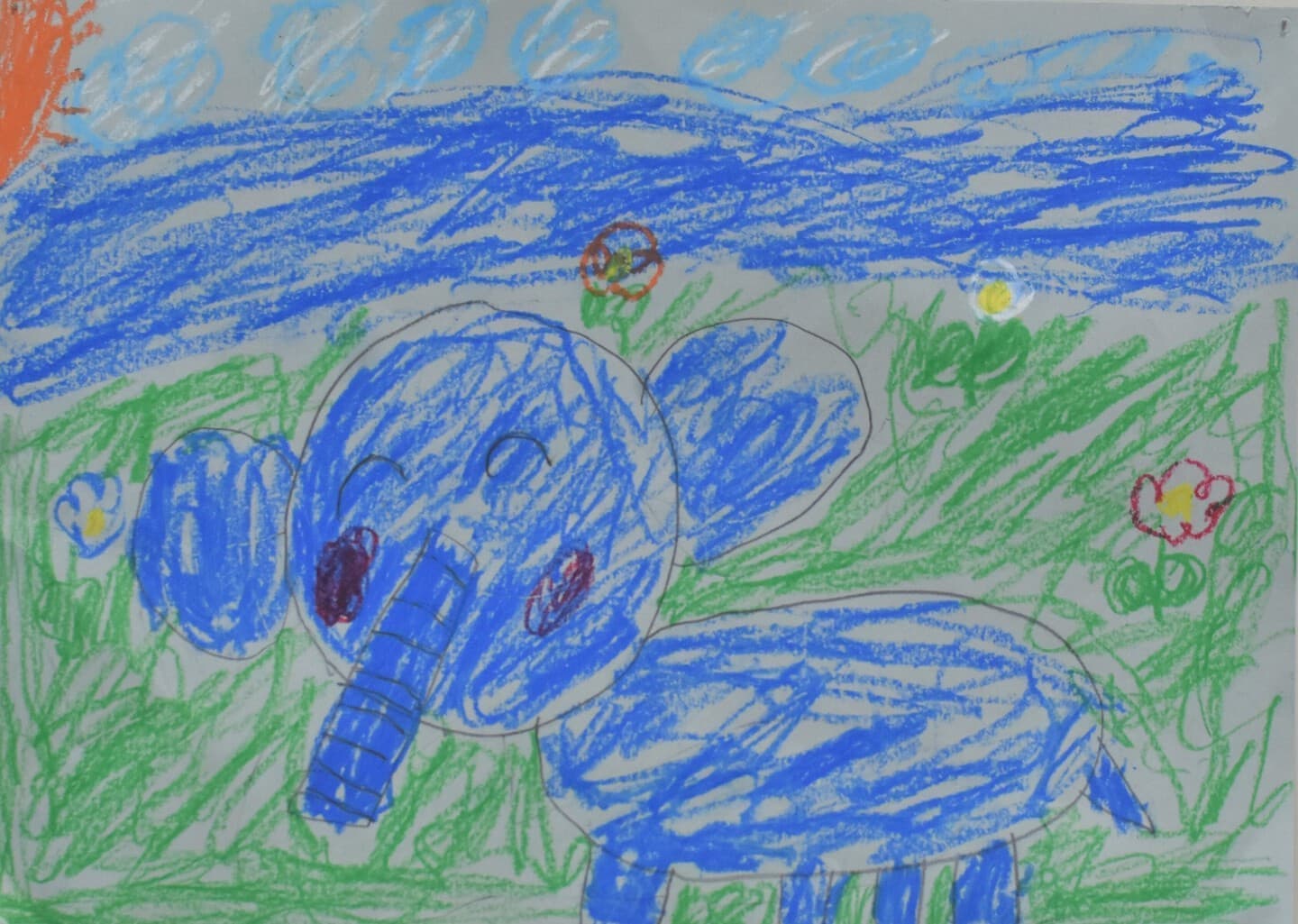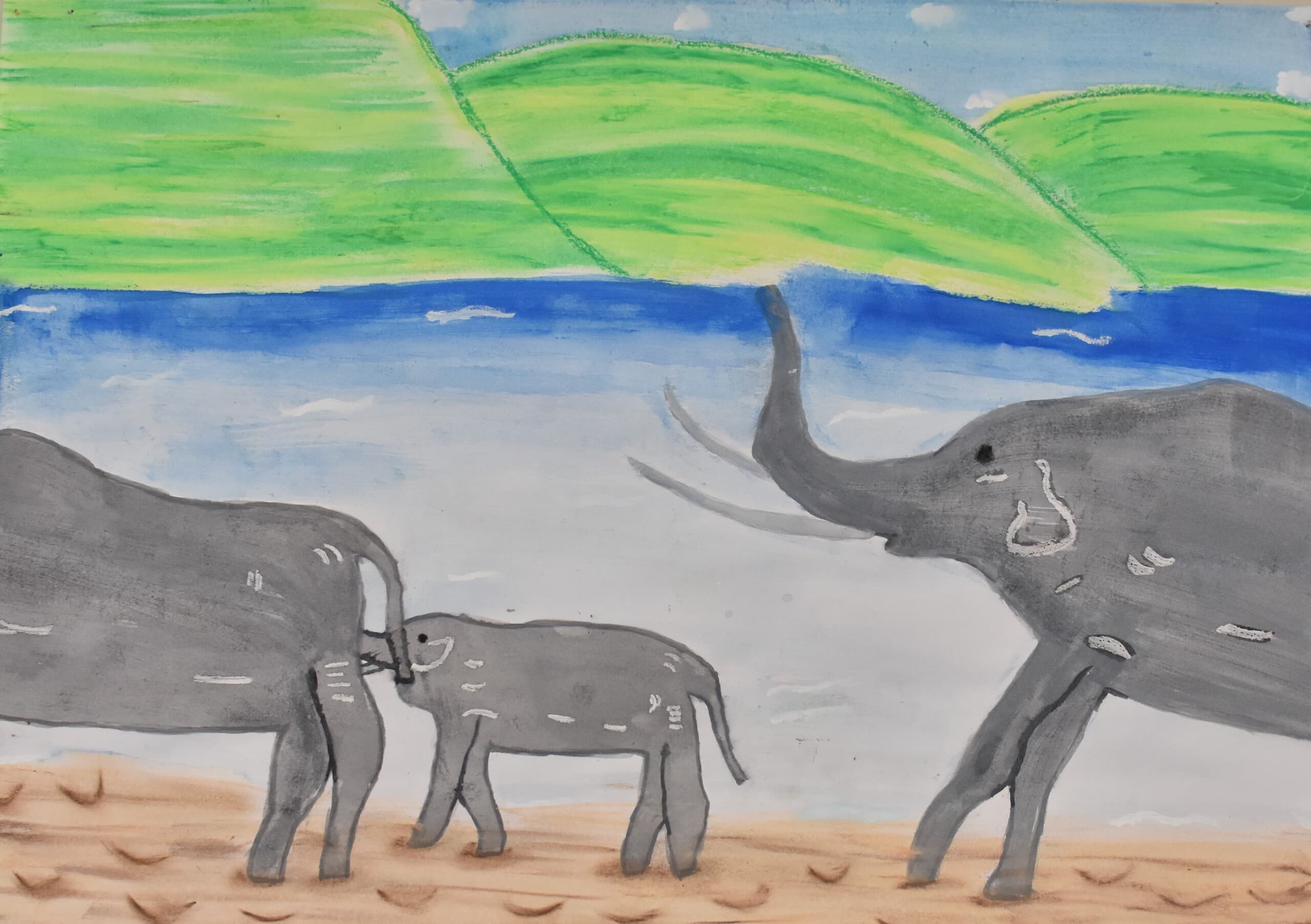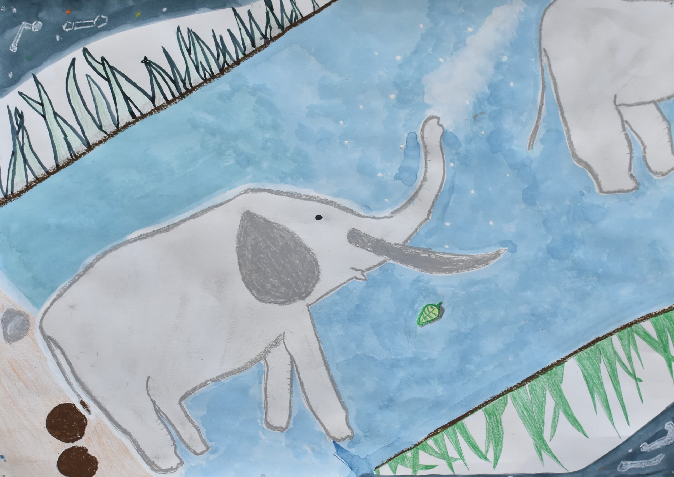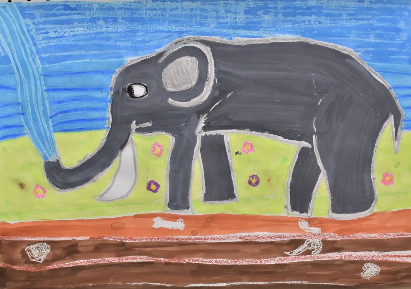 生きていたゾウをイメージしてクレヨンと絵の具を合わせて空も地面もいい色を絵の具で作って書いたのでそこを見てほしいです。ゾウの水の再現をクレヨンの線を指でこすって絵の具で塗ったところも見てほしいです。