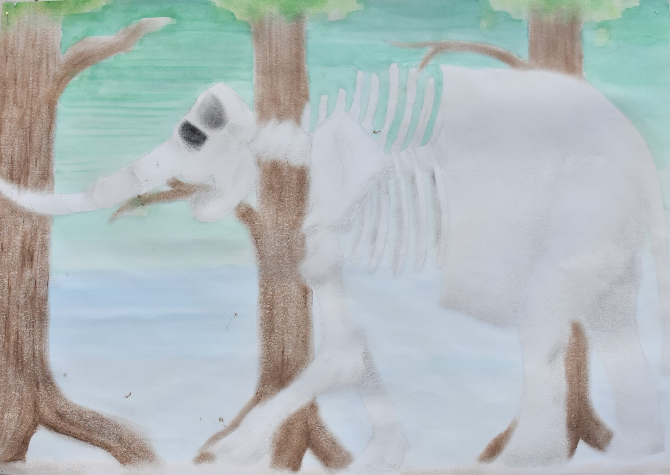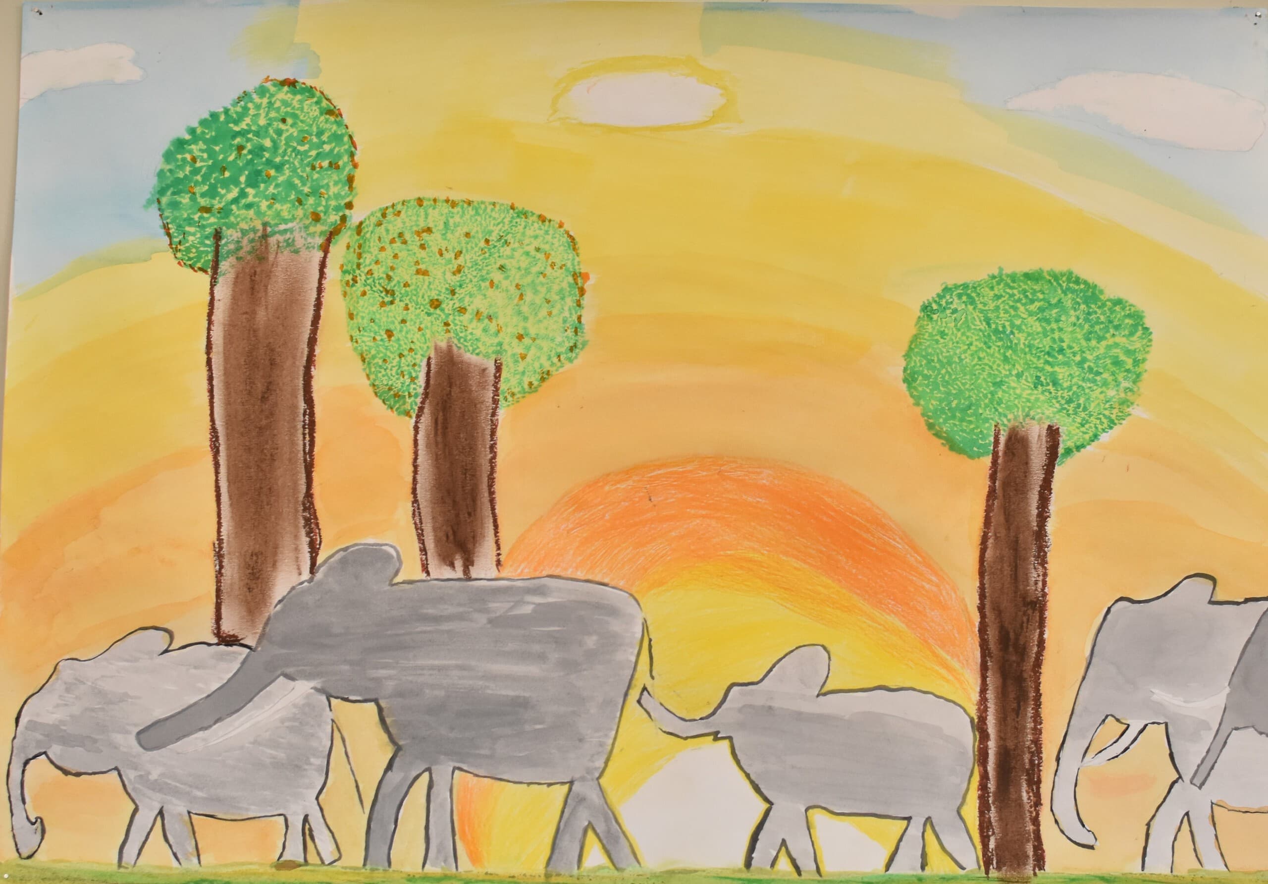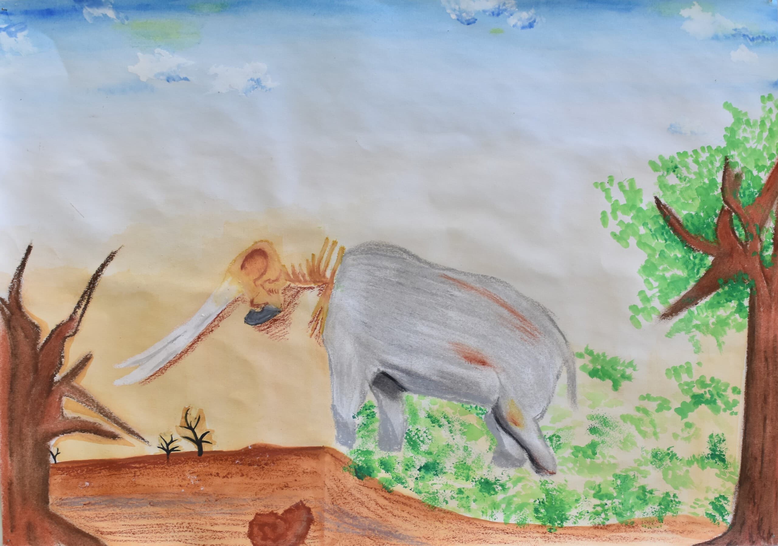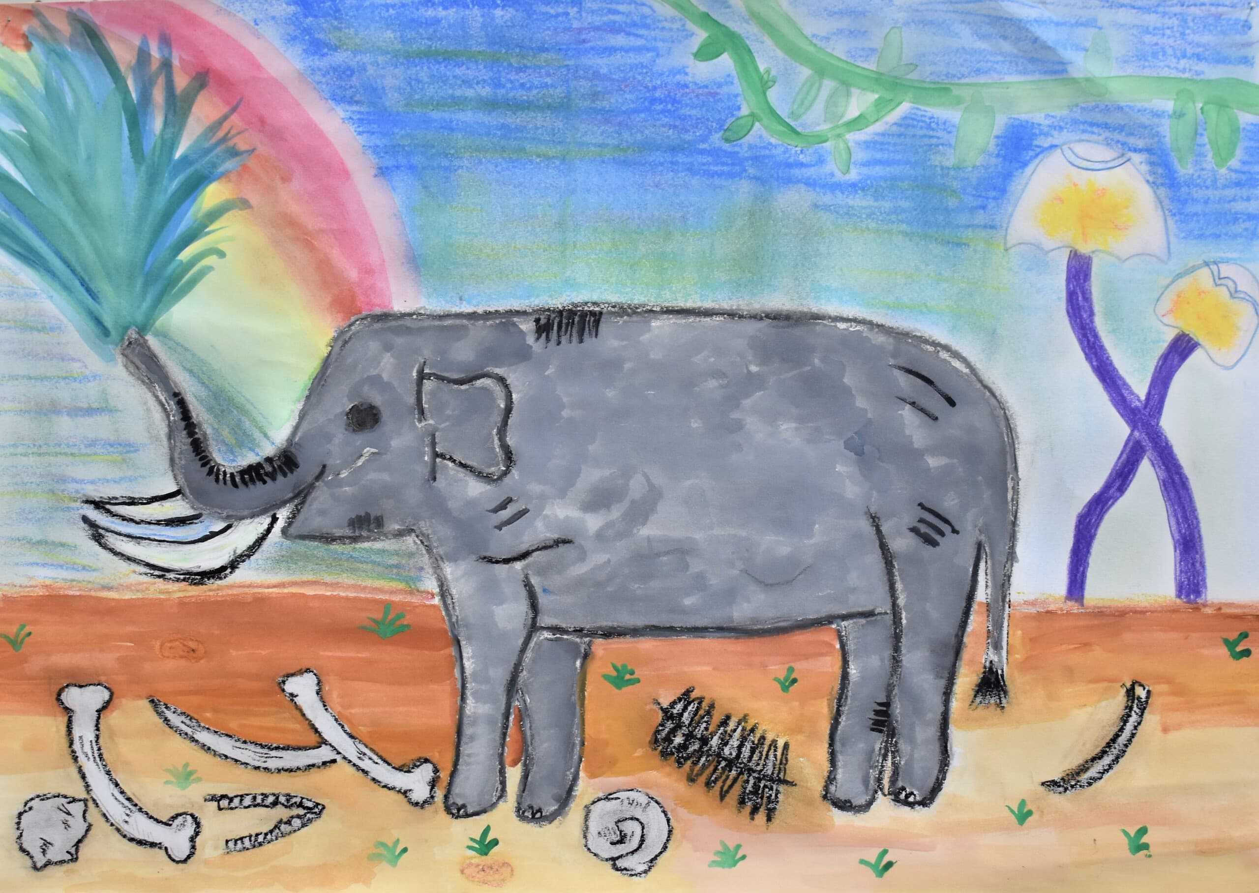 特に見て欲しい所は象の骨側です。白いだけじゃなくて、土がついている所をイメージして少し薄い黄色を付けました。木の部分は、クレパスで塗って、指で広げました。空のところも、グラデーションを使い、工夫して色を付けました。