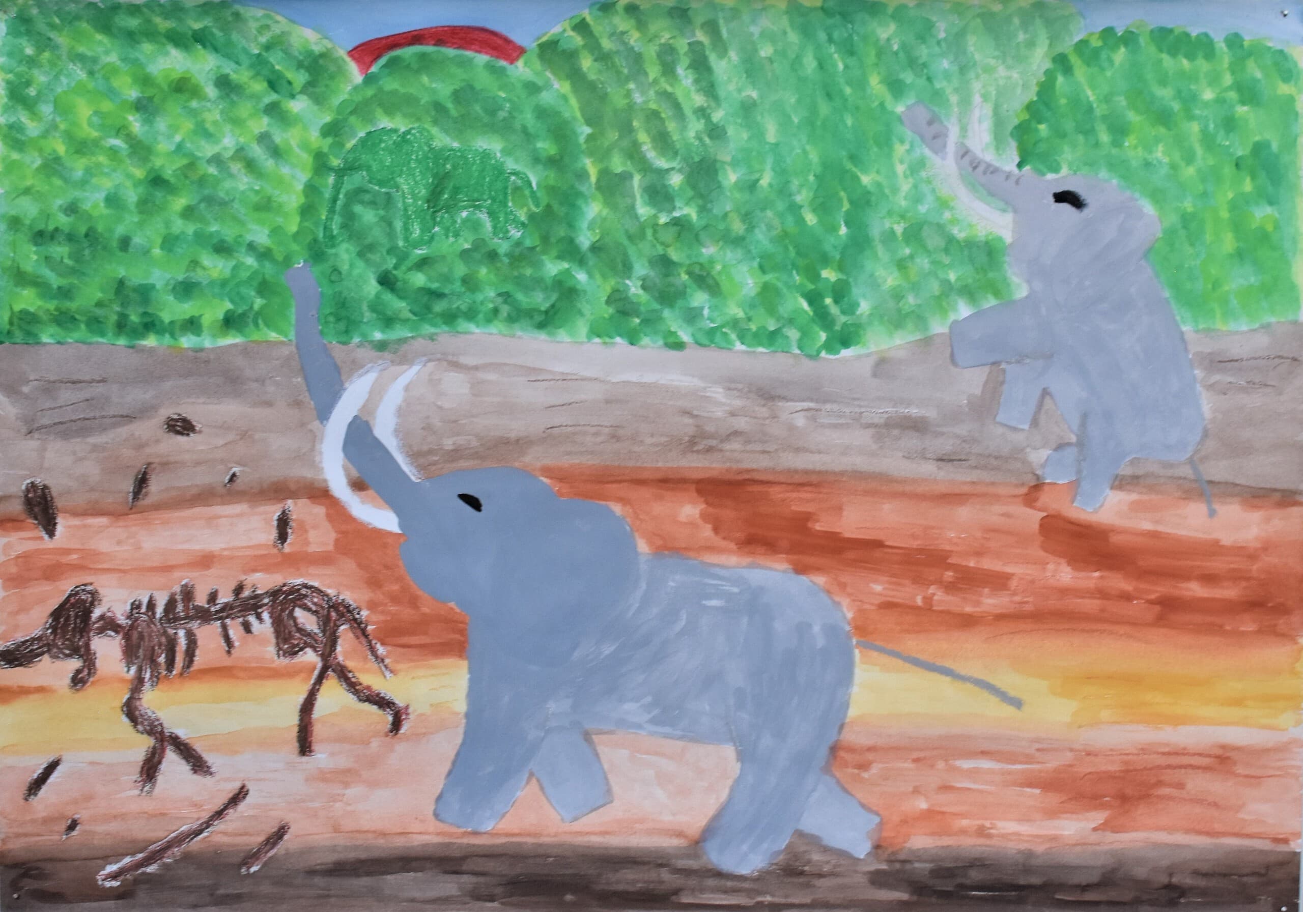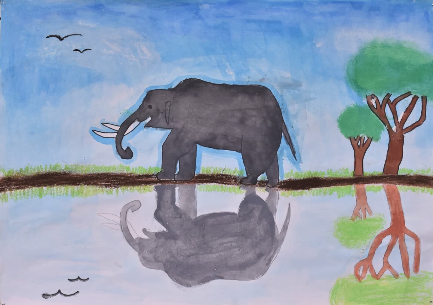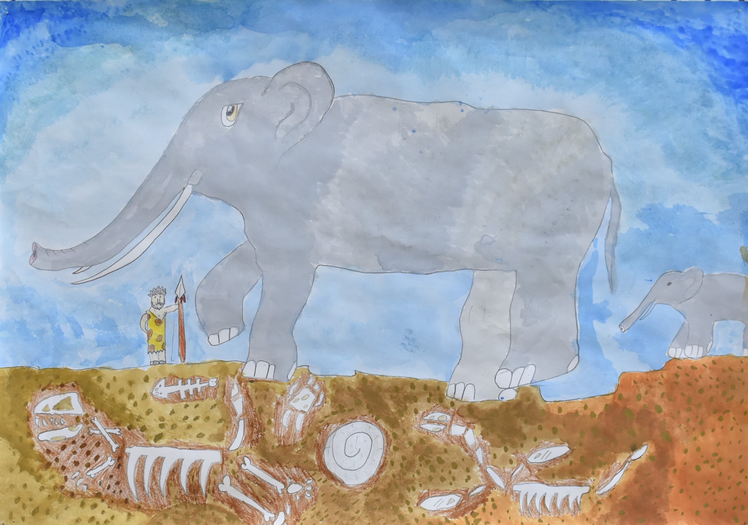 特に見て欲しい所は象の骨側です。白いだけじゃなくて、土がついている所をイメージして少し薄い黄色を付けました。木の部分は、クレパスで塗って、指で広げました。空のところも、グラデーションを使い、工夫して色を付けました。