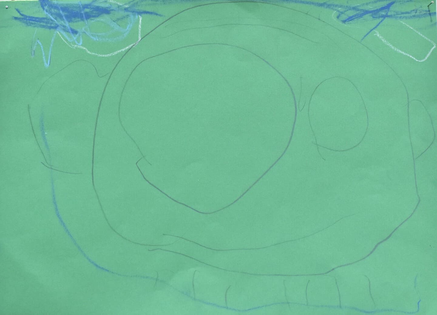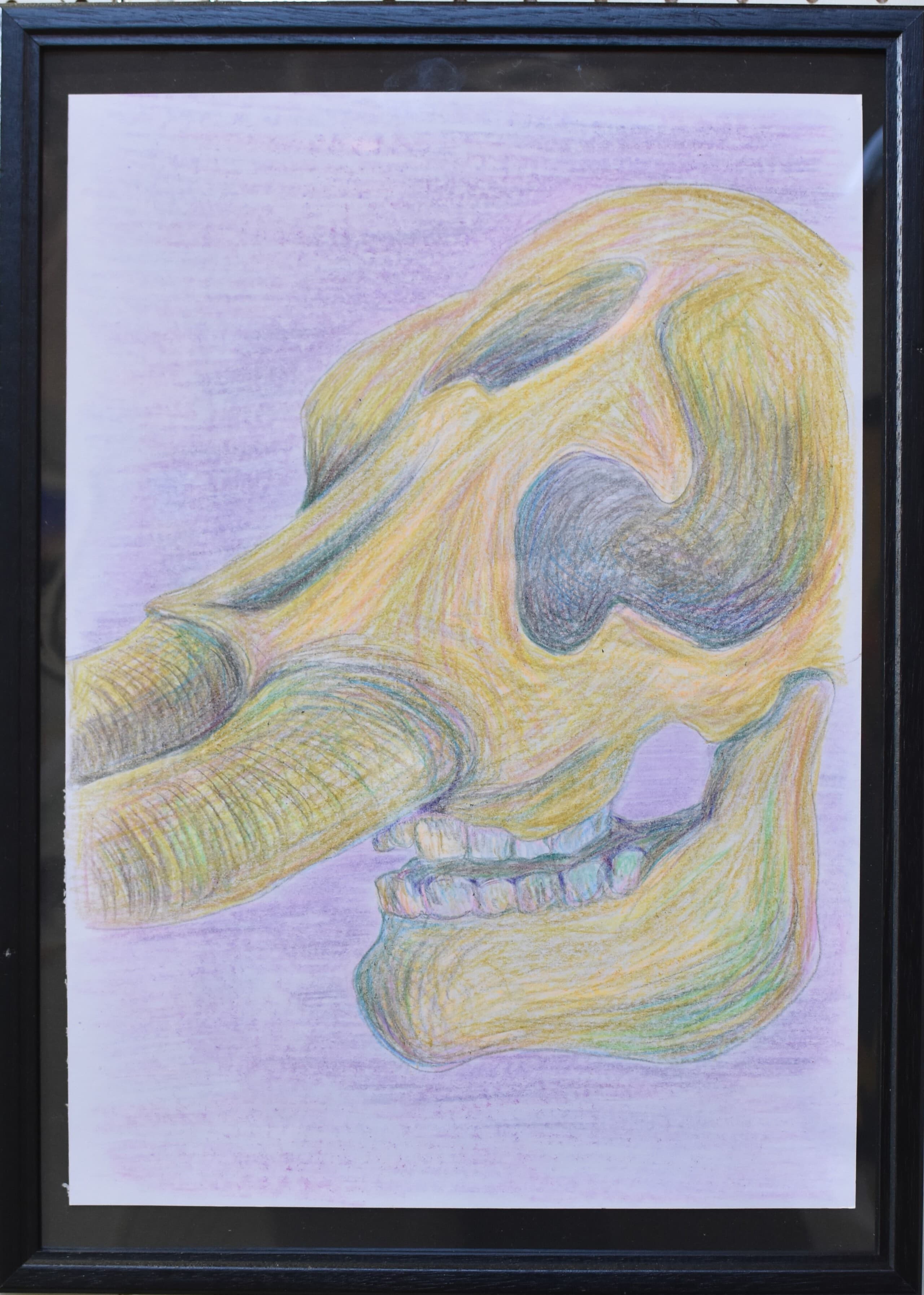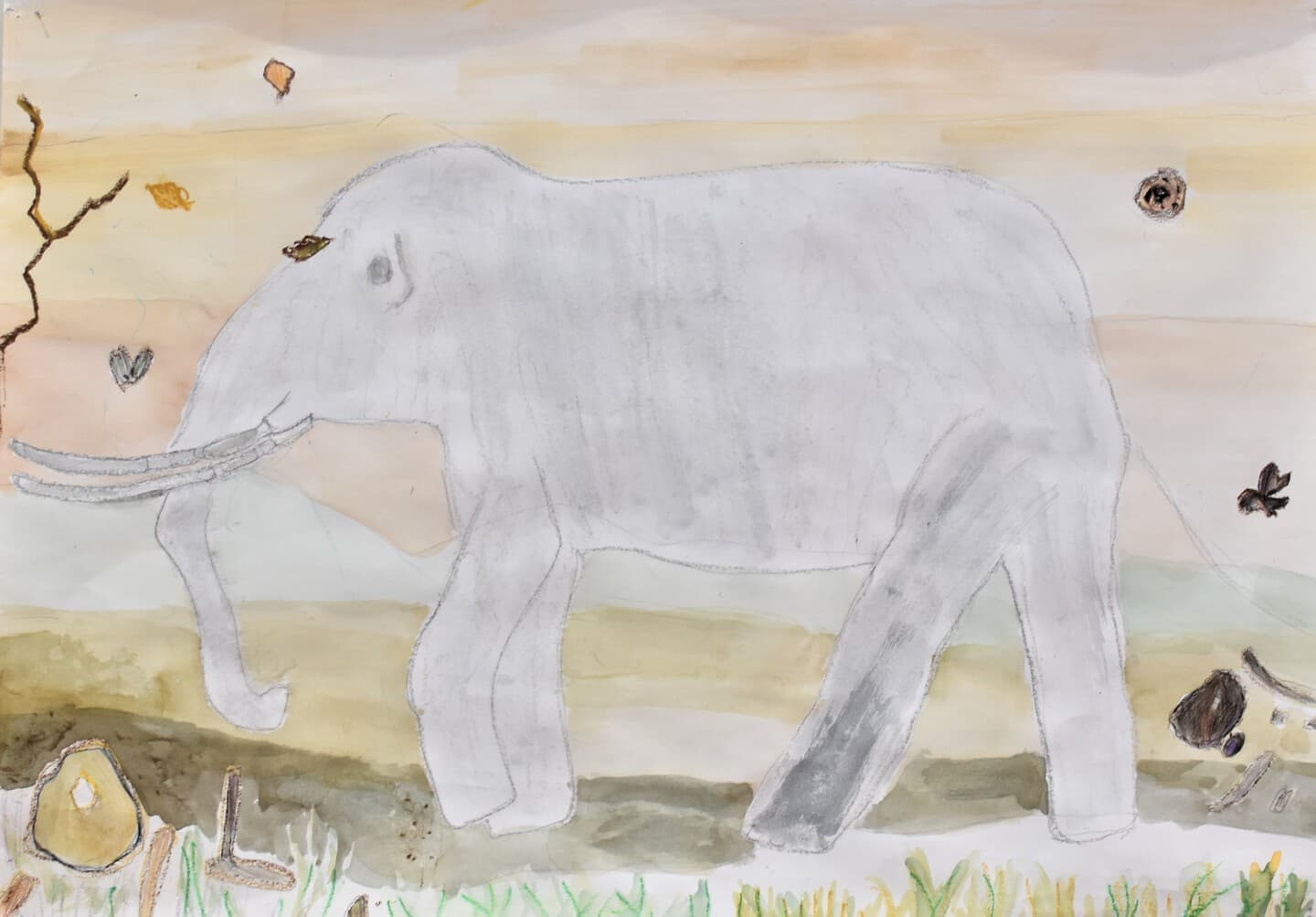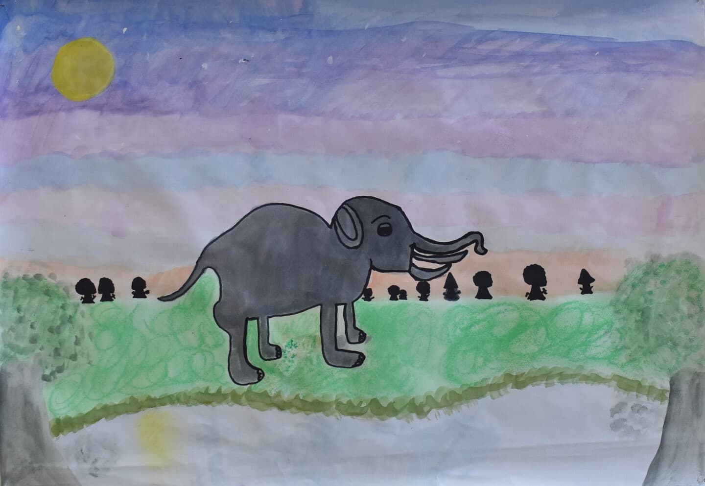 特に見て欲しい所は象の骨側です。白いだけじゃなくて、土がついている所をイメージして少し薄い黄色を付けました。木の部分は、クレパスで塗って、指で広げました。空のところも、グラデーションを使い、工夫して色を付けました。