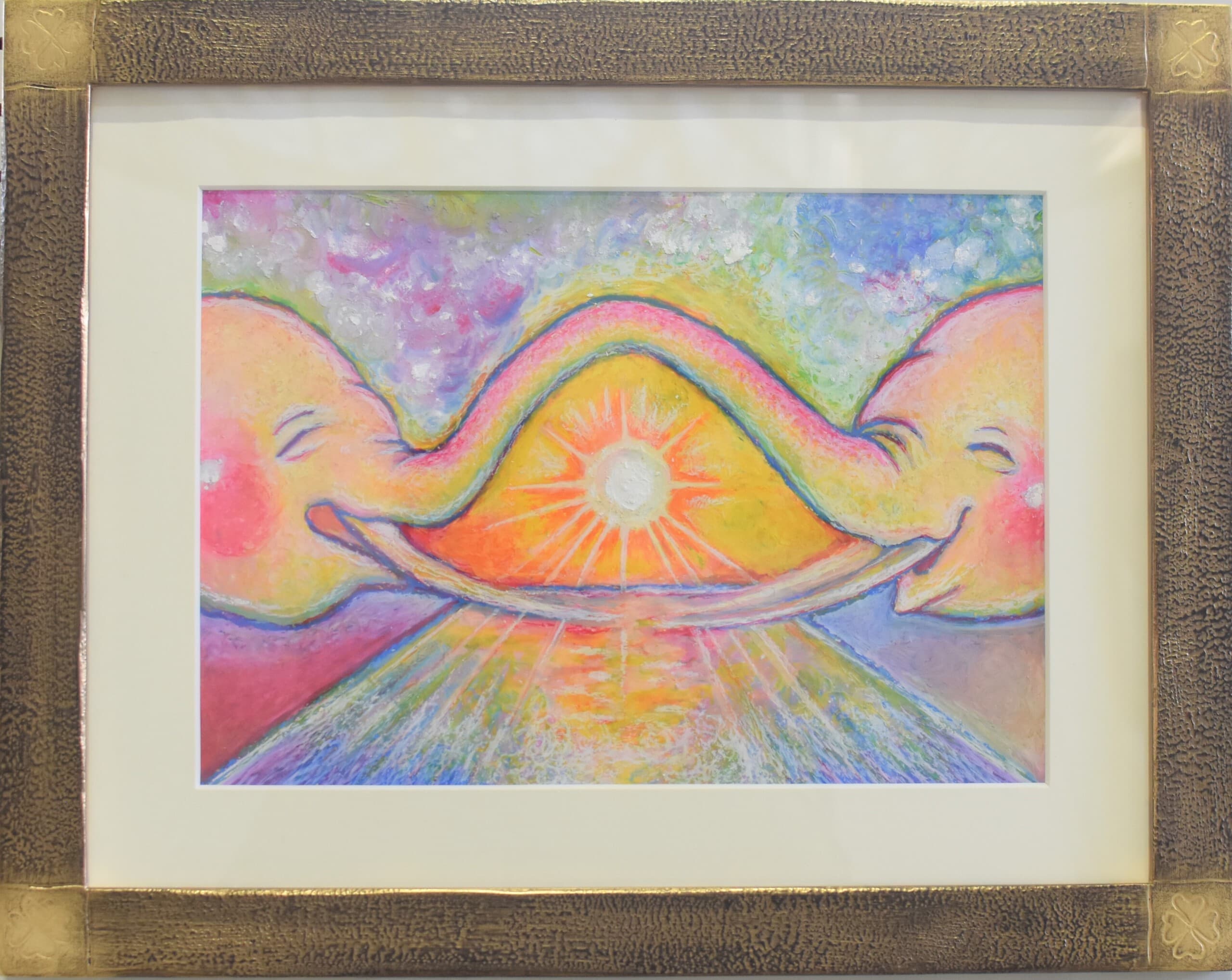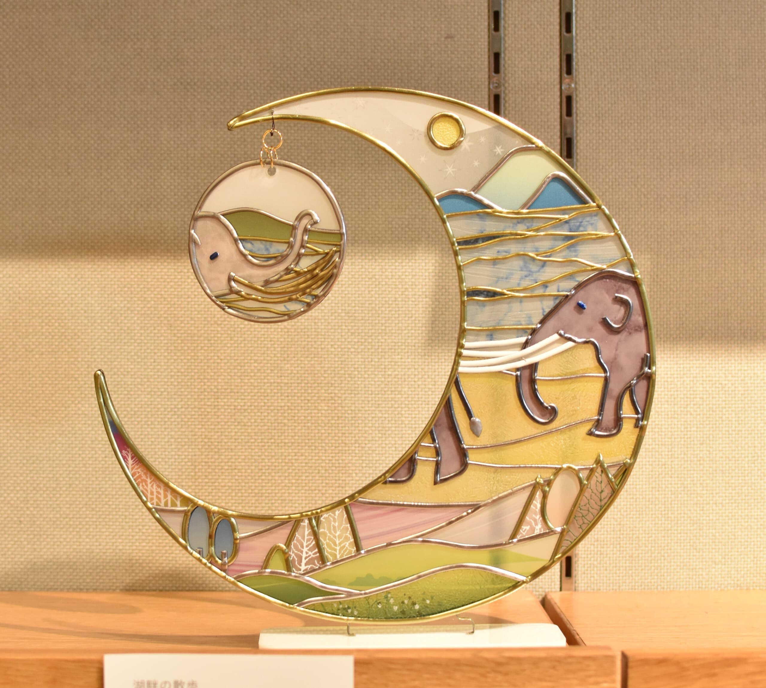 太古の森でアケボノゾウ同士が出会った。鬱蒼とした木々の中に見えた姿。ひとりぼっちじゃなかった!呼びかけてみよう。なんだかちょっと体の色も模様も違うけど、それはそれ、違ったって嬉しい。そんなシチュエーションをグラスアートで表現してみました。
