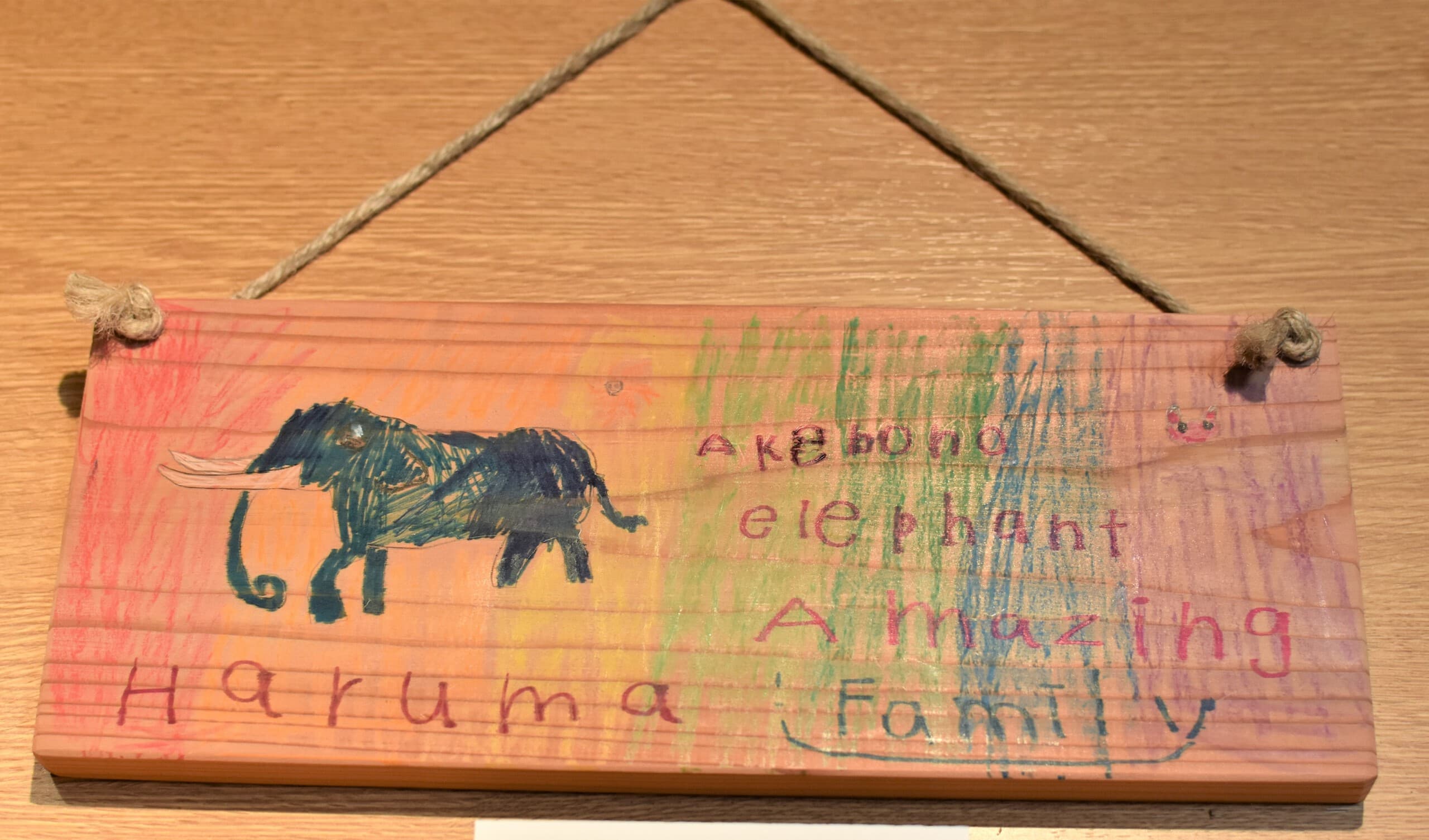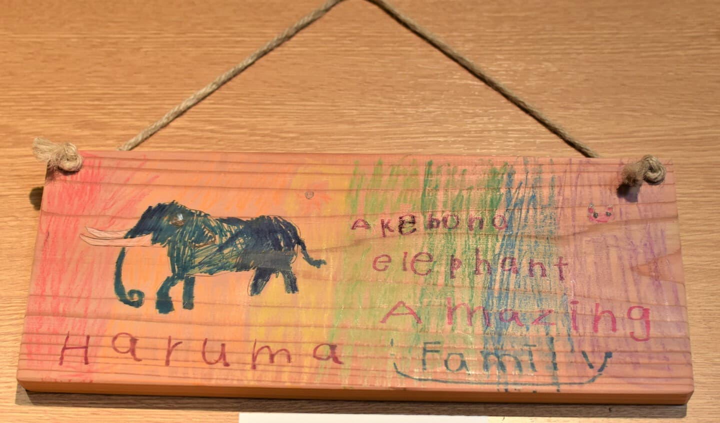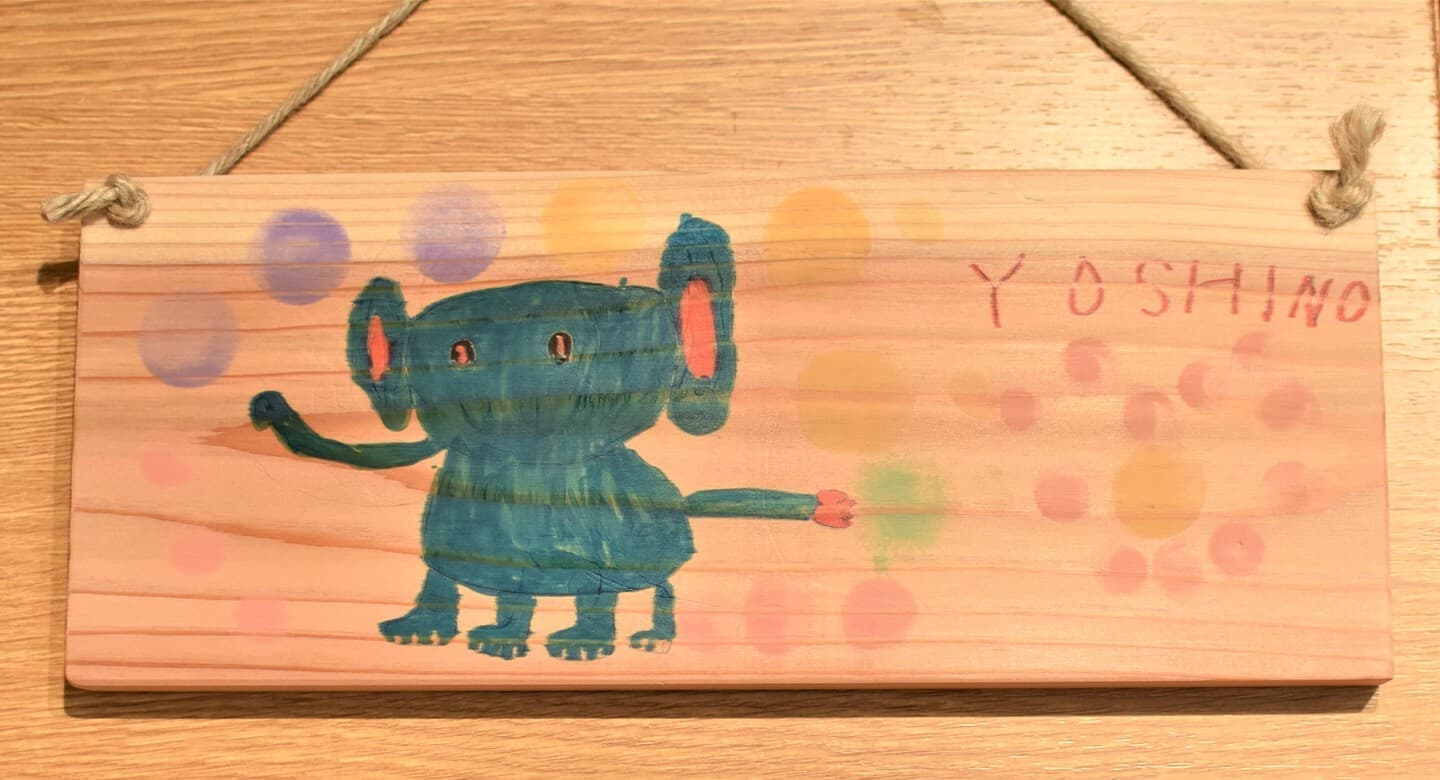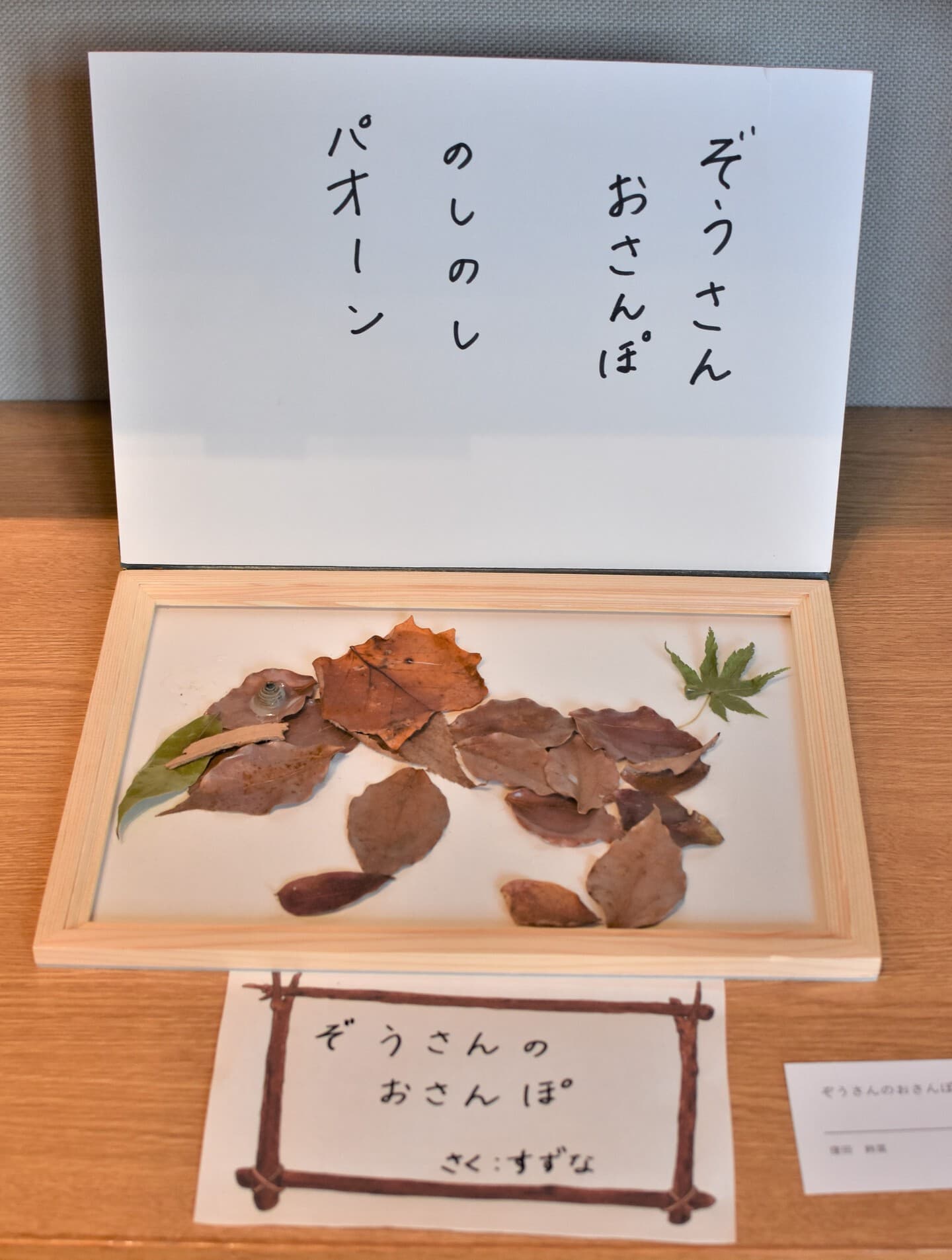 もうすぐ4歳になる娘と一緒に作りました。少し親が誘導しましたが、葉っぱの配置や出てきた言葉はほとんど娘が考えました。作品の最後にアケボノゾウの特徴の一つである長いキバをどれにするか、頑張って探して『これがいいね♫』と大満足で娘が決めました。どれがキバか見つけてもらえたら嬉しいです★