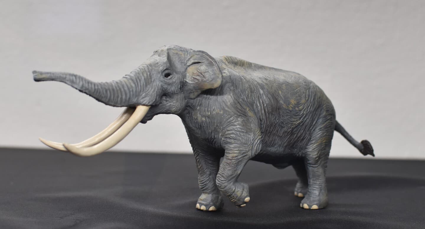 この模型は多賀町立博物館で所蔵されている復元骨格を元に製作しました。骨格の復元において問題点が指摘されている肩甲骨の位置と寛骨の角度はアジアゾウを参考にしました。寛骨の形状は不明である部分も多いため、今回はぼかした表現としています。また、頭部を持ちあげるため首の後ろに付いている筋肉は従来の復元よりも発達していたと仮定しました。足裏の形状は足跡化石などの資料から判断しました。今回の復元製作は多賀町立博物館の小早川隆館長と阿部勇治学芸員に資料と助言をいただきました。ここに心より御礼申しあげます。