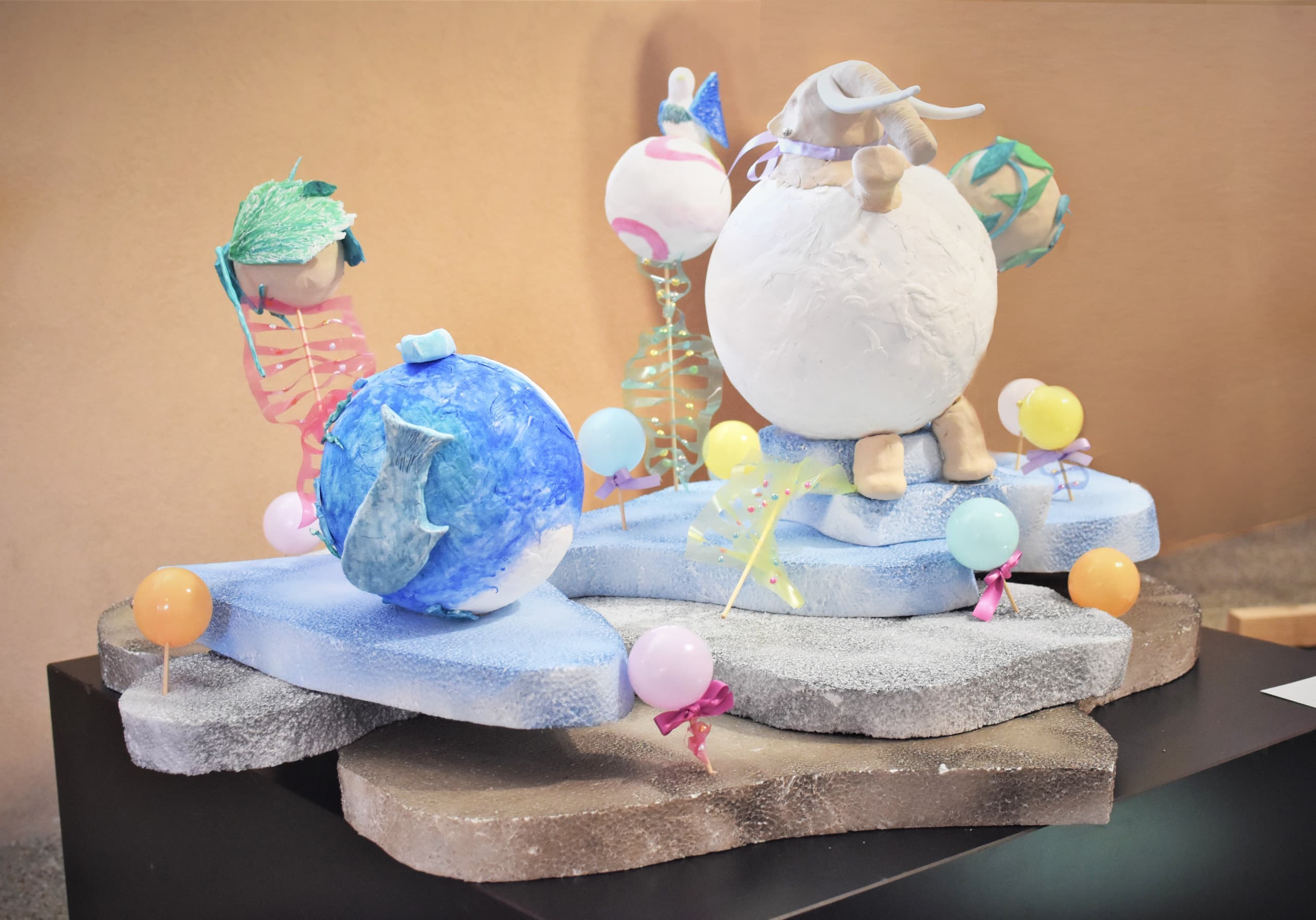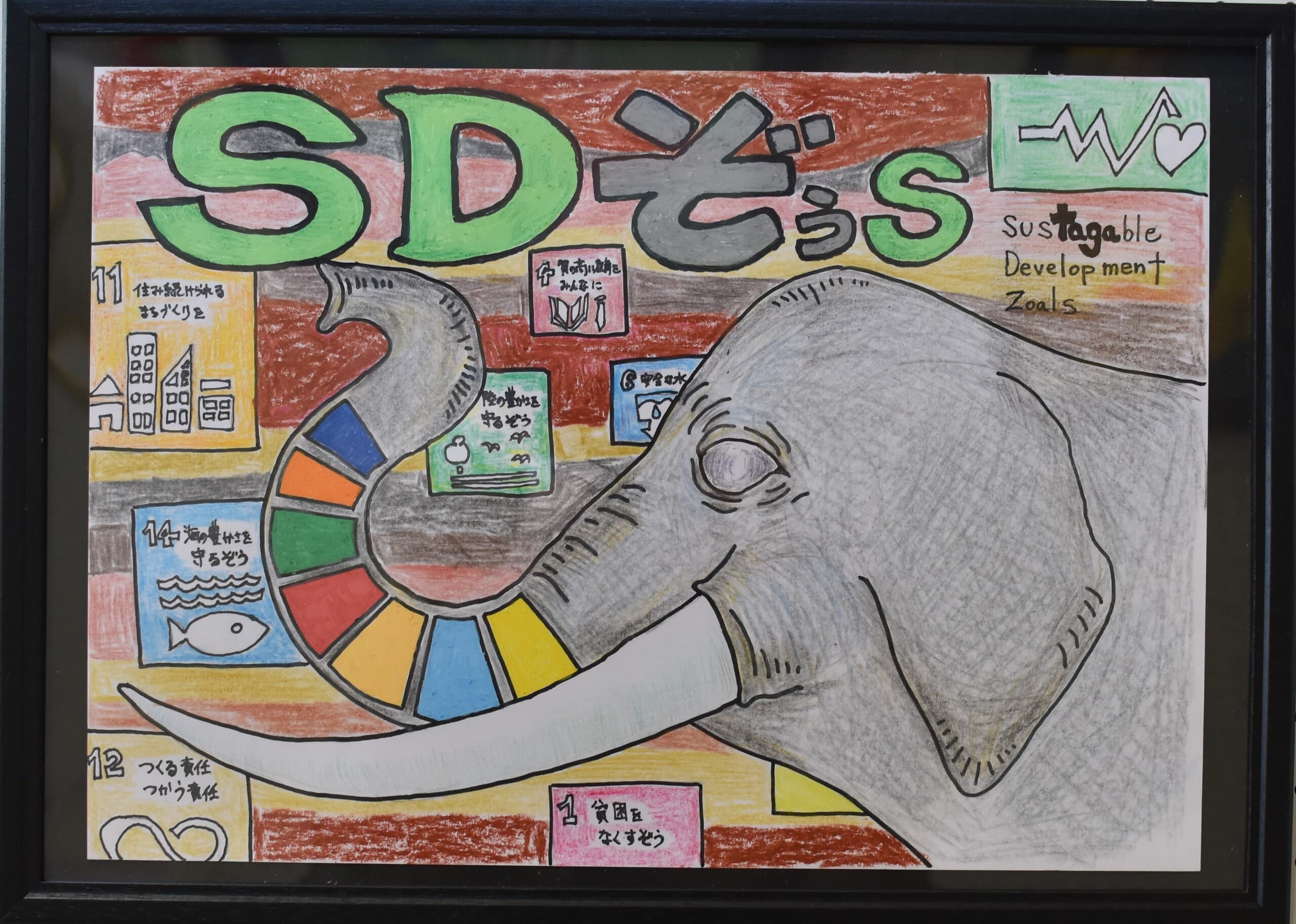地球温暖化の中で仲間が絶滅してしまうかもしれないと思い悲しんでいる目にしました。プラスチックなども入れて今学習している日本の環境や地層も表現したので見てほしいです。