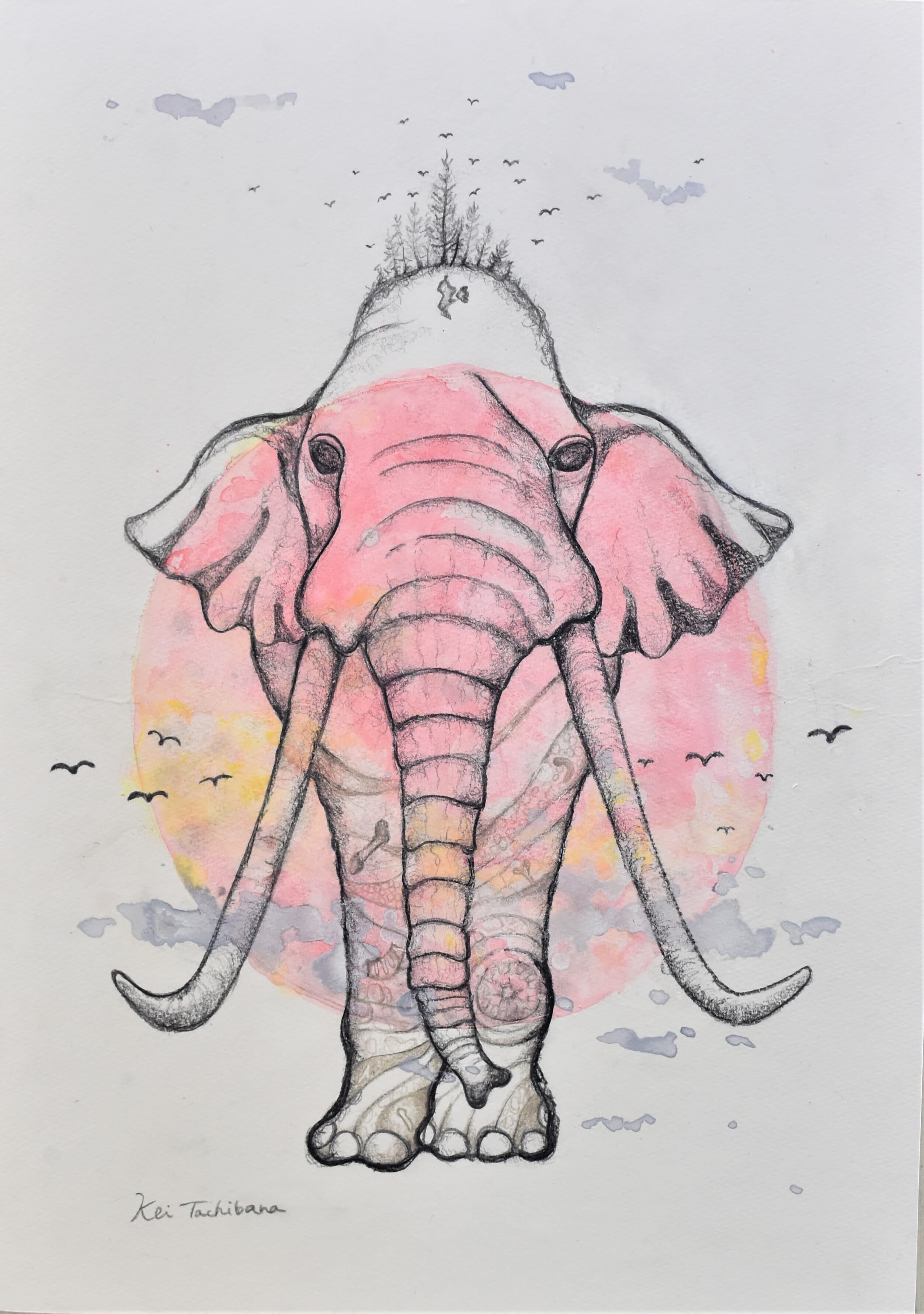 世界中の人が美しいと感じれるアケボノゾウを描き、多賀アケボノゾウのアイコンとして世界中に発信するきっかけを目指して制作しました。