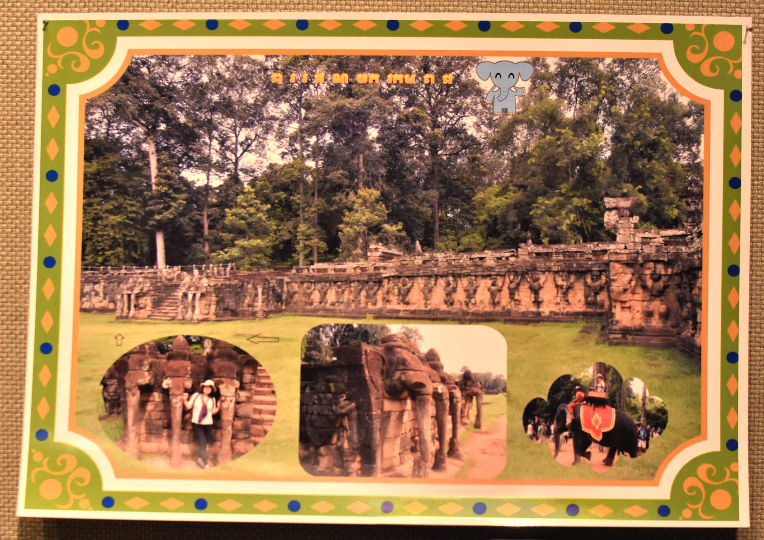 多賀小学校の「小さな写真館」というコーナーに毎月テーマを決めて、自らが撮影した写真を掲示し、その写真に関わるクイズをしています。アケボノゾウ天然記念物認定に伴い、展示した写真『象のテラス』の説明文の中に使った写真です。テラスは南北約300mにわたり、カンボジアにある遺跡アンコール・トム王宮の塔門に隣接しています。東面にあるゾウの彫刻にちなんで「象のテラス」と名づけられました。テラスは、12世紀末にクメール王により建造され、軍隊を眺望する基壇として使われました。象はカンボジアの人の生活に昔から欠かせない動物として大切にされてきました。アンコール・ワット遺跡の数々は、象によって運ばれた岩から造られました。現在、カンボジアに生息する象の数は激減しており、少数民族プノン族の協力のもとで、象を保護する活動が行われています。
