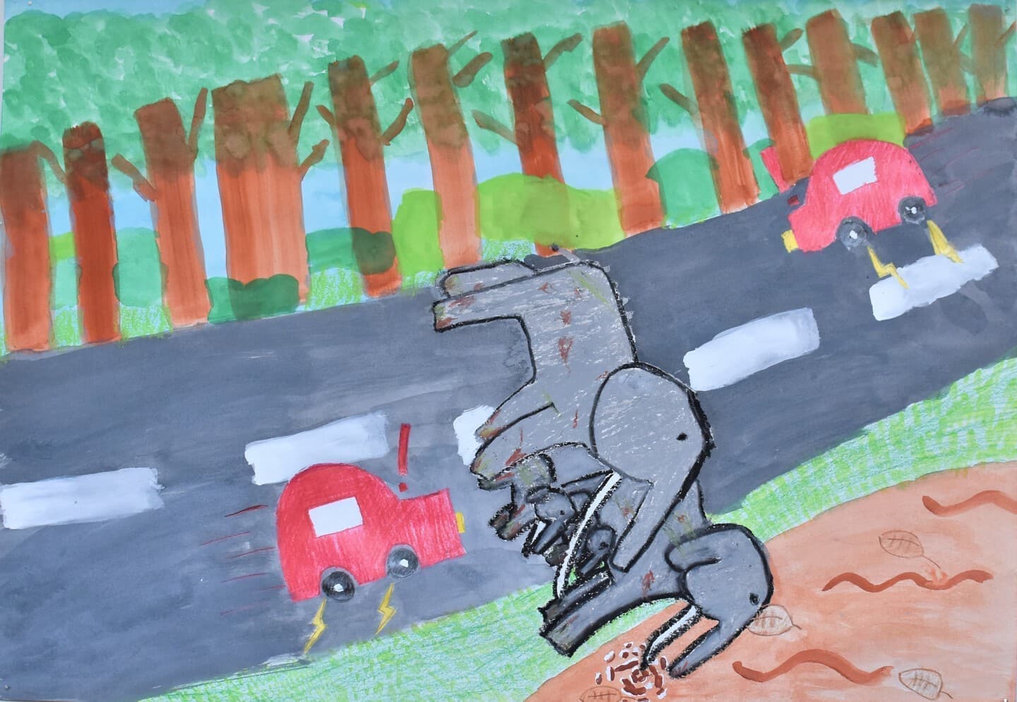 ぼくが、作った作品はもしもアケボノゾウがいたら世界がどうなっているかを考えて作りました。ぼくが考えたのは、アケボノゾウが道路を横断して車に乗っている人が驚いている様子を表現しました。アケボノゾウの泥のつき方や、草のつき方を見てほしいです。