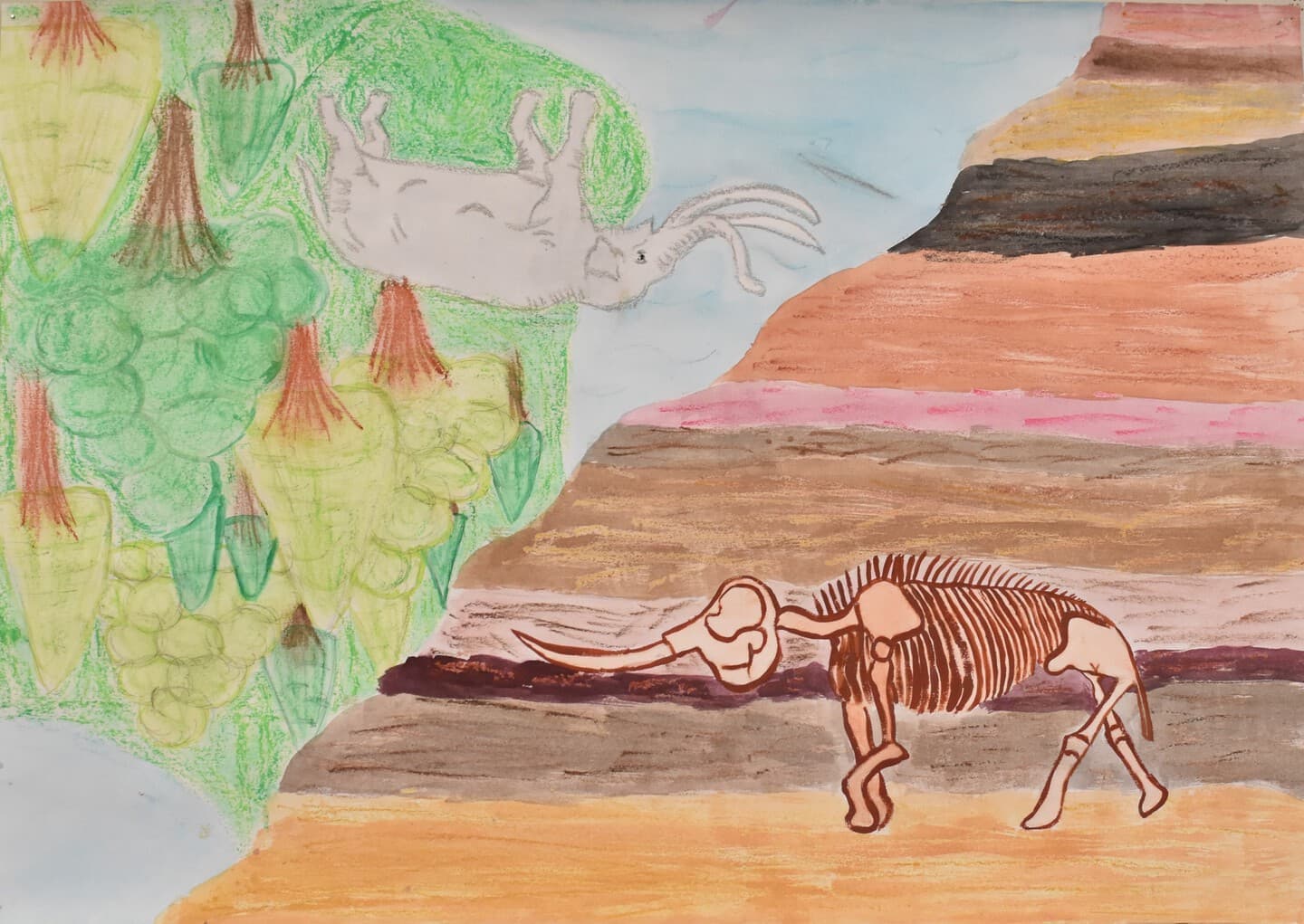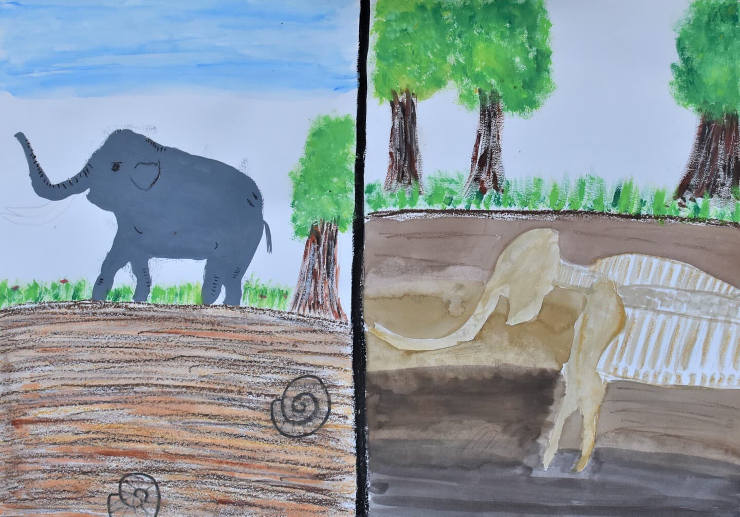 あけぼのぞうがいた頃と、化石になった今の様子を絵で表しました。見てほしいところは、地層です。習ったことを生かしてかきました。化石はあえてきれいに塗るのではなく、上から何回もぬって濃くしたり、すこし隙間をつくるなどより化石に見えるように工夫しました。あけぼのぞうが居た頃の地面の中にはアンモナイト化石もかいて大昔ということを表現しました。