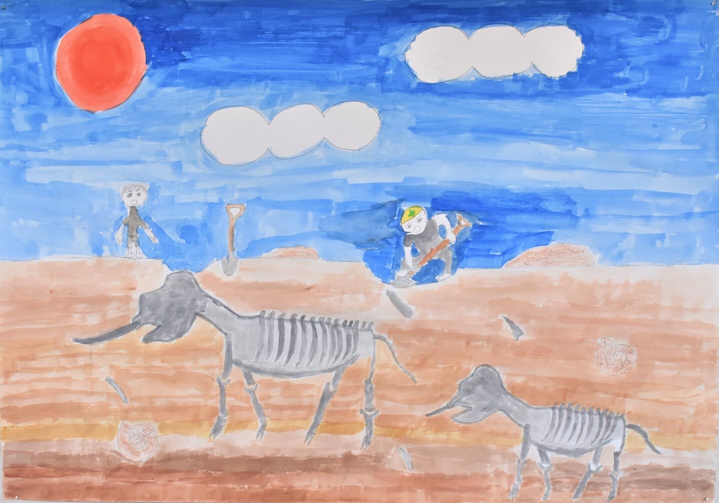 実際に発掘体験をしてみて、土の質感や骨の色などが良く分かりそのおかげで作品もよりリアルになりました。だから、土の色や骨の傷をよく見てほしいです。私の作品は化石が土の中に実際に眠っていたことから、土の中の様子を絵で表現しました。その形のまま見つかっていたら、すごいなと思ったので想像で書きました。