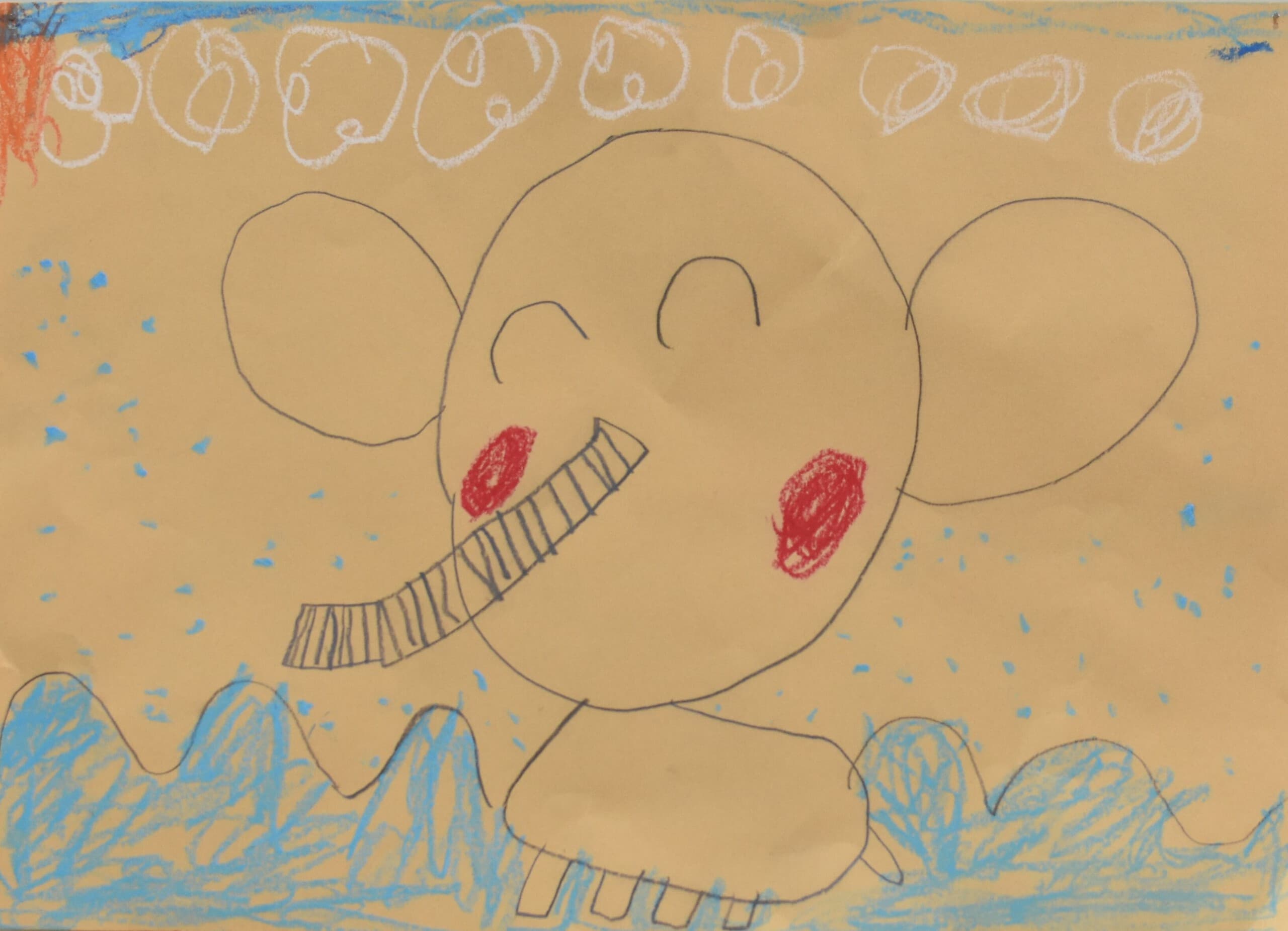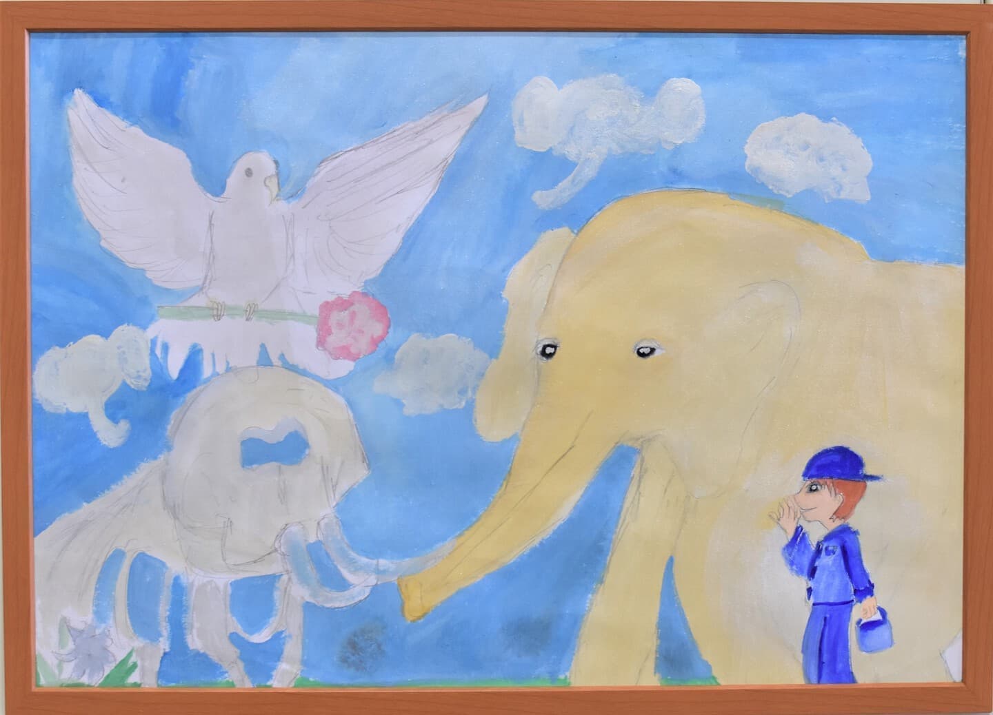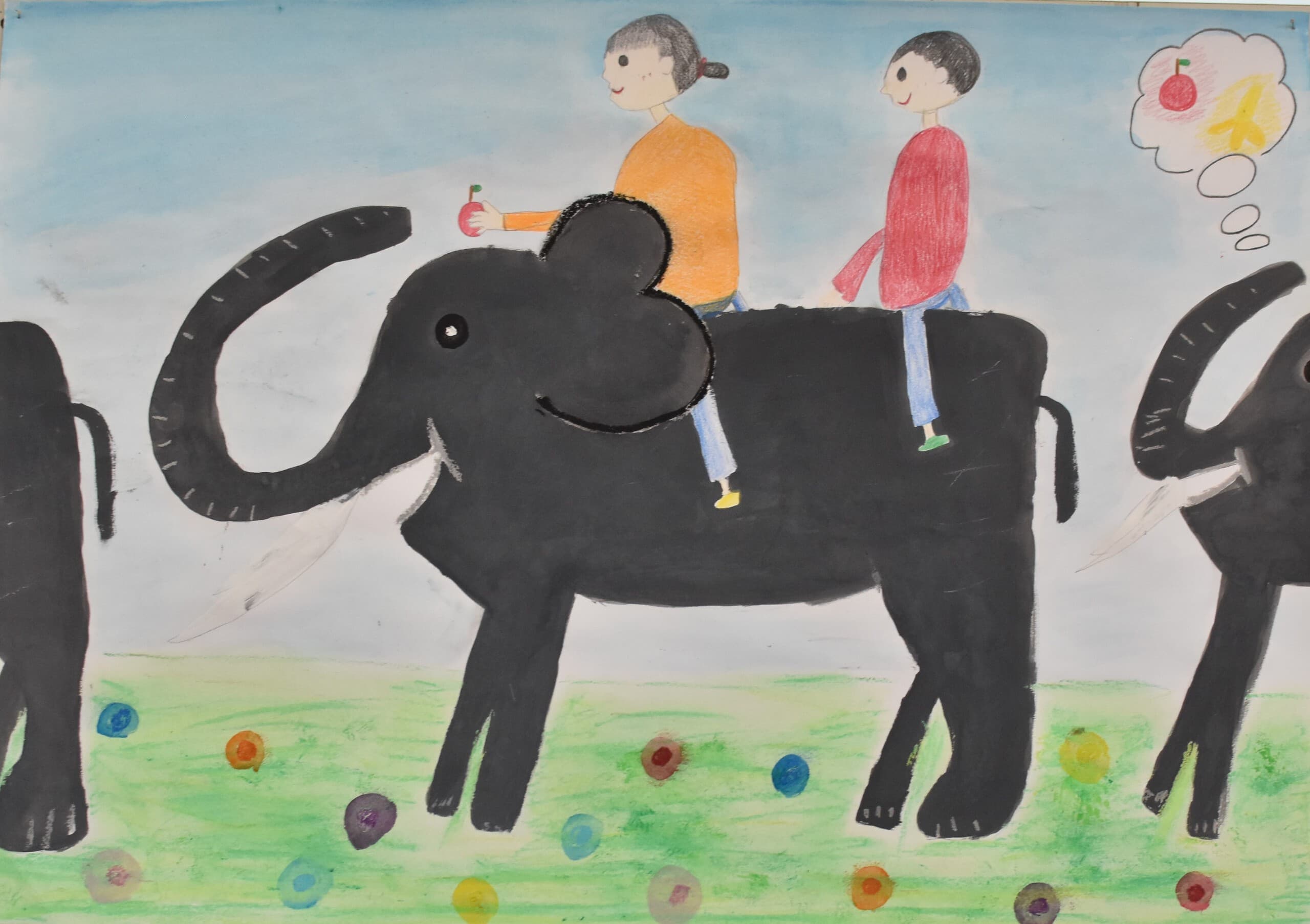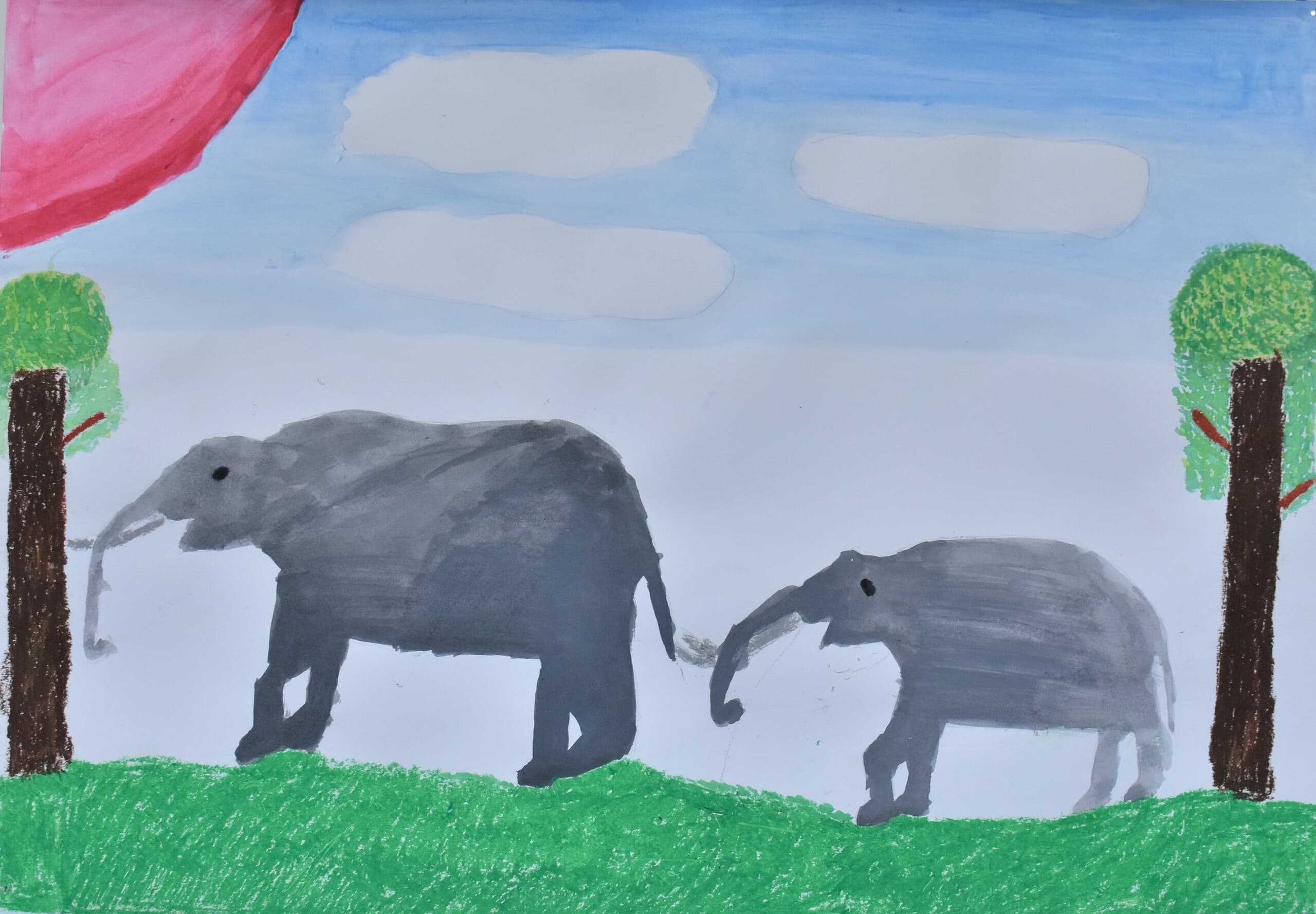 ぞうが大きすぎないように、逆に小さくならないように工夫して描いた。色も自分で作ったりして、描きました。使ったのは、絵の具とクレパスです。クレパスでは、雲を描きました。それ以外のぞうや、土などは、絵の具で描きました。