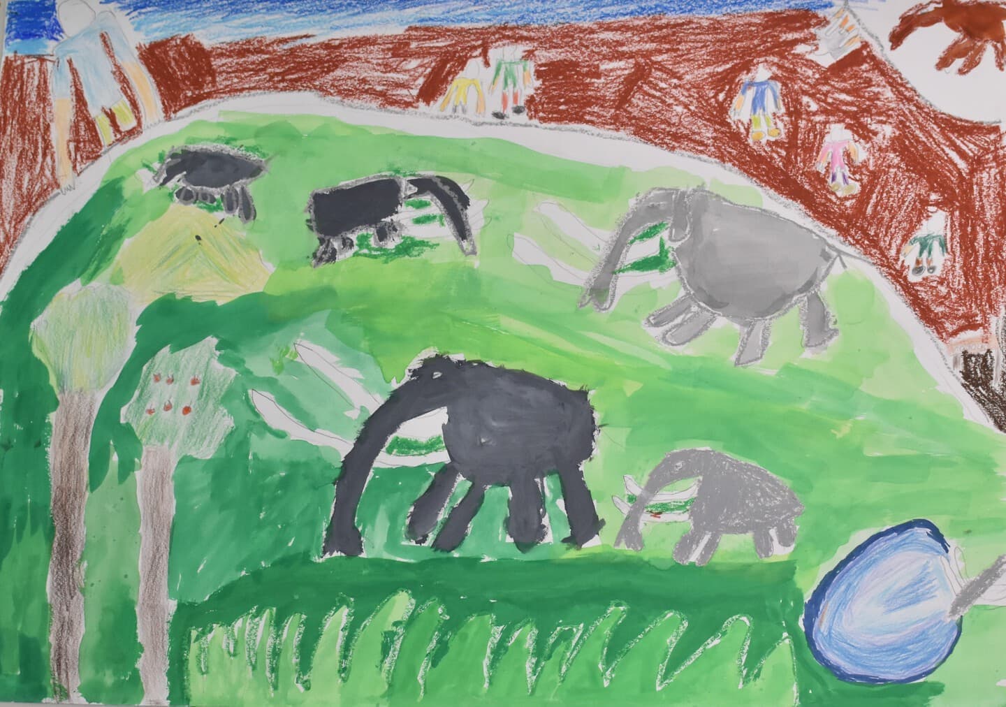 自分がこんな感じにした理由はもしも、今もアケボノゾウがいきていたら、動物園に入っていそうだったのでこんな感じの絵にしました。みてほしいところは一番デカい象です。なぜかというと、その象を一番デカくし動物園のなかのアケボノゾウの主みたいにしたのでそこをみてほしいです。