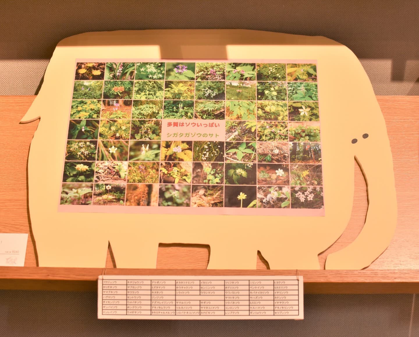 ミクストメディアによるインスタレーション。シガタガゾウの鼻とダウン症の子ども(D.よしひろ)の作品やおもちゃ、本を展示。想像上の象に思いを馳せながら私たちの日常からアプローチしたドリーミーな小さな旅。