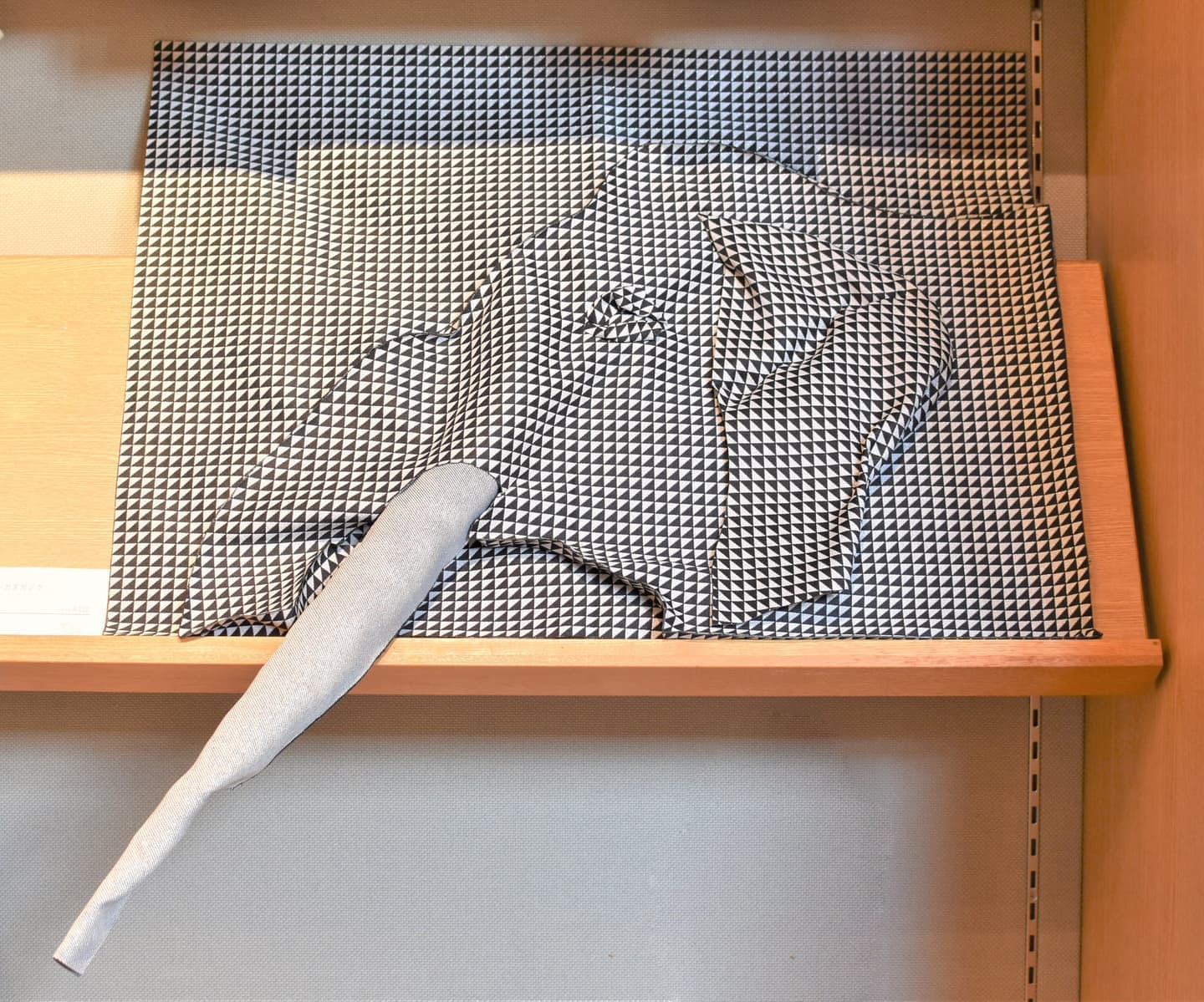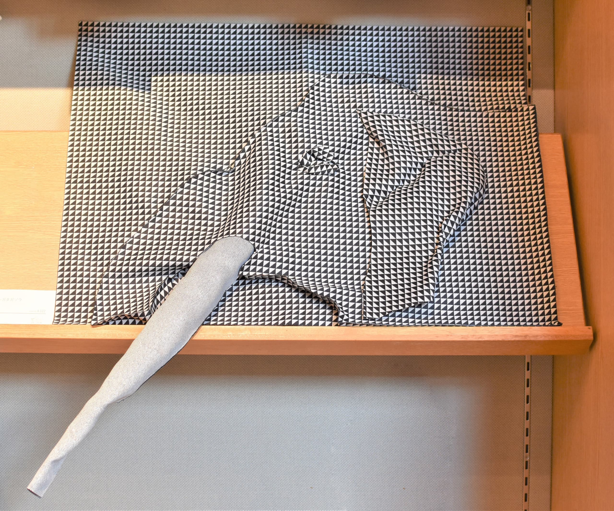 幼少期より象が大好きです。今ジャガード織物を作り、その織物で作品を作って発表しています。大好きな象が日本にいた、それも自分の住んでいる関西にいたということを知り感激でした。このアート展を教えて頂き、是非いつも作っているジャガード織物で象を作ってみたいと思いました。出てきた骨や歯からシガタガゾウの姿がだんだん見えてきた様子を白と黒の生地で表現しました。今私の知っている象とどこか違ってたのか、同じようにゆったりと多賀を歩いていたのか、そんなことを思いながら楽しく作りました。
