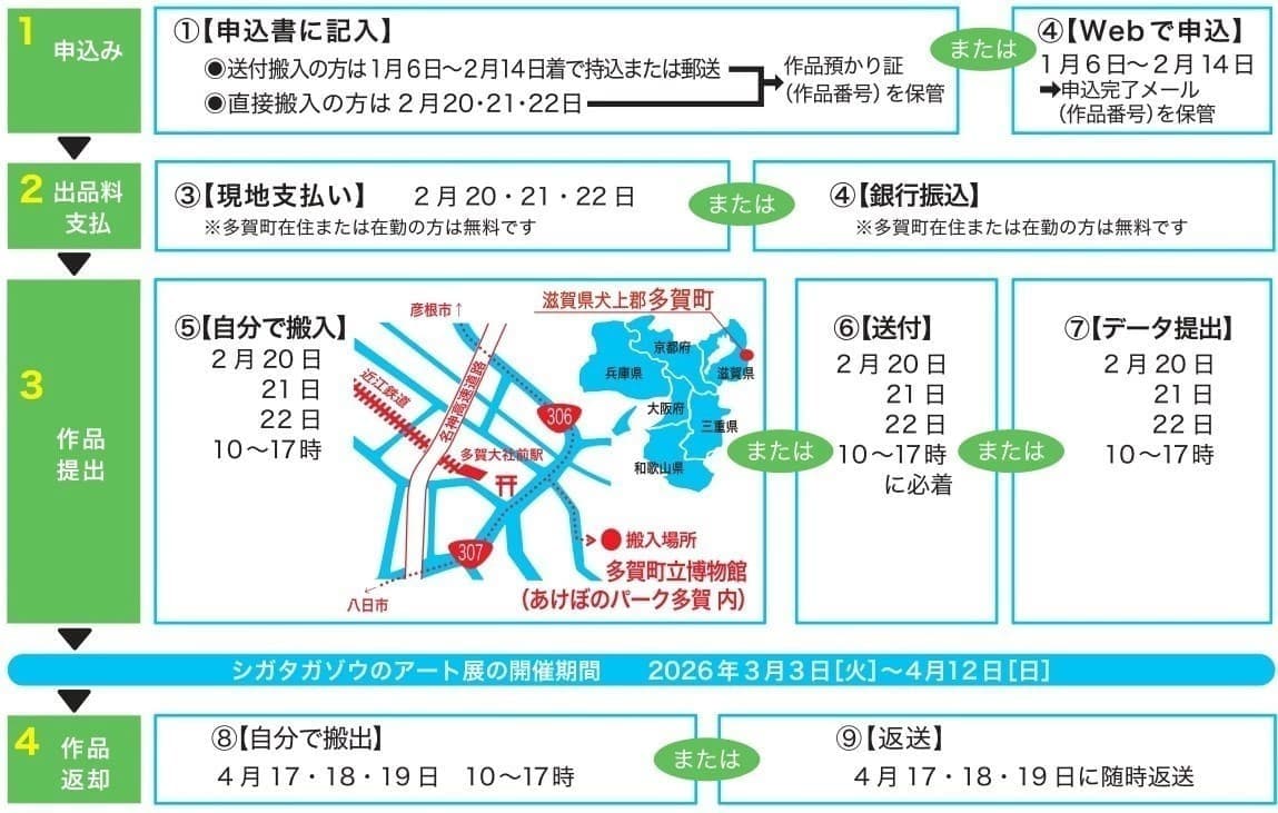 ⑧【自分で搬出】上記期間内に多賀町立博物館まで取りに来てください。本人確認のため「作品預かり証」または「作品番号」のご提示もお願いします。
