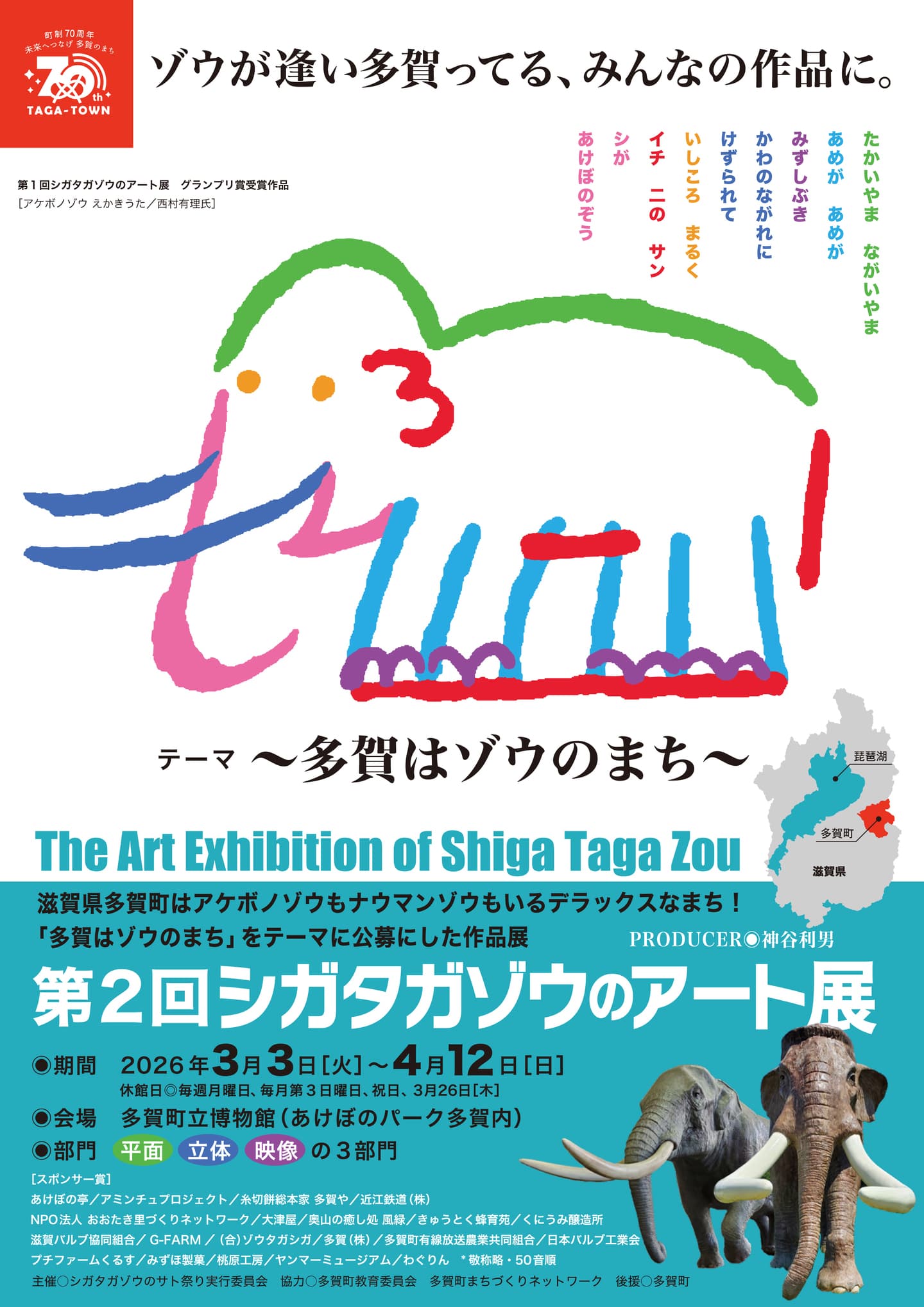 このたび第2回シガタガゾウのアート展が、町制70周年を記念して開催されることを大変喜んでおります。「多賀はゾウのまち」であることを全国に発信できるすばらしいアート展になりました。