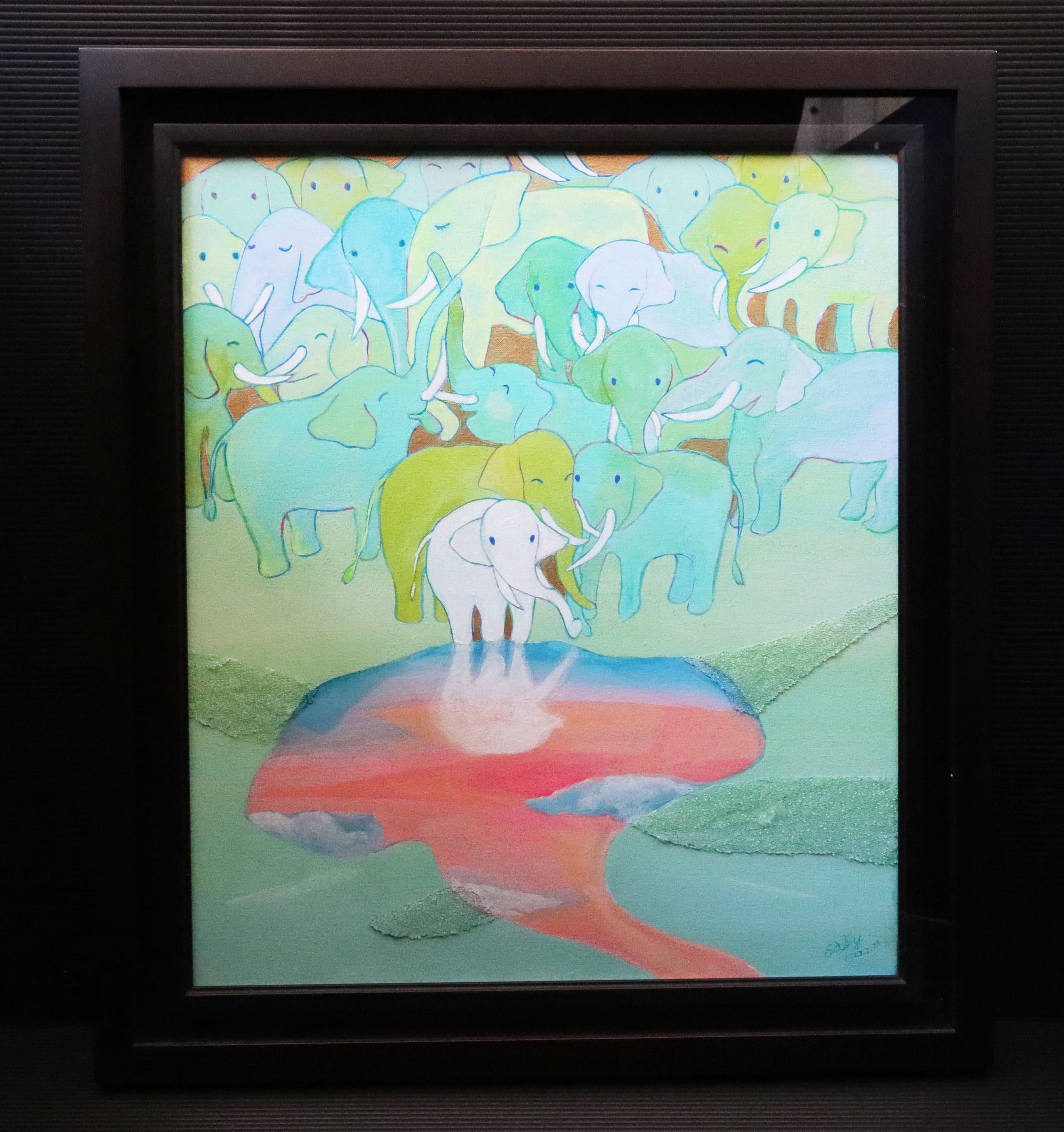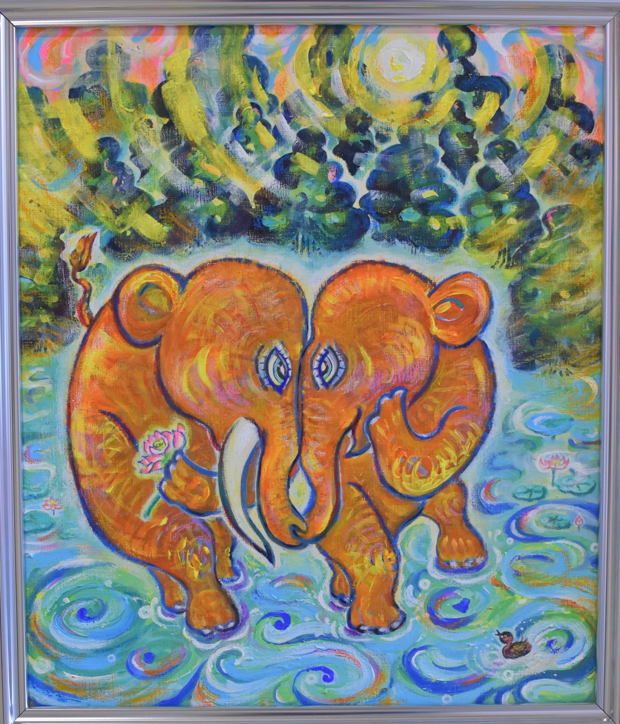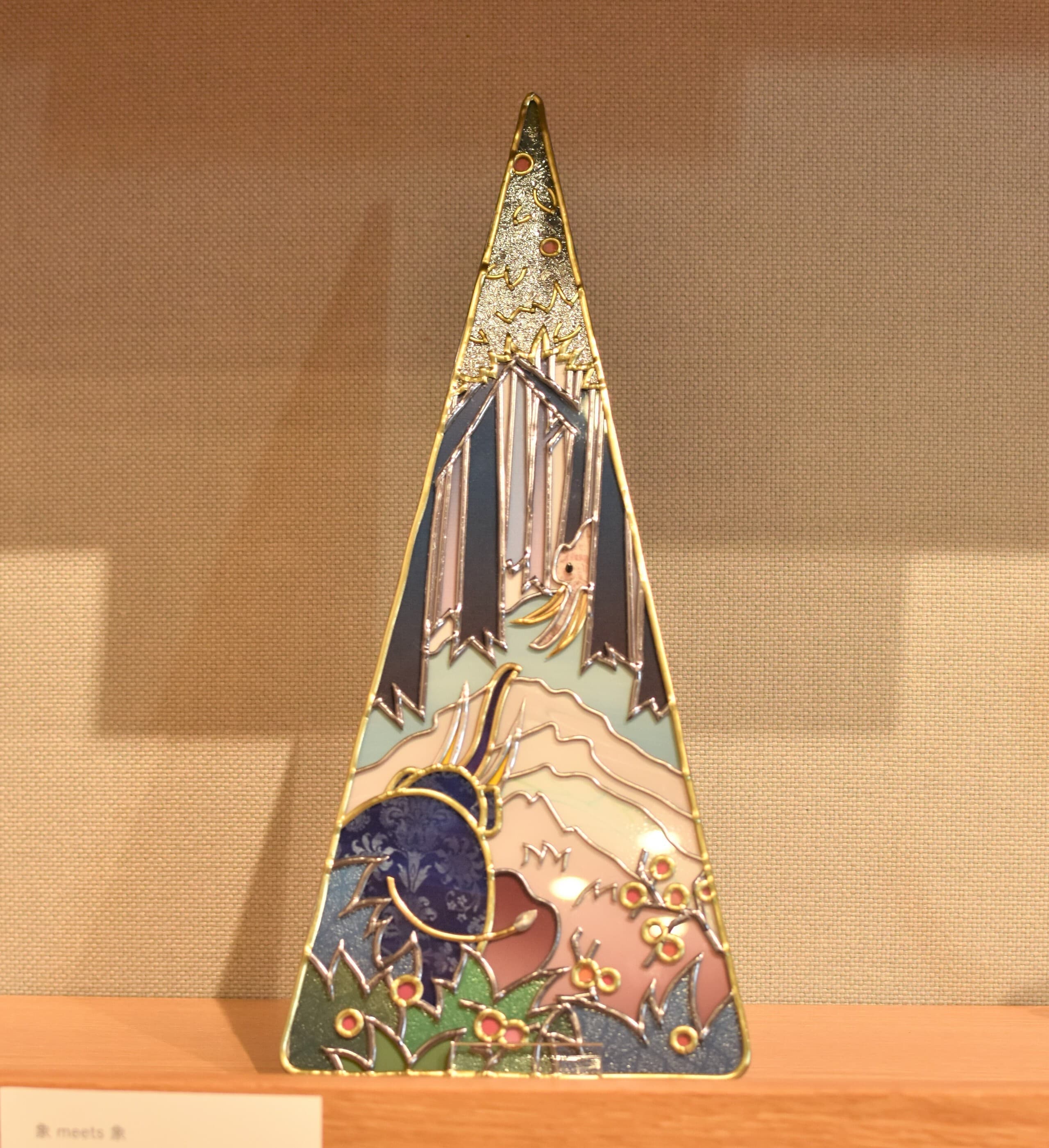 太古の森でアケボノゾウ同士が出会った。鬱蒼とした木々の中に見えた姿。ひとりぼっちじゃなかった!呼びかけてみよう。なんだかちょっと体の色も模様も違うけど、それはそれ、違ったって嬉しい。そんなシチュエーションをグラスアートで表現してみました。