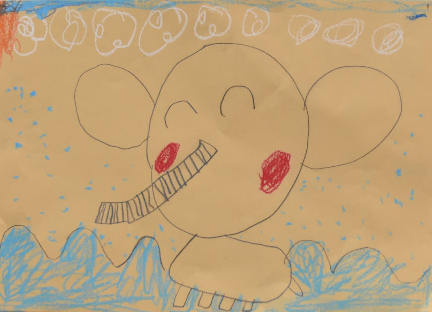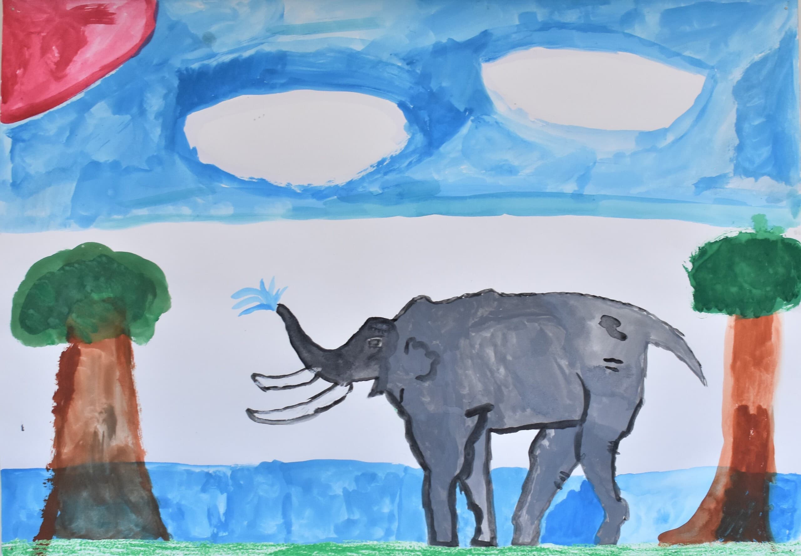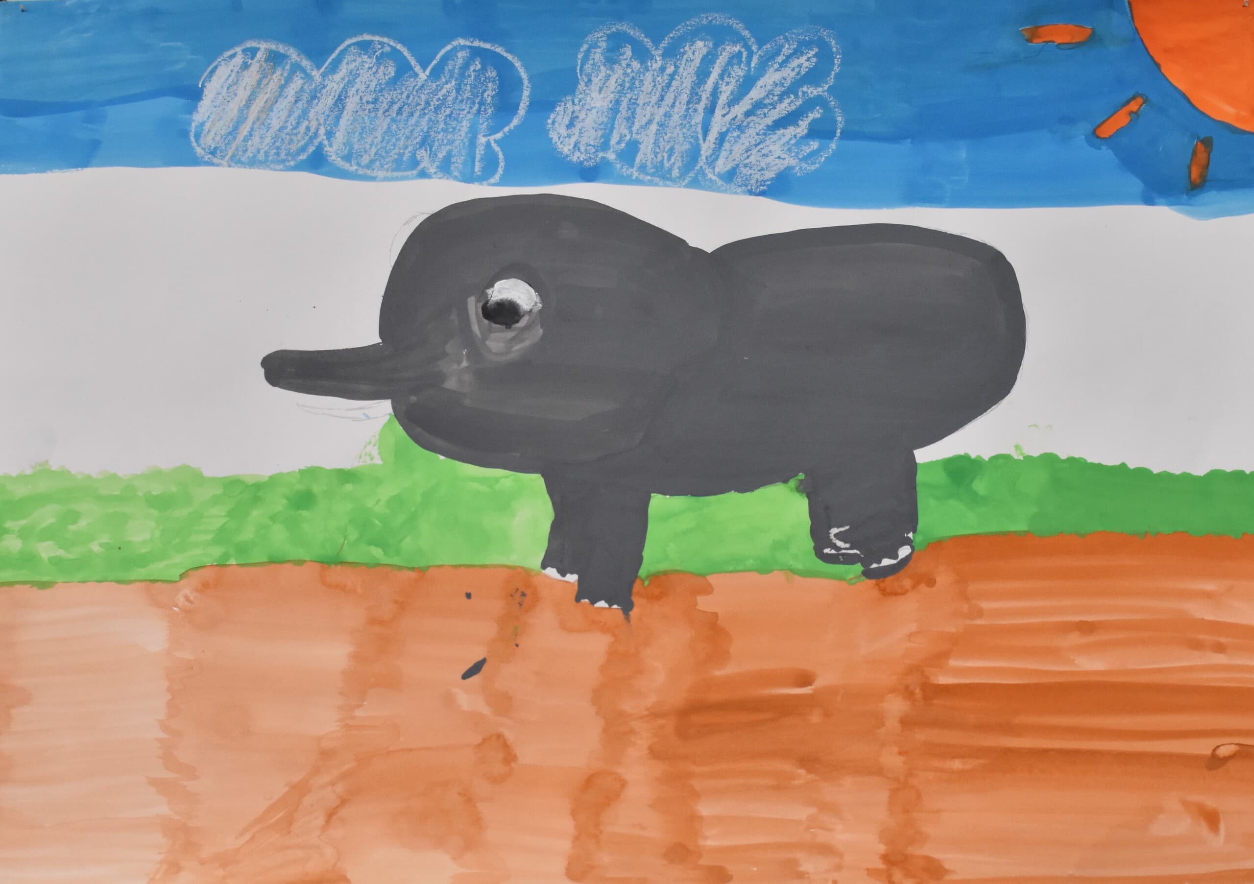 ぞうが大きすぎないように、逆に小さくならないように工夫して描いた。色も自分で作ったりして、描きました。使ったのは、絵の具とクレパスです。クレパスでは、雲を描きました。それ以外のぞうや、土などは、絵の具で描きました。