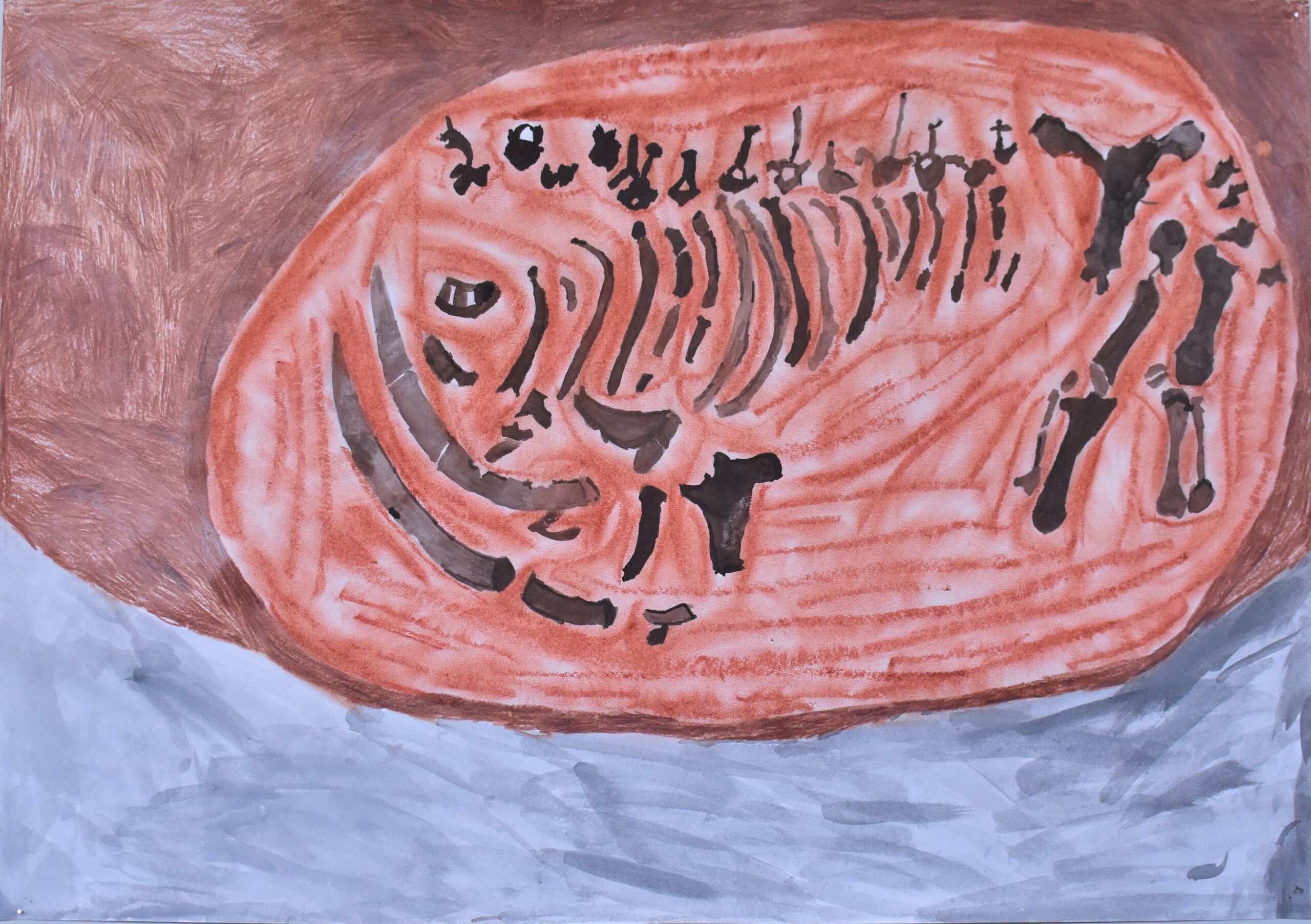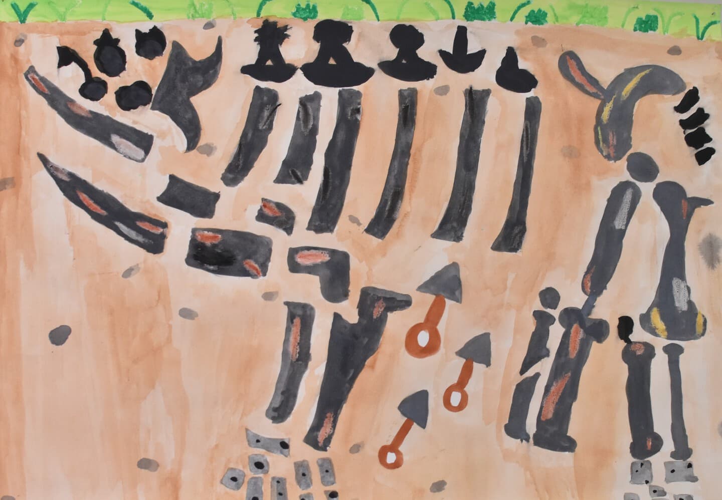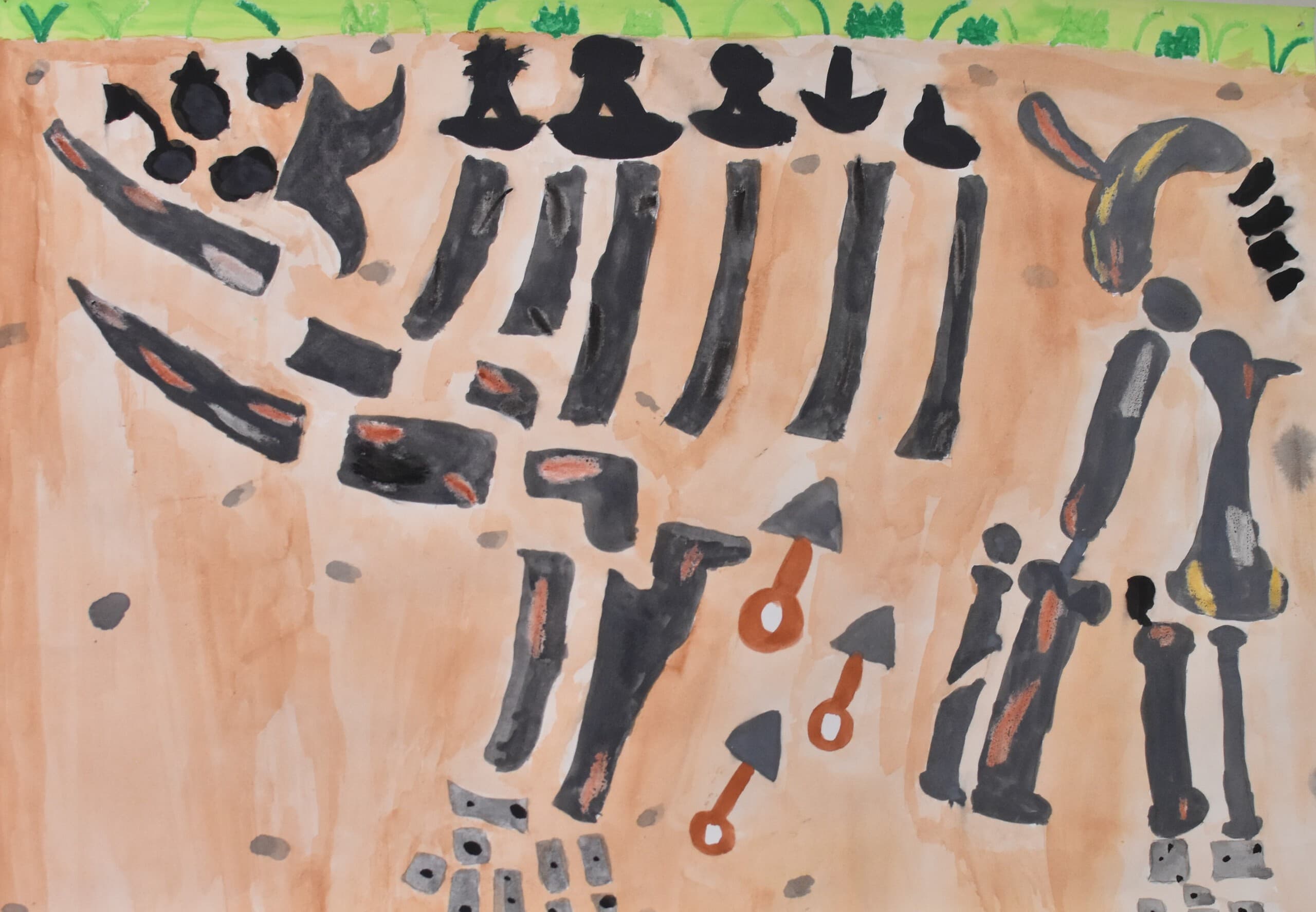 実際に発掘体験をしてみて、土の質感や骨の色などが良く分かりそのおかげで作品もよりリアルになりました。だから、土の色や骨の傷をよく見てほしいです。私の作品は化石が土の中に実際に眠っていたことから、土の中の様子を絵で表現しました。その形のまま見つかっていたら、すごいなと思ったので想像で書きました。