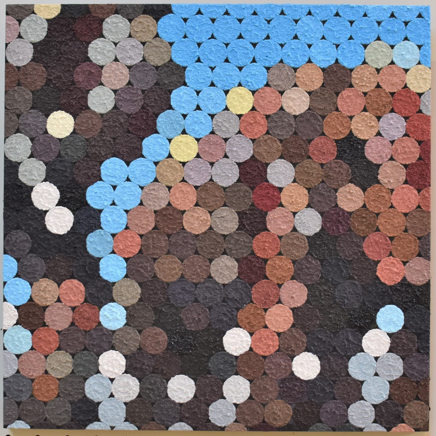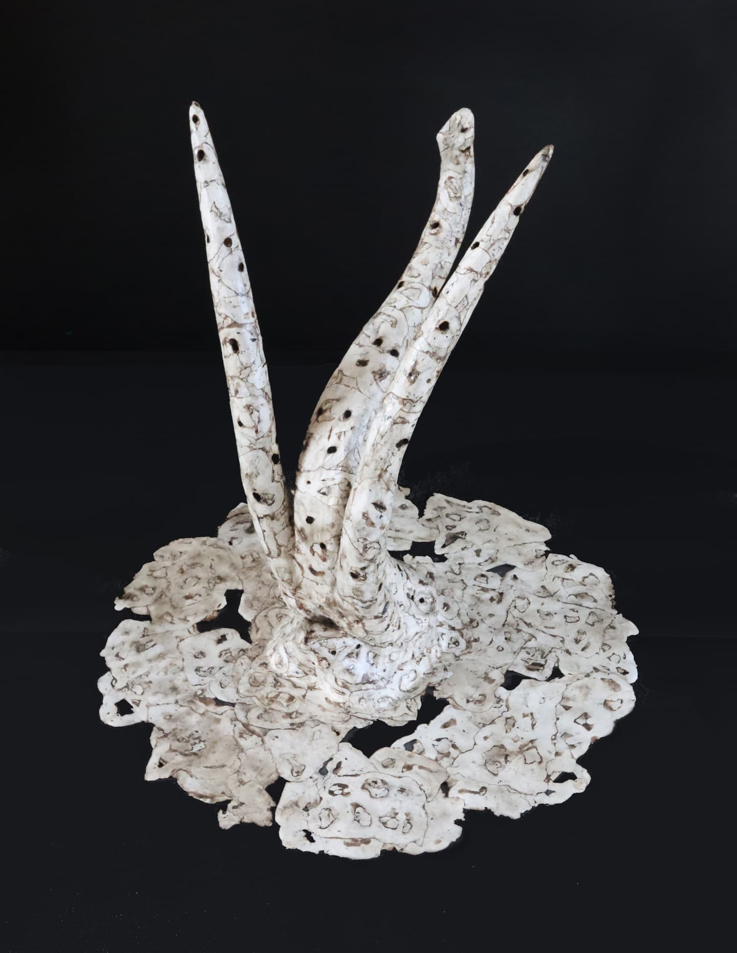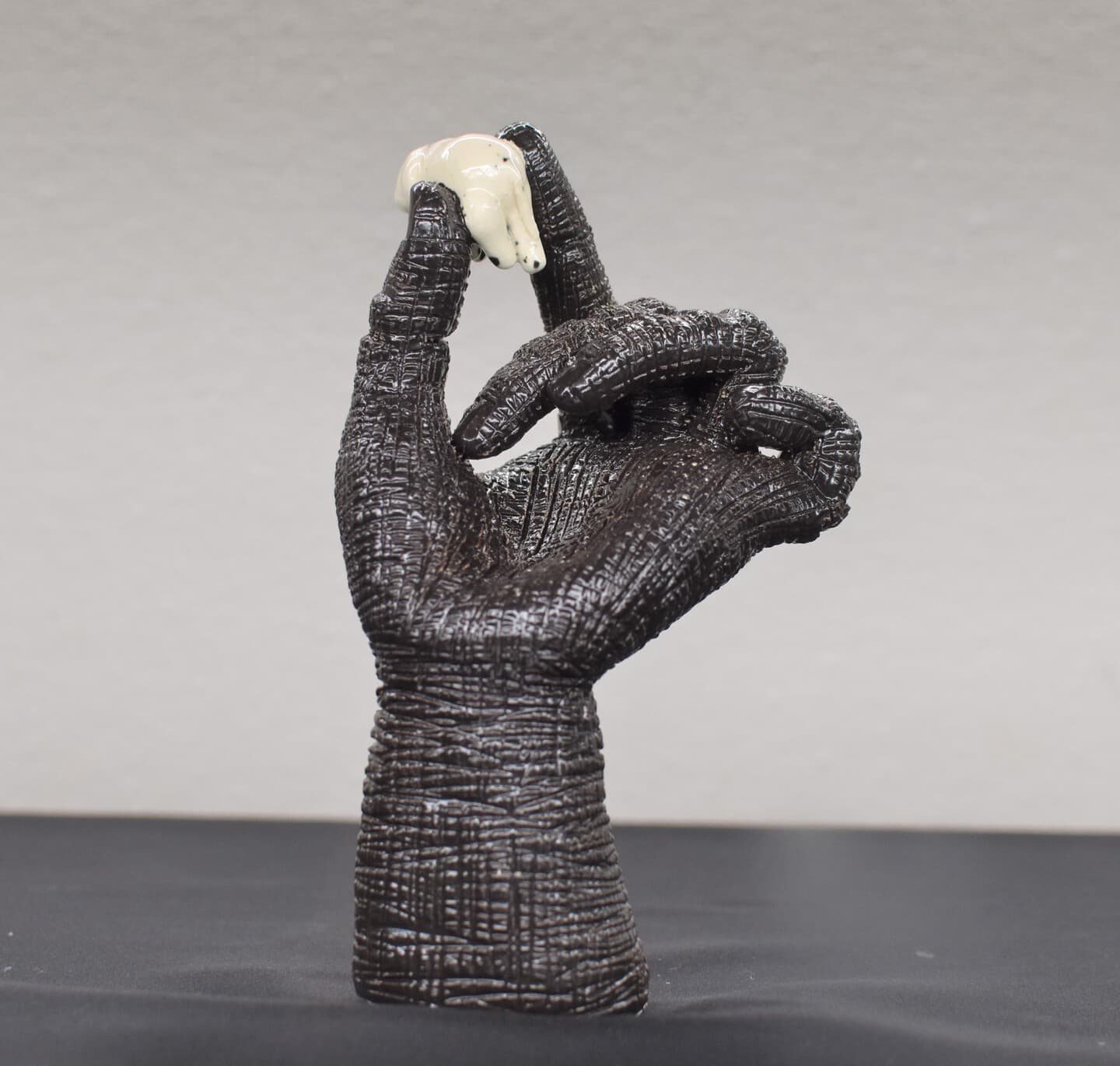 この作品は、人間の手によってアケボノゾウの化石が掘り出され、様々な人に知られ注目されている今の状況に焦点を当てて制作しました。化石を掘り出して見つけることを地球規模で考えると、改めて確率はとても低く稀であると思います。なので私は、化石が掘り出されたということに驚き興味を持ち、それを表現する作品を制作したいと思いました。なので初めに、日の目を見る確率の低さを表現するために、人間よりも小さいゾウを製作しました。そして、そのゾウを掘り出すことができた喜びを表現するために、人間の手が上に向くように作って大勢の人にゾウを見せている形にしました。その他に、制作前にゾウについて調べている中でゾウの皮膚の柄に魅力を感じ、人間の手にゾウの皮膚の柄を取り入れてみたら面白そうだと思ったので、私の中の遊び心も取り入れてみました。