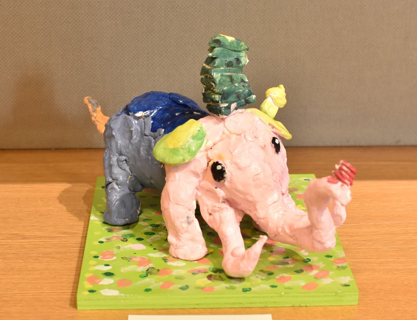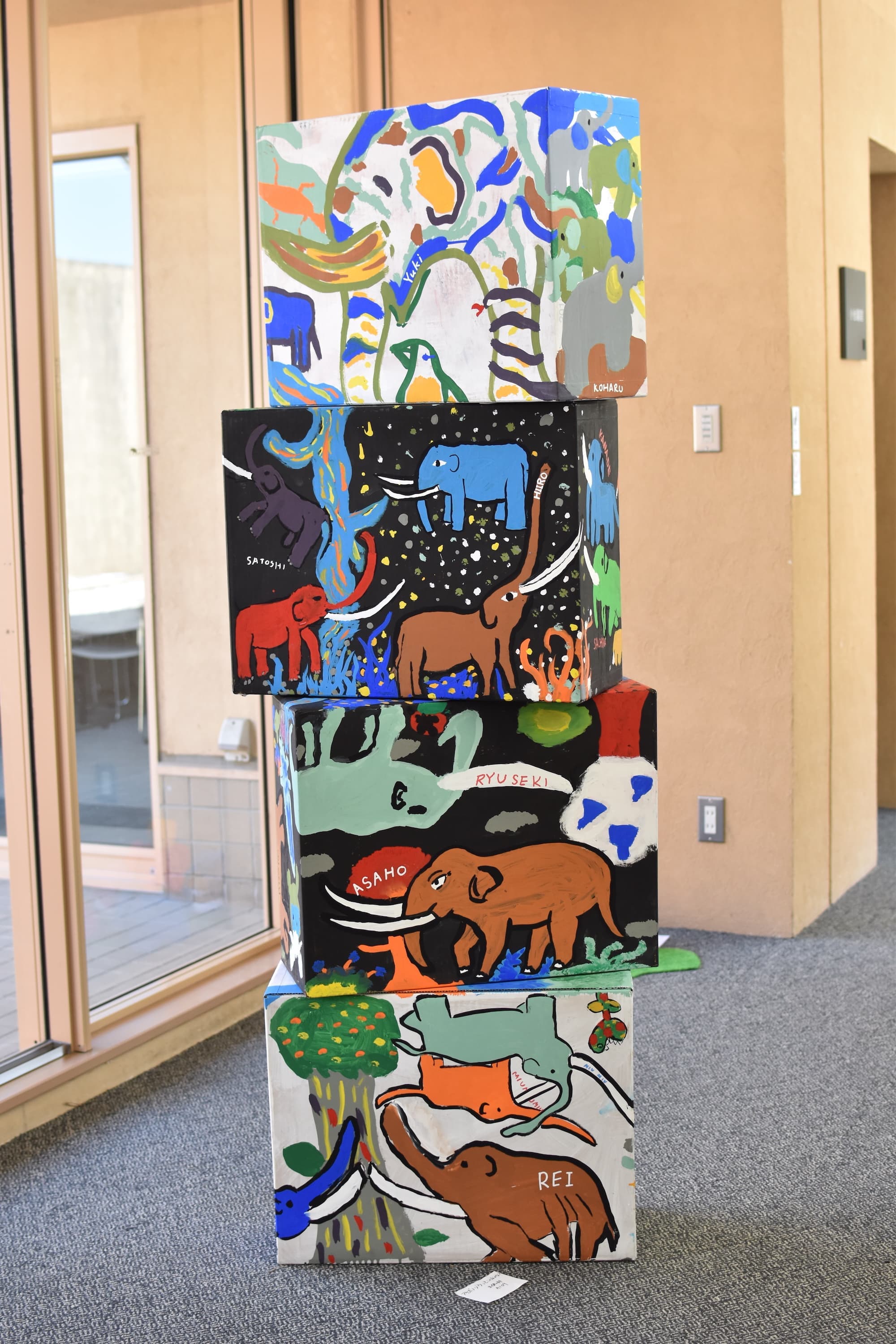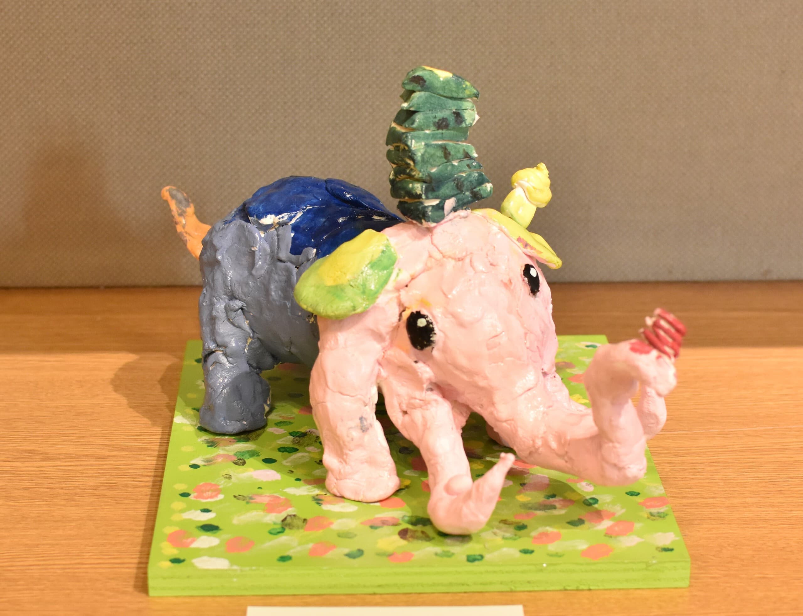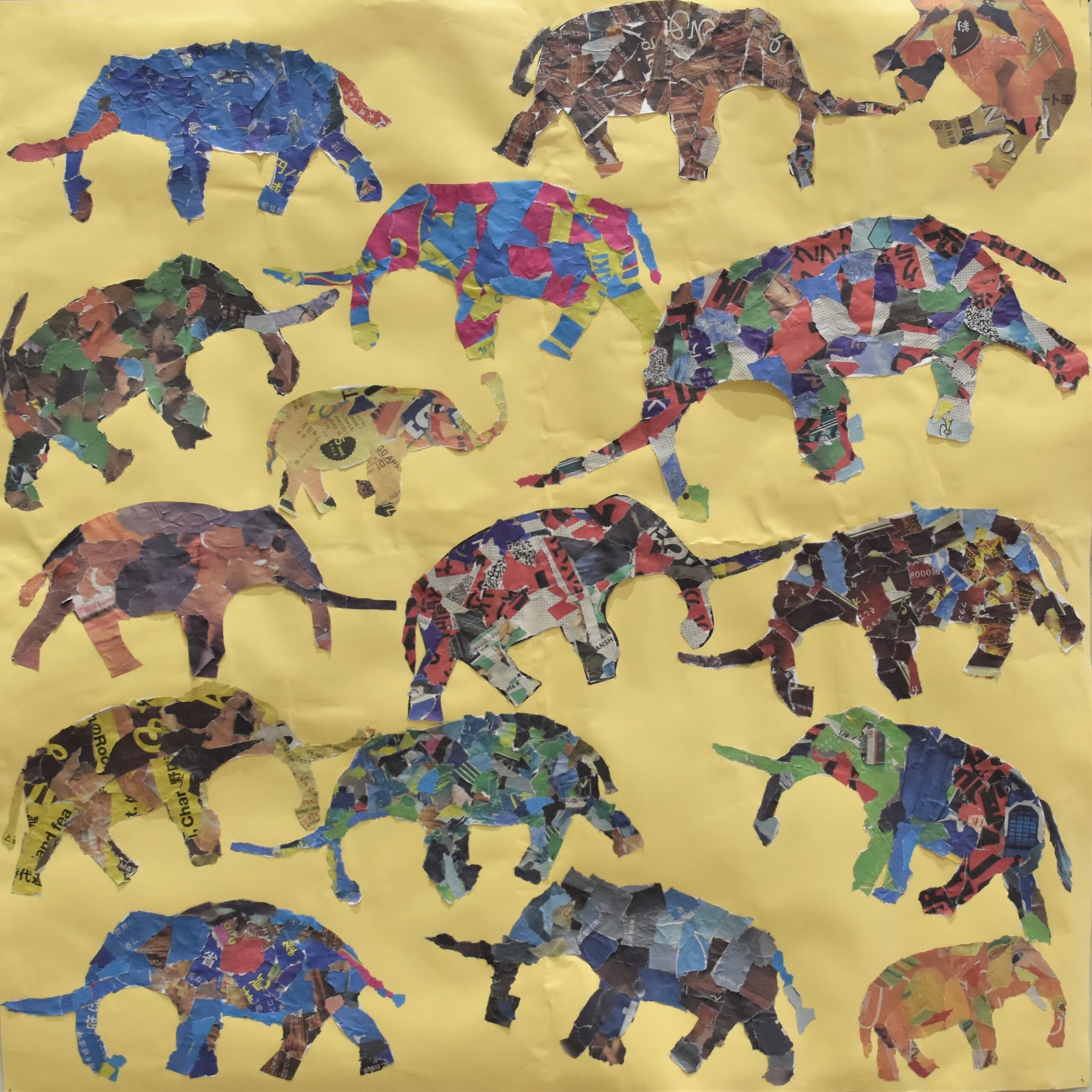 一番多くの応募がありました平面作品!展示会場は色とりどりの優しい顔をした象達の集結です!