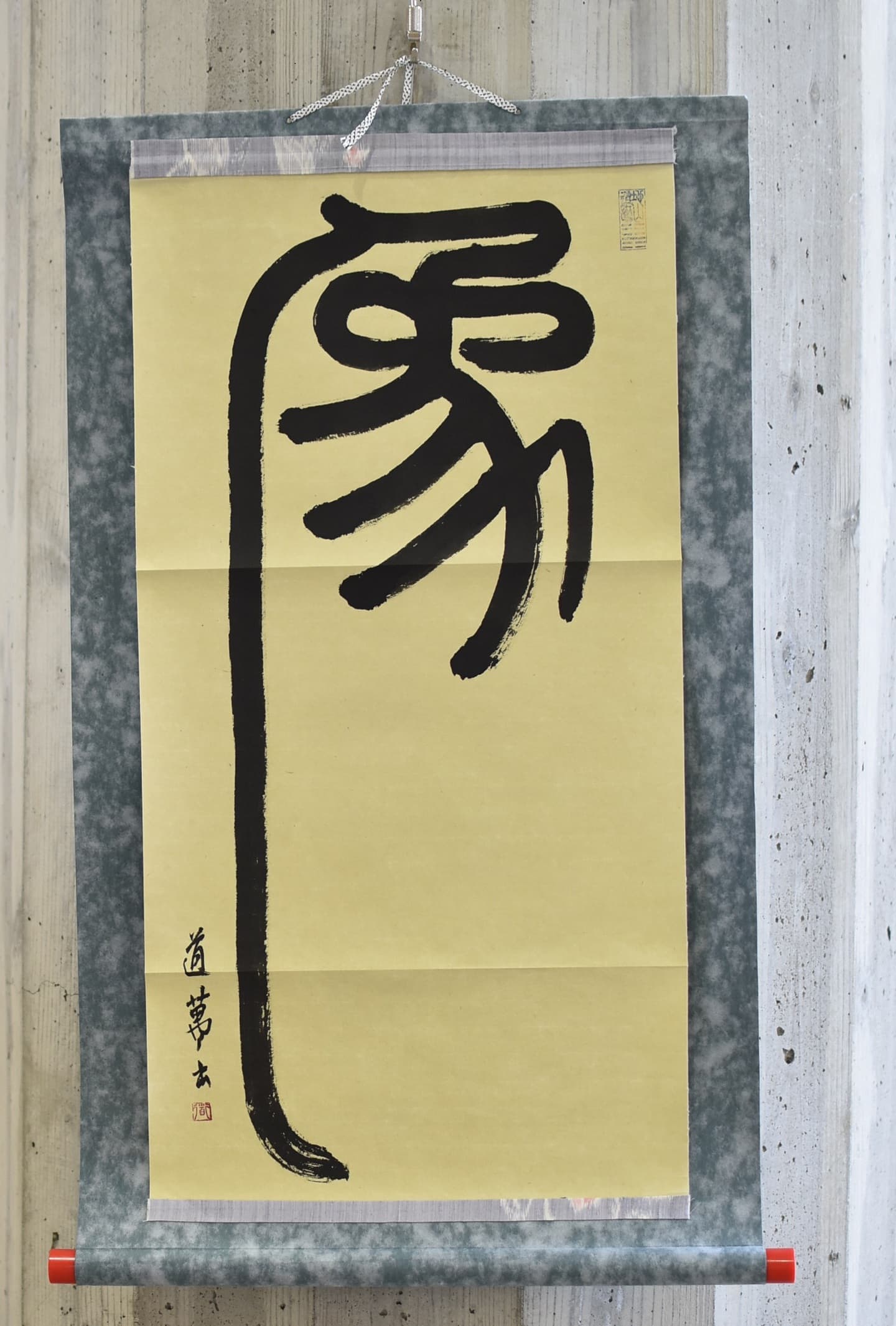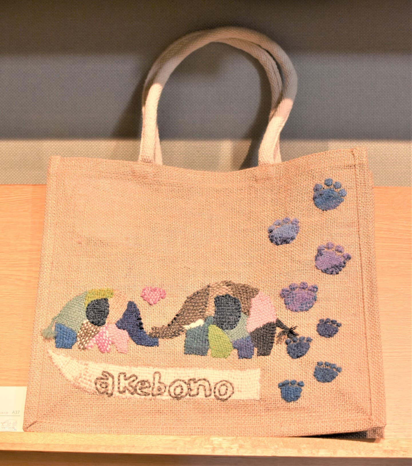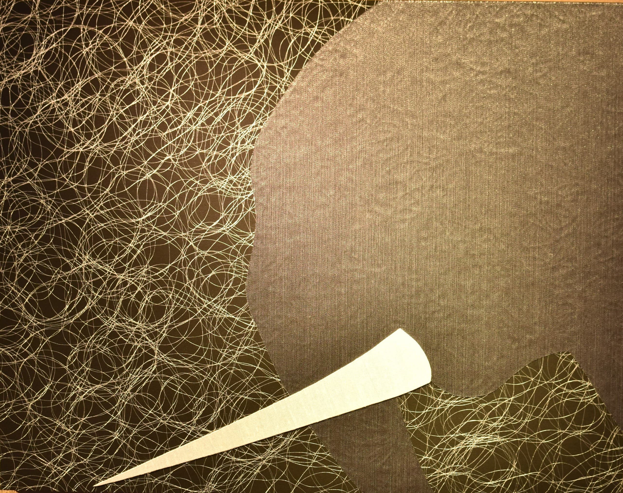 幼少期より象が大好きです。今ジャガード織物を作り、その織物で作品を作って発表しています。大好きな象が日本にいた、それも自分の住んでいる関西にいたということを知り感激でした。このアート展を教えて頂き、是非いつも作っているジャガード織物で象を作ってみたいと思いました。出てきた骨や歯からシガタガゾウの姿がだんだん見えてきた様子を白と黒の生地で表現しました。今私の知っている象とどこか違ってたのか、同じようにゆったりと多賀を歩いていたのか、そんなことを思いながら楽しく作りました。