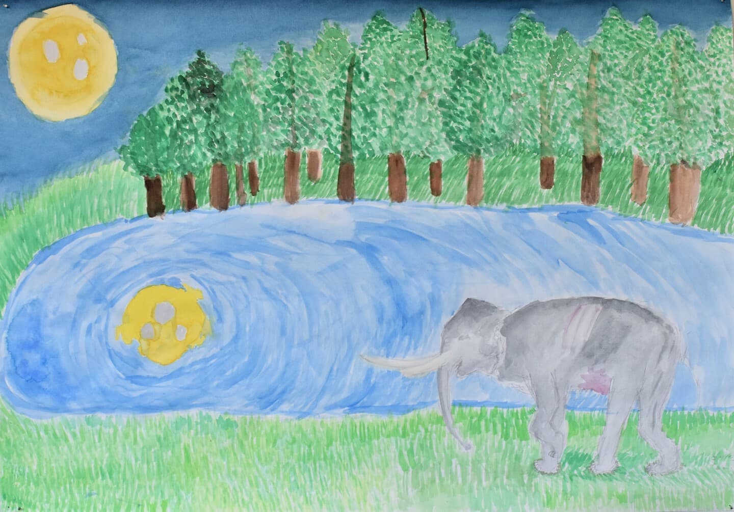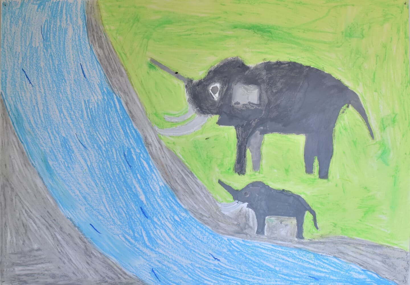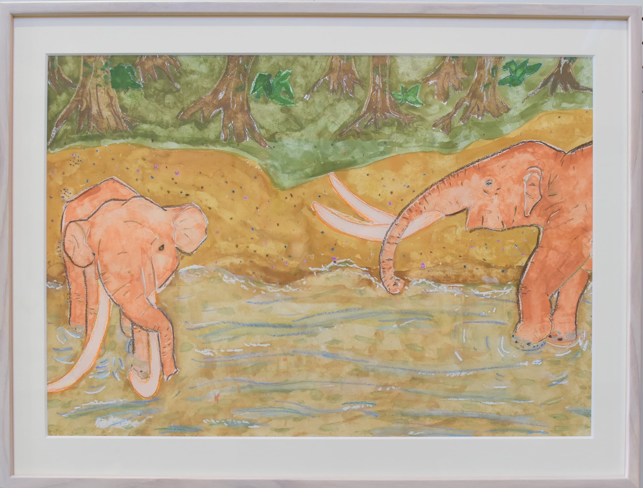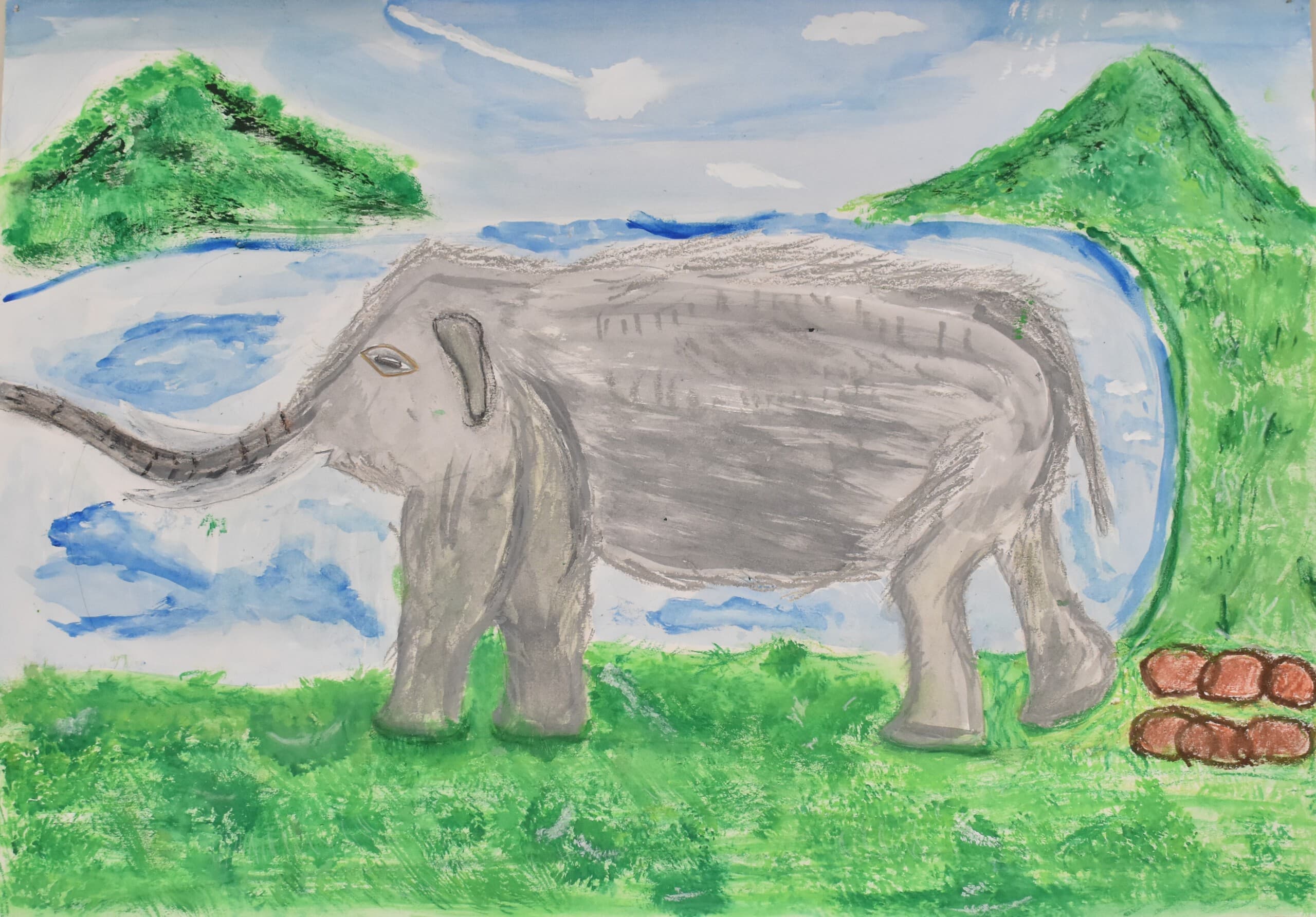 アケボノゾウの生活を想像して描きました。 湿地帯はクレパスを使って、手で伸ばして描きました。川は、水の流れをリアルに出したかったので水で薄めた青色を薄っすら塗りその上から白色と黄色を混ぜた色で細く色を載せました。空は、水で薄めた青色の上から水を含ませない白色で塗りました。アケボノゾウは、絵具だけ塗りました。アケボノゾウが川に水を飲みに行く様子を描きました。