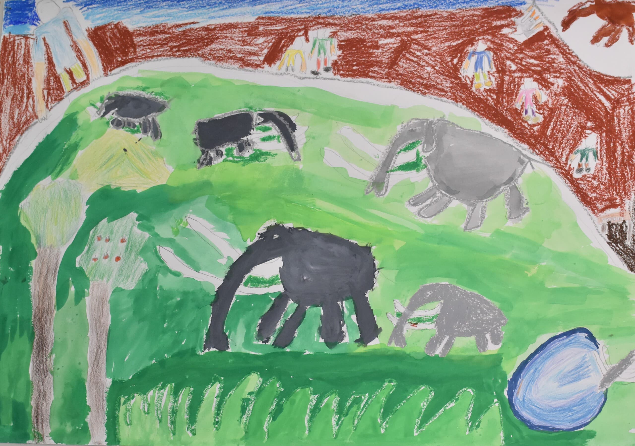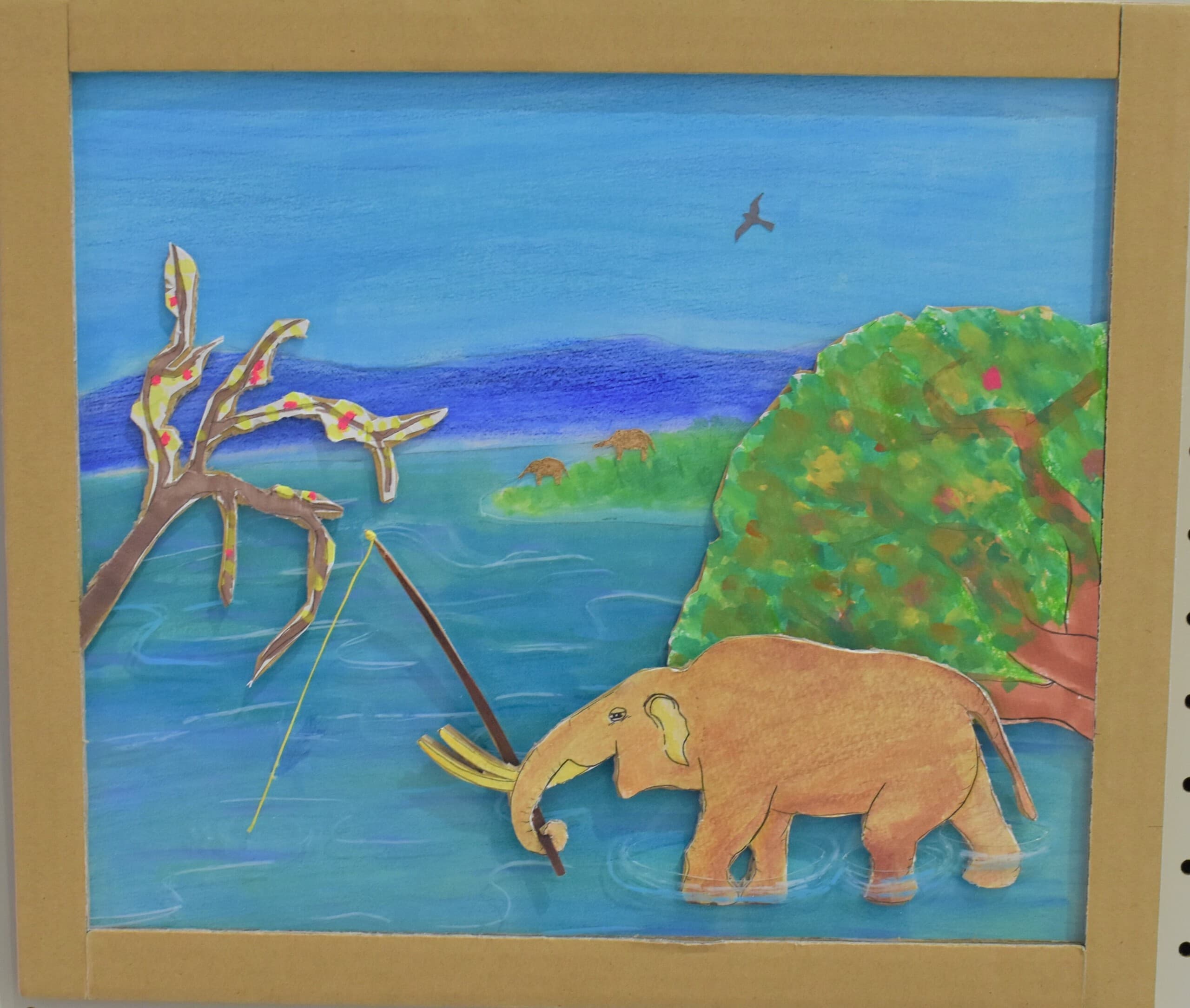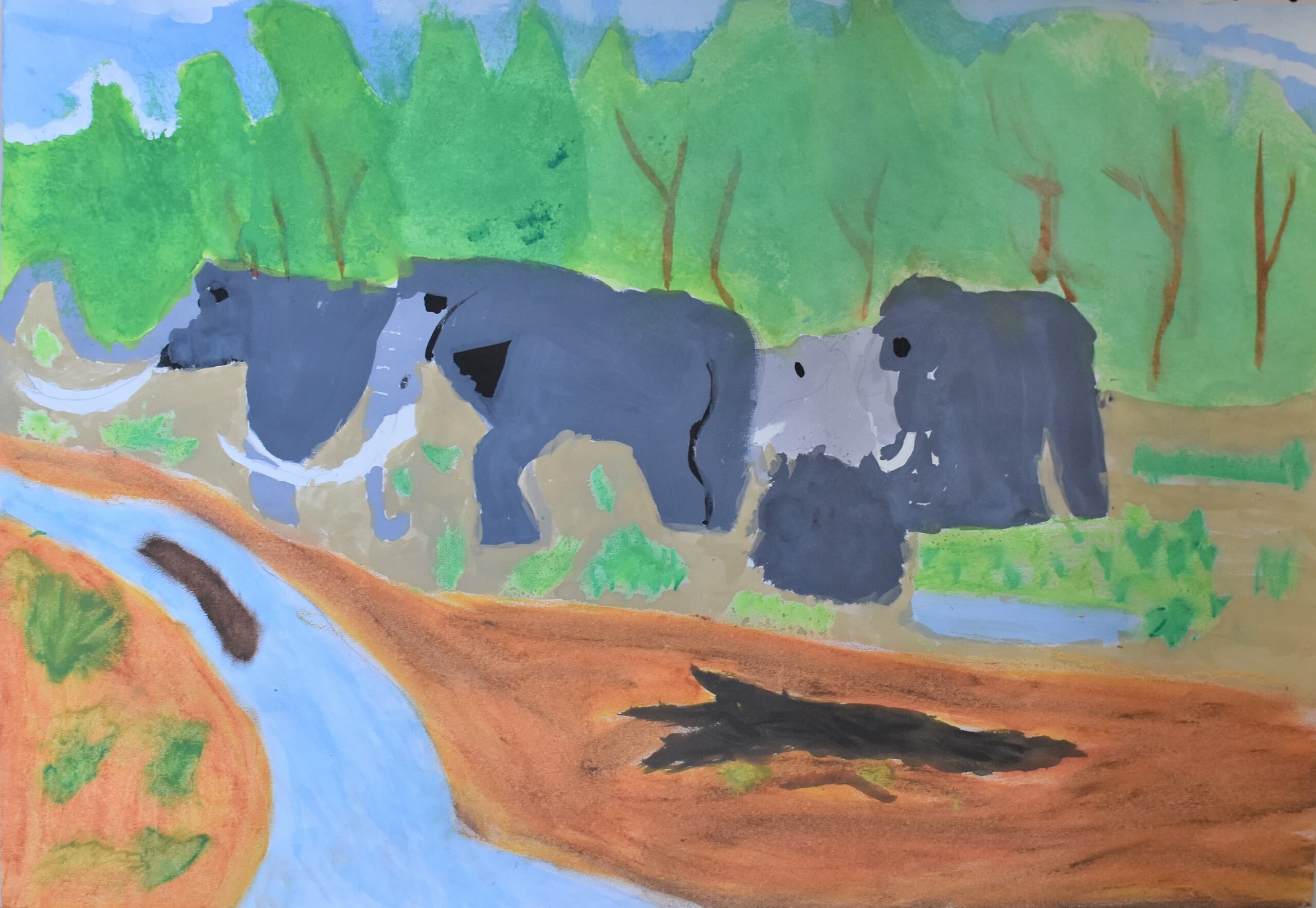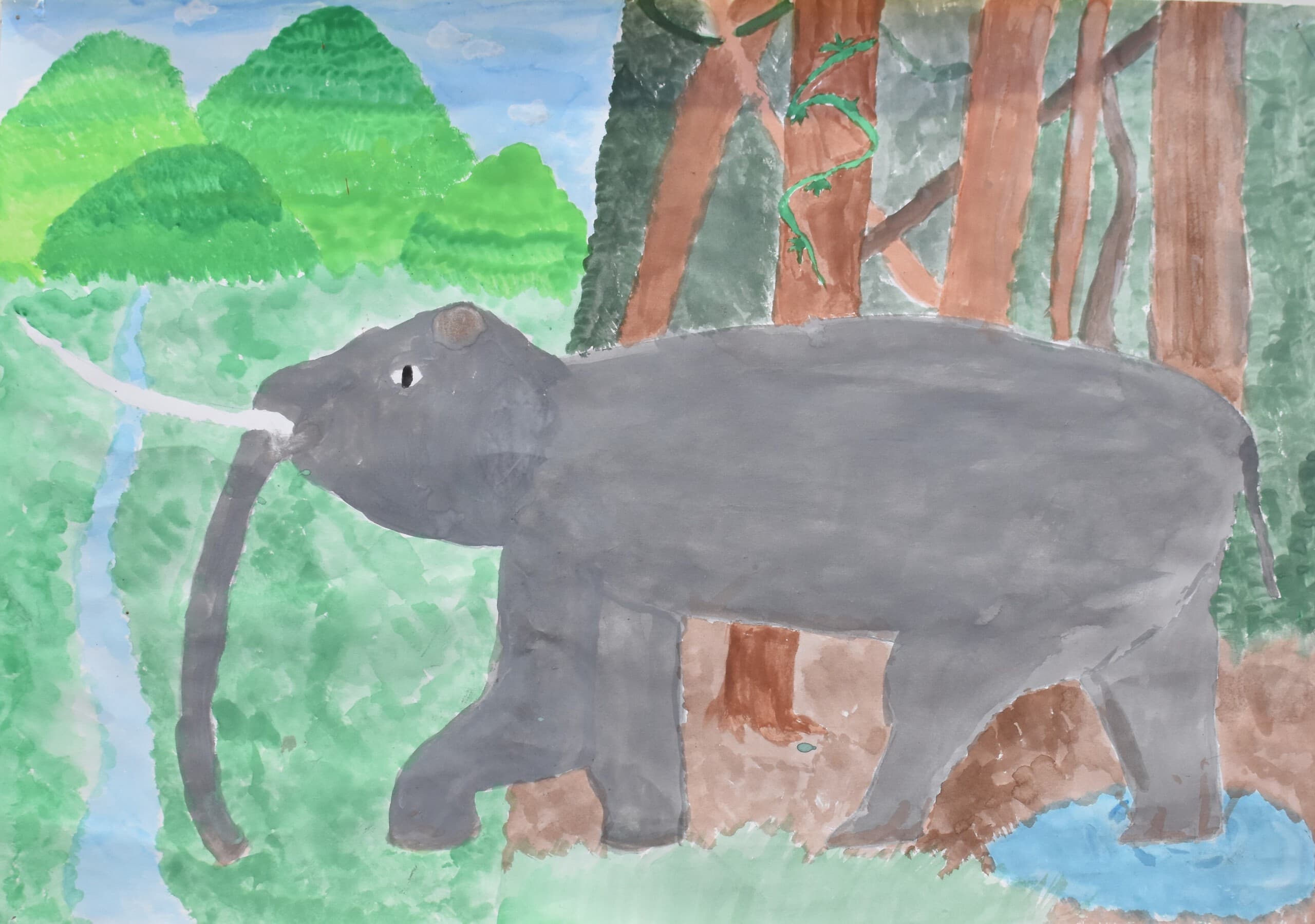 アケボノゾウの生活を想像して描きました。 湿地帯はクレパスを使って、手で伸ばして描きました。川は、水の流れをリアルに出したかったので水で薄めた青色を薄っすら塗りその上から白色と黄色を混ぜた色で細く色を載せました。空は、水で薄めた青色の上から水を含ませない白色で塗りました。アケボノゾウは、絵具だけ塗りました。アケボノゾウが川に水を飲みに行く様子を描きました。