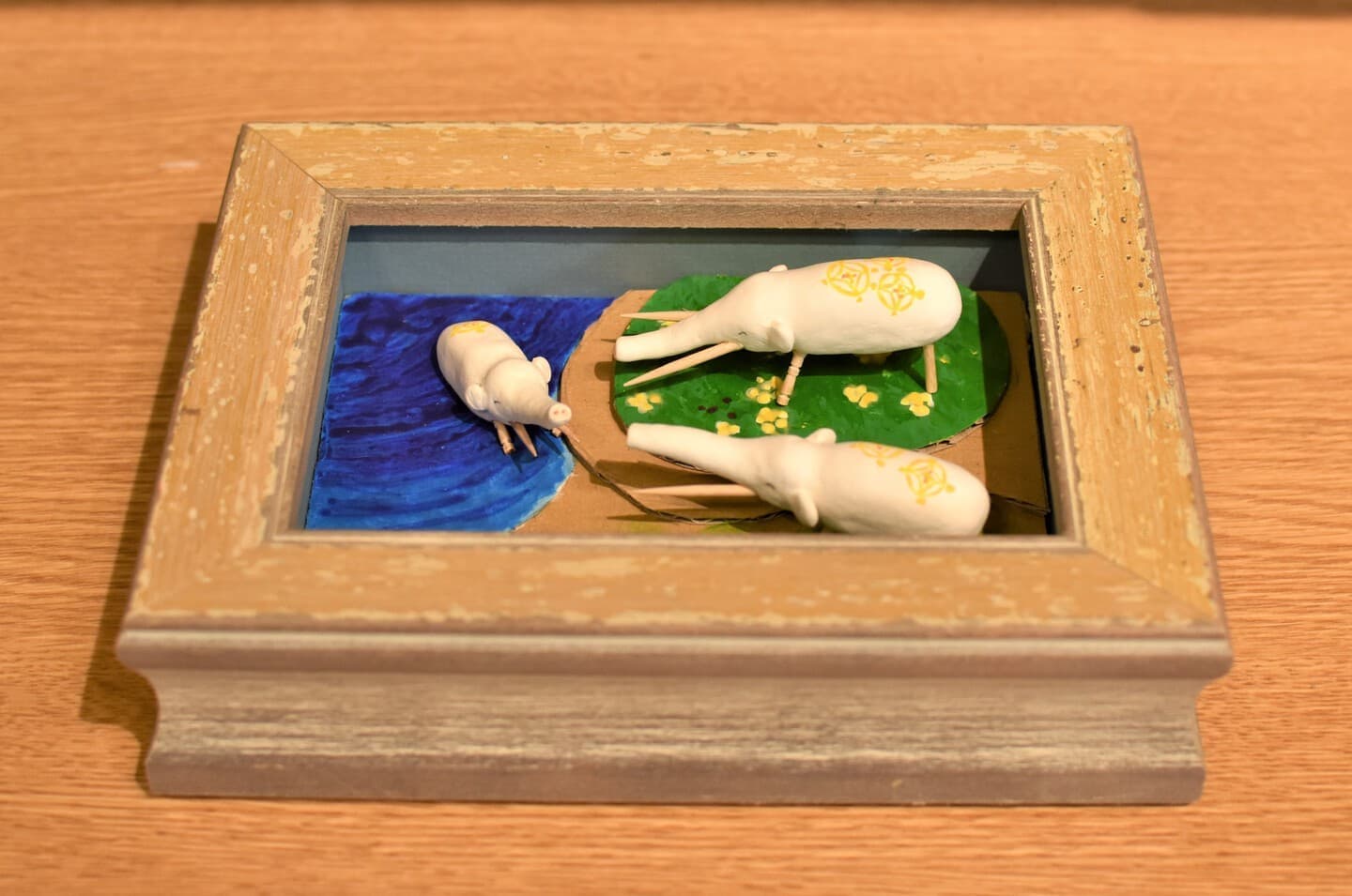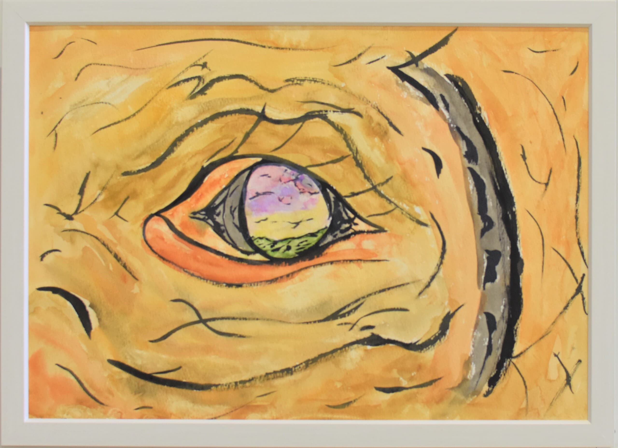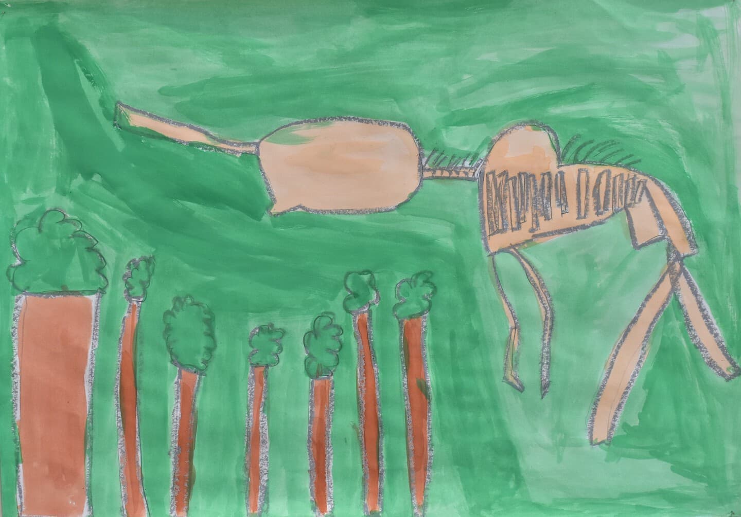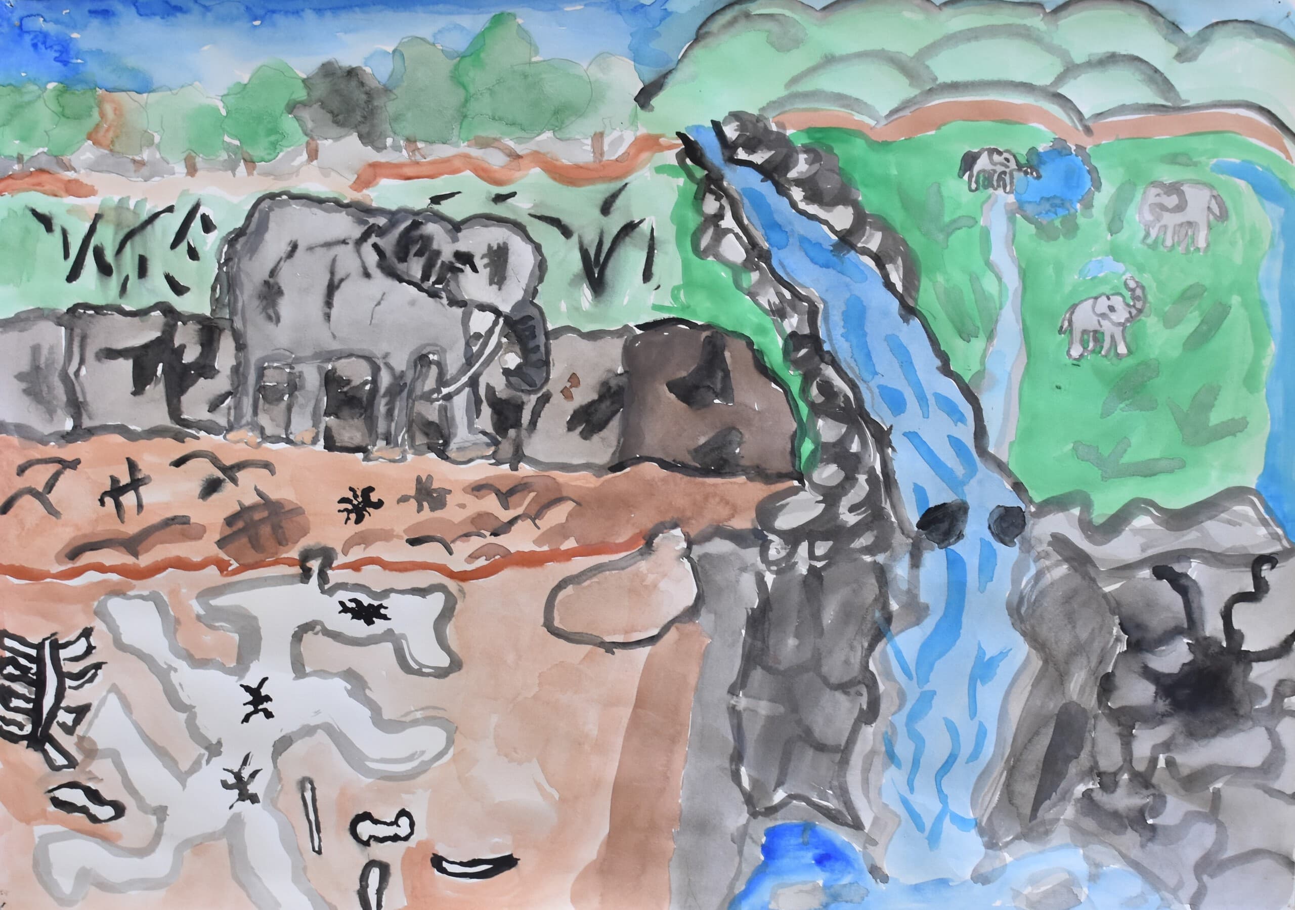 アケボノゾウの生活を想像して描きました。 湿地帯はクレパスを使って、手で伸ばして描きました。川は、水の流れをリアルに出したかったので水で薄めた青色を薄っすら塗りその上から白色と黄色を混ぜた色で細く色を載せました。空は、水で薄めた青色の上から水を含ませない白色で塗りました。アケボノゾウは、絵具だけ塗りました。アケボノゾウが川に水を飲みに行く様子を描きました。
