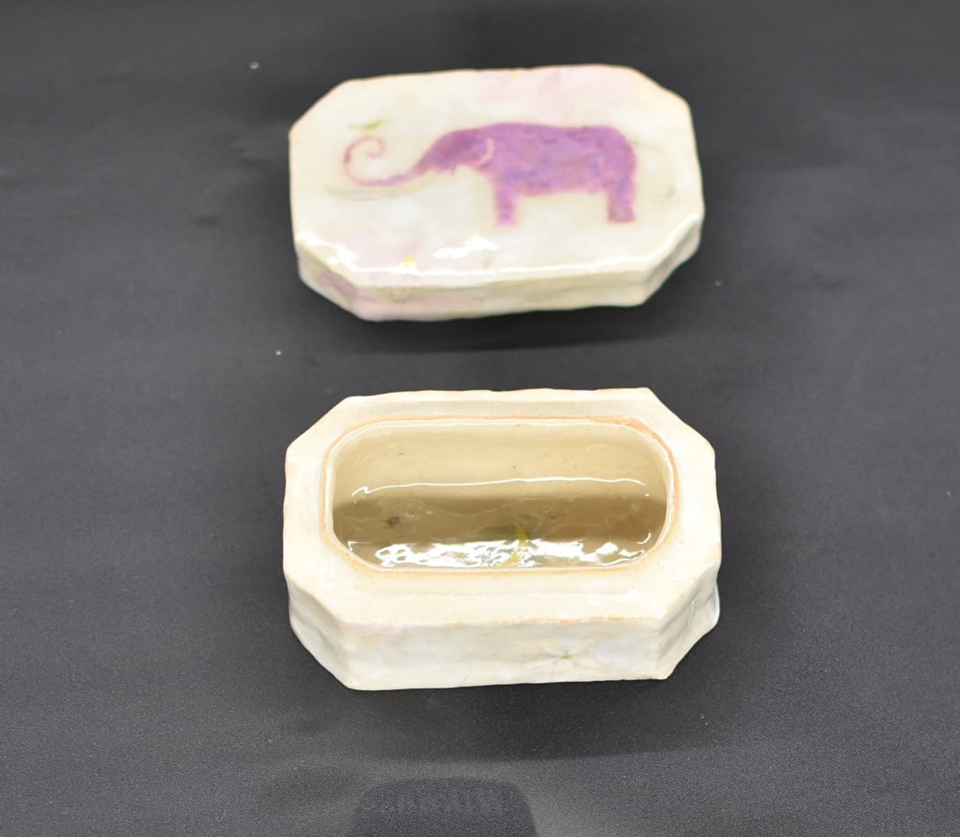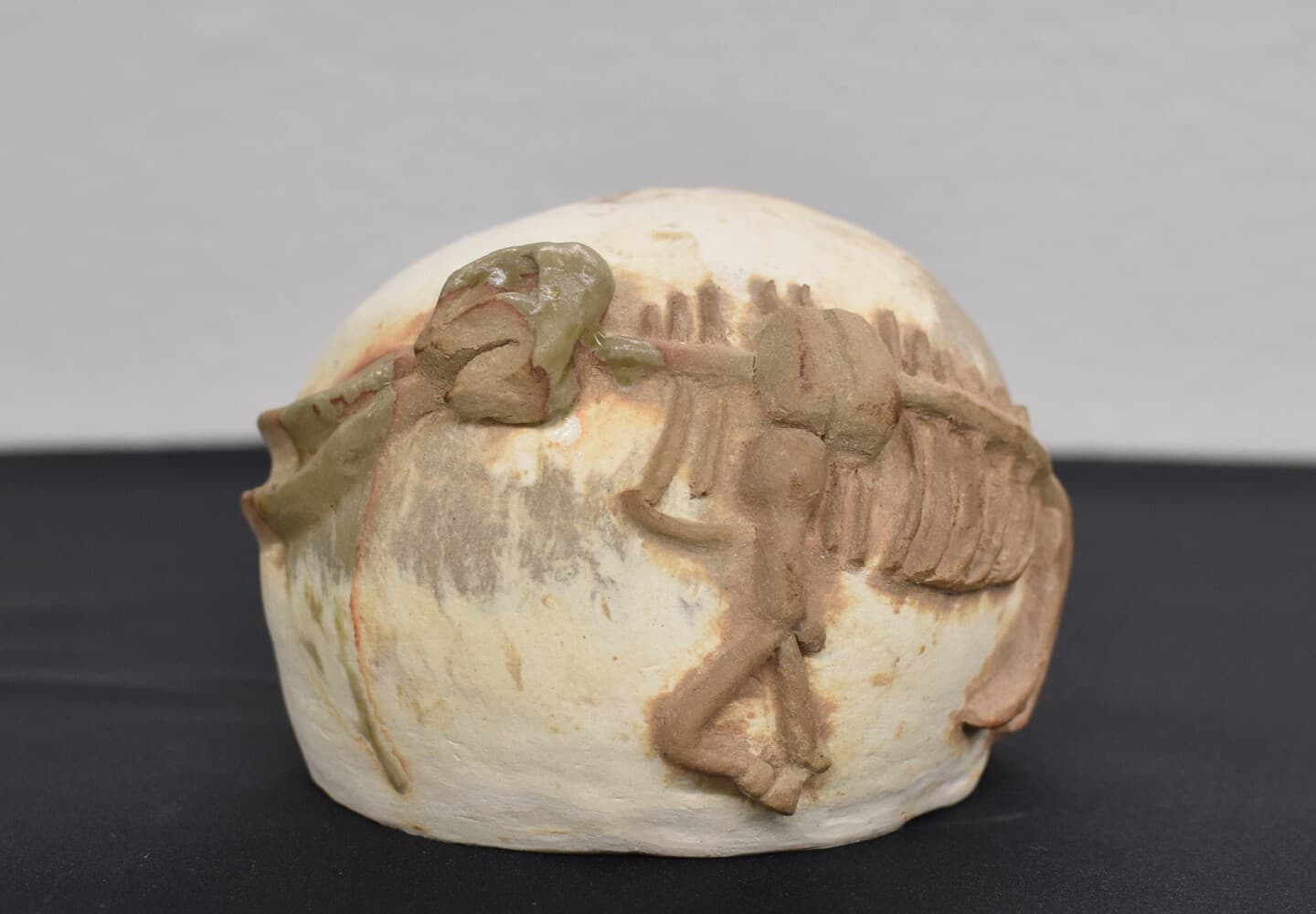 シガタガゾウの化石を陶芸で表現してみました。手びねりで白と赤の土を交互につみあげて化石が埋まっている地層をイメージしています。多賀の地から化石が発掘されるリアル感を出したいと思ったので釉薬はつけずに焼いています。