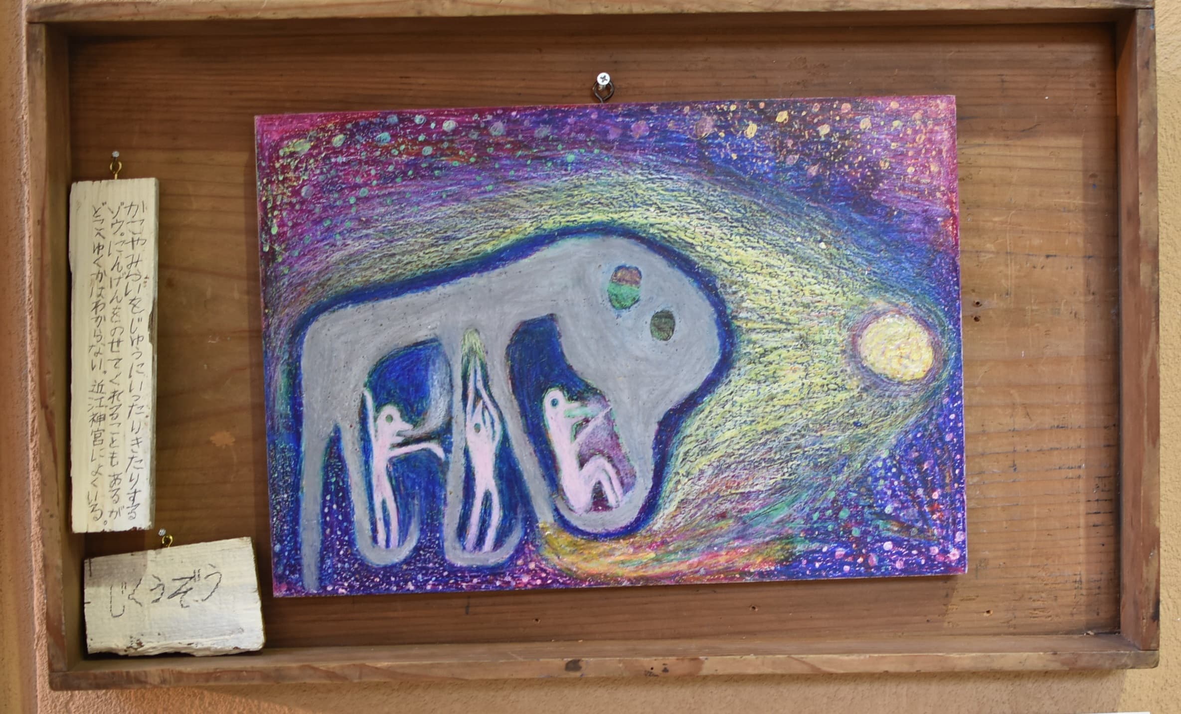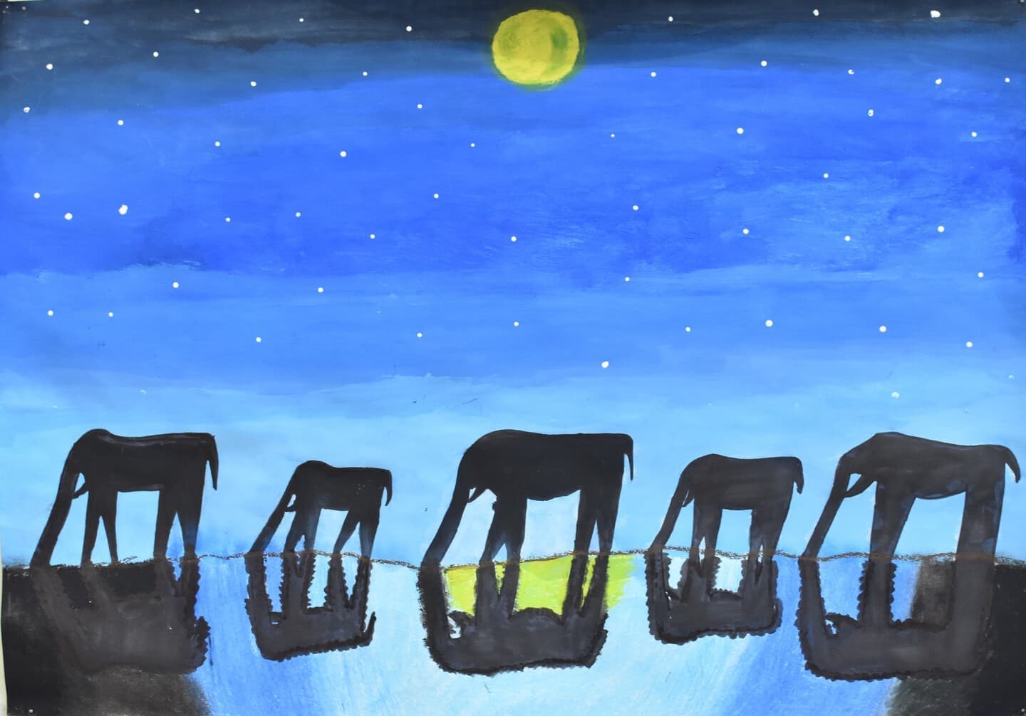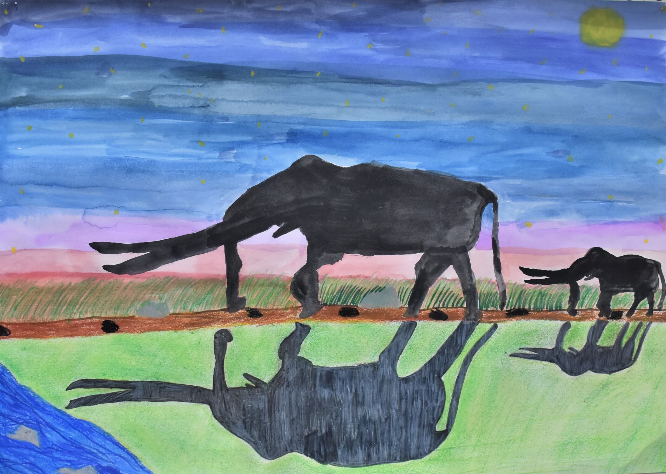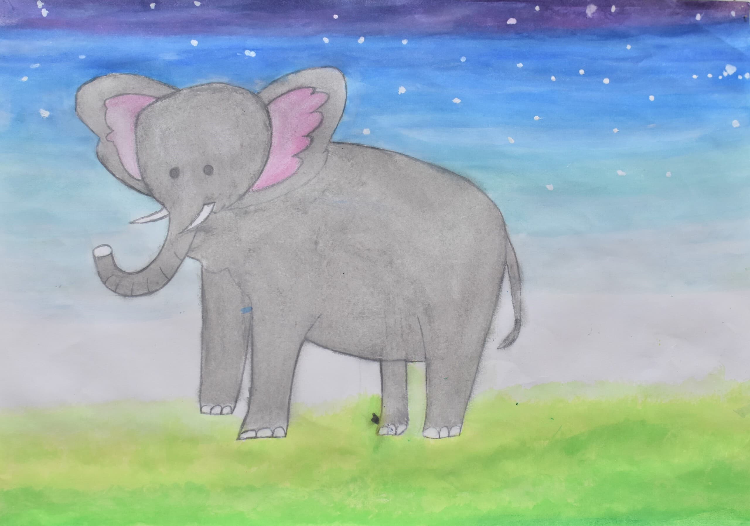 私が作品で見てほしいところは2つあります。1つ目に見てほしいところは、夜空の色です。元々、1つの色で統一しようと思っていましたが、下書きを描いてみたら少し見栄えが悪いかと思いました。その時に、グラデーションが良いのではないかと思い、もう一度下書きを描いてみたら、最初のよりよくなりました。夜空の色に使っている物は、クレパス、絵の具です。2つ目に見てほしいところは、象です。ペンで線をなぞっておらず、そのまま鉛筆で描いています。少し影をつけてみたりしました。色も、少し色が薄いところと濃いところがあります。