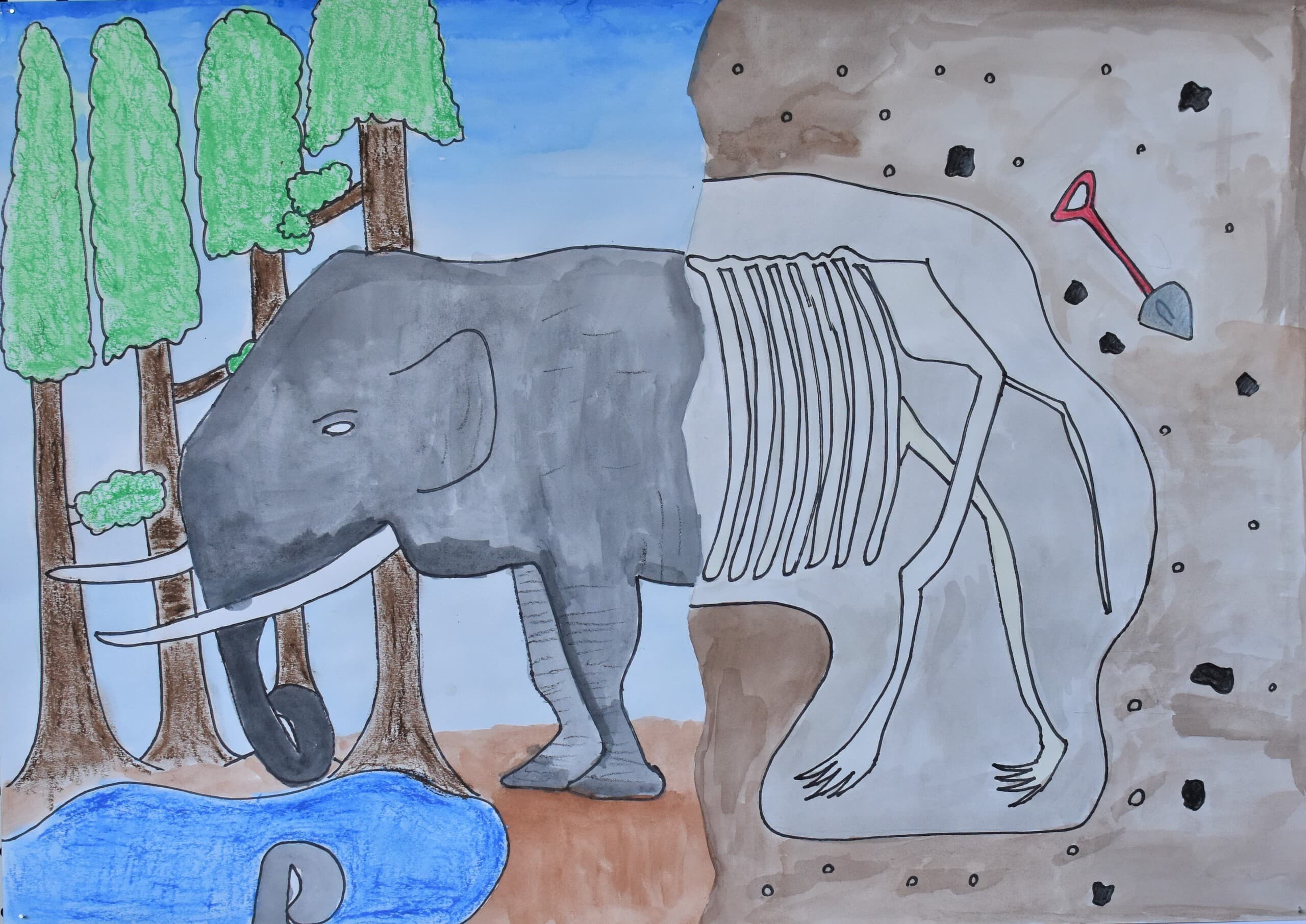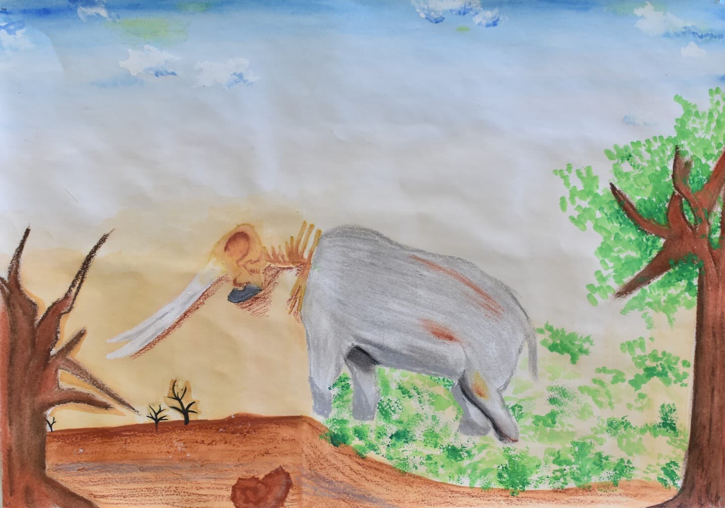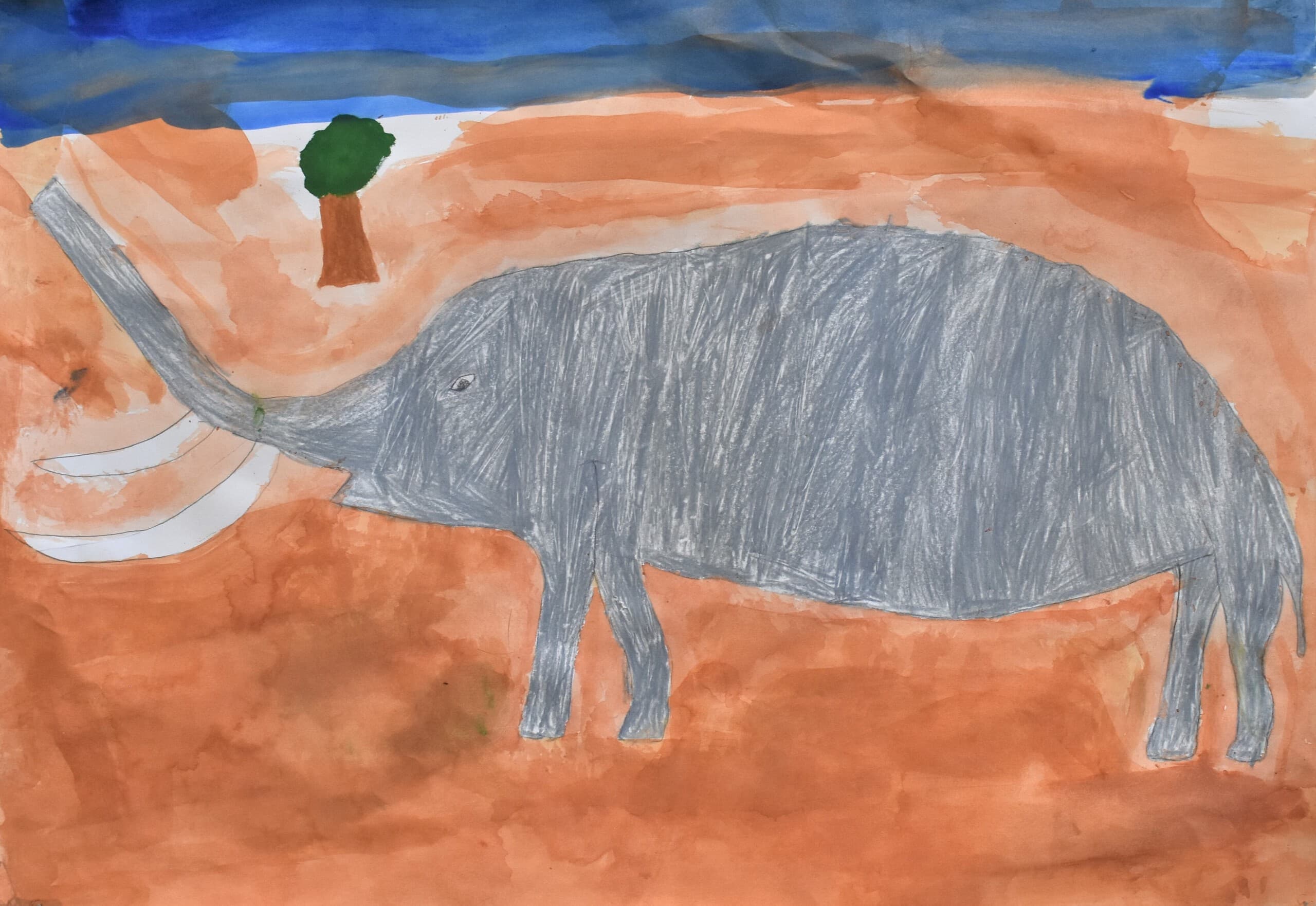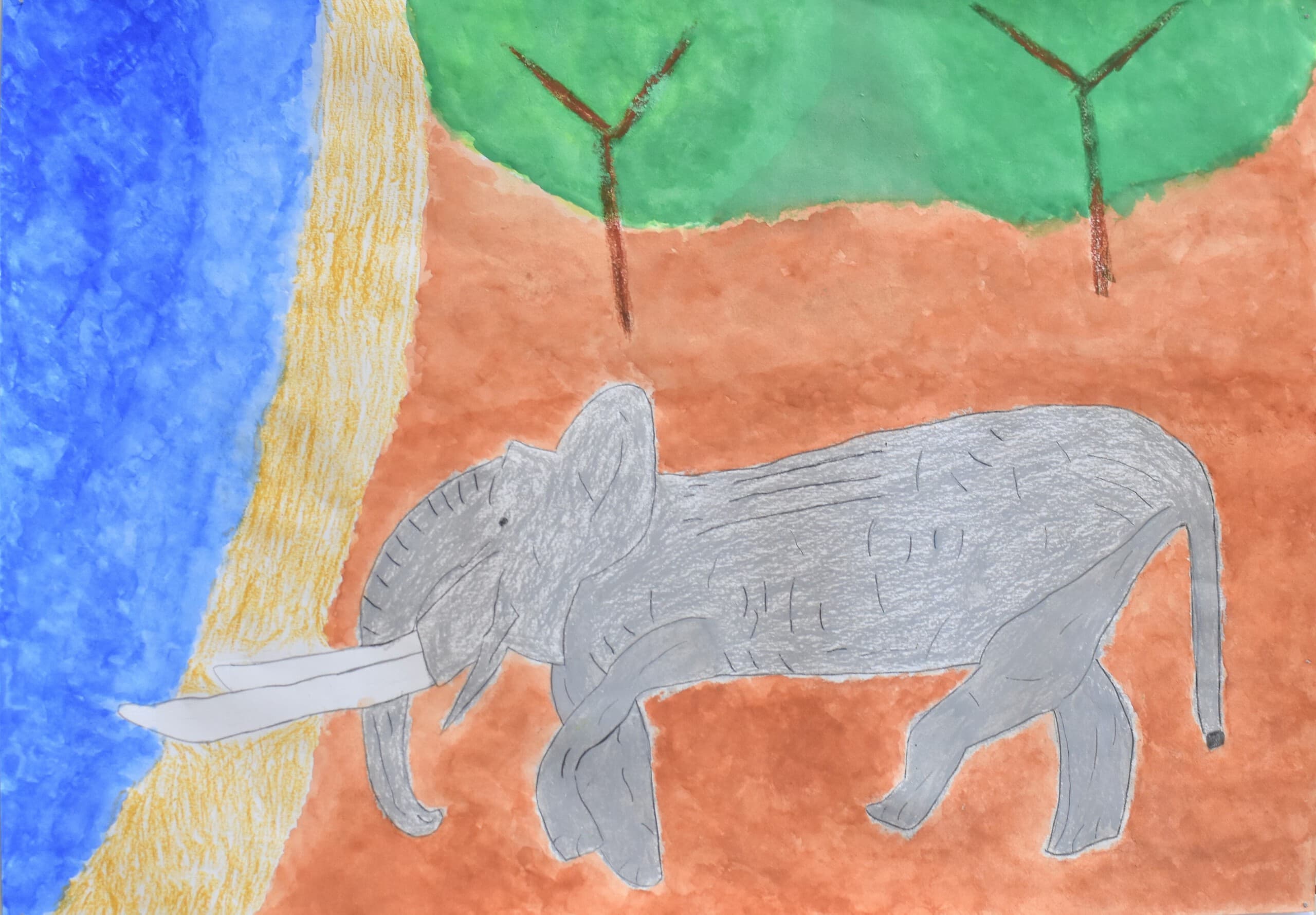 特に見て欲しい所は象の骨側です。白いだけじゃなくて、土がついている所をイメージして少し薄い黄色を付けました。木の部分は、クレパスで塗って、指で広げました。空のところも、グラデーションを使い、工夫して色を付けました。