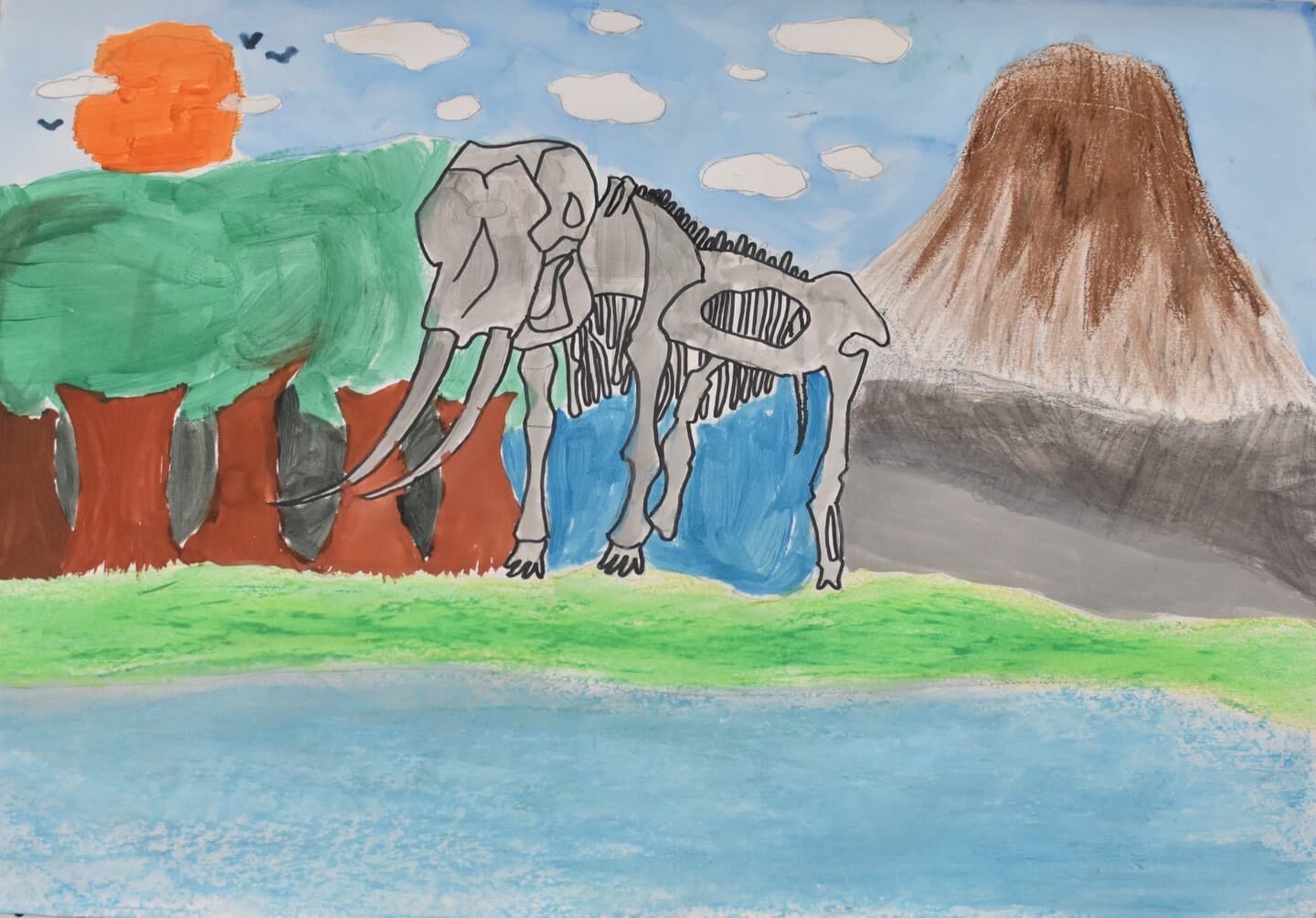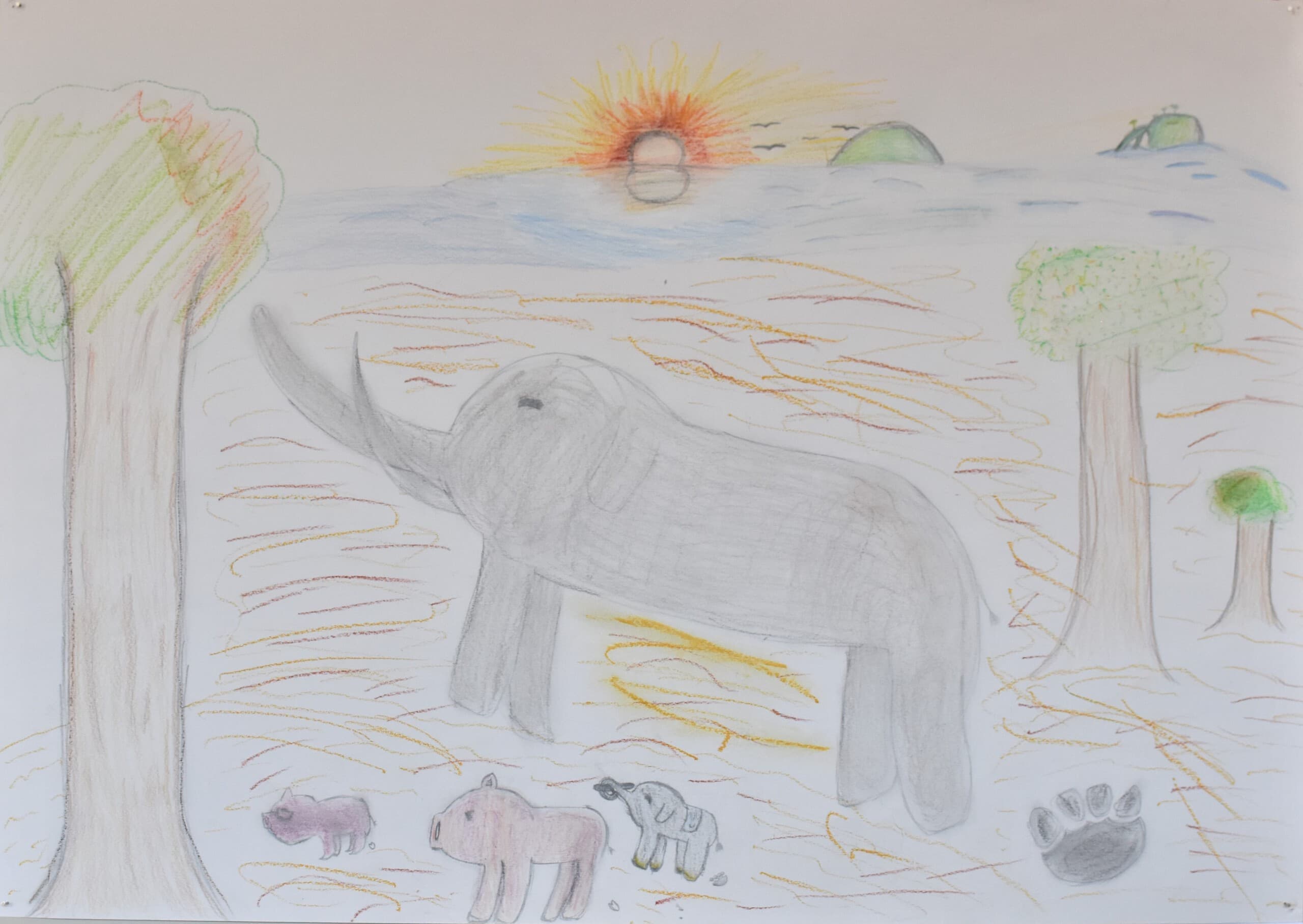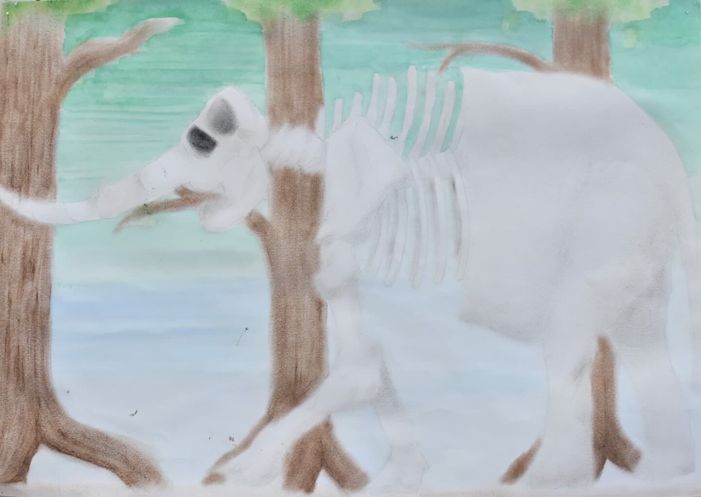 特に見て欲しい所は象の骨側です。白いだけじゃなくて、土がついている所をイメージして少し薄い黄色を付けました。木の部分は、クレパスで塗って、指で広げました。空のところも、グラデーションを使い、工夫して色を付けました。
