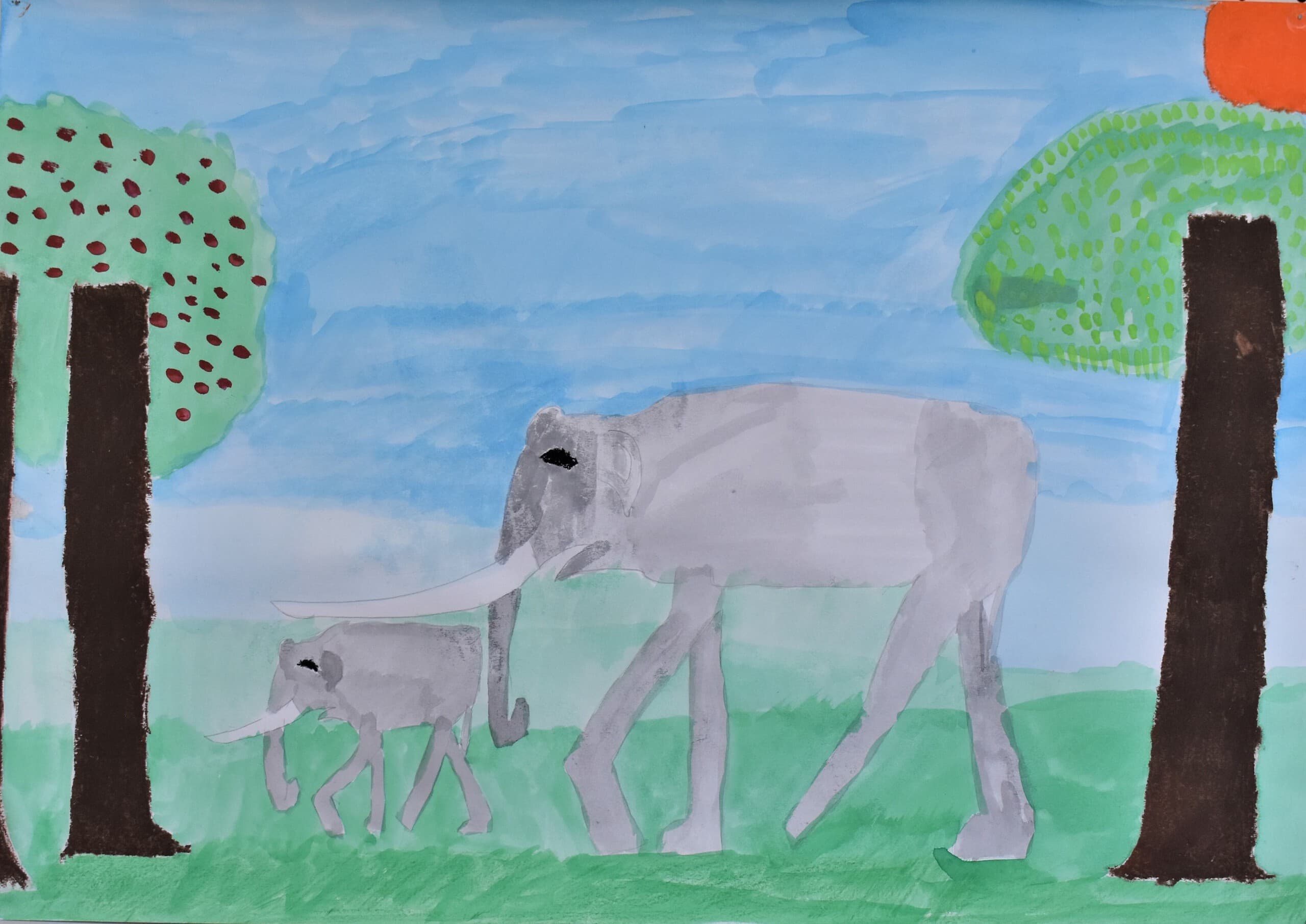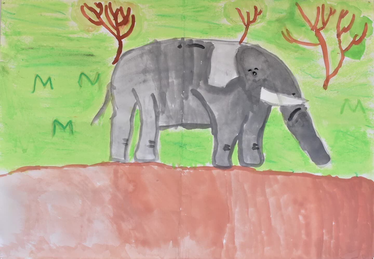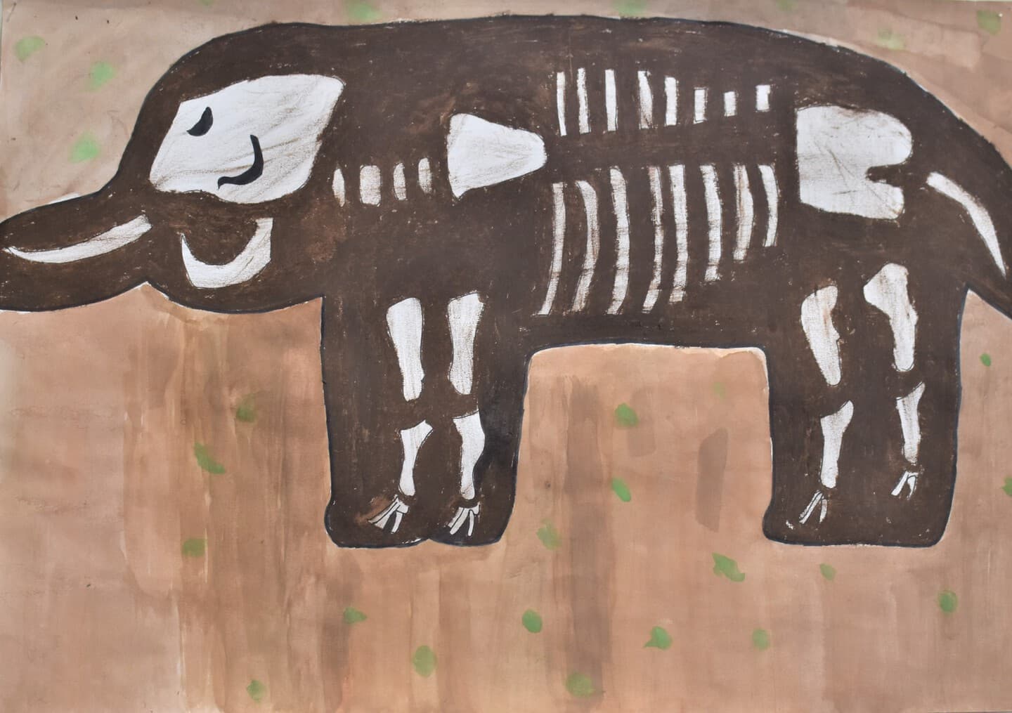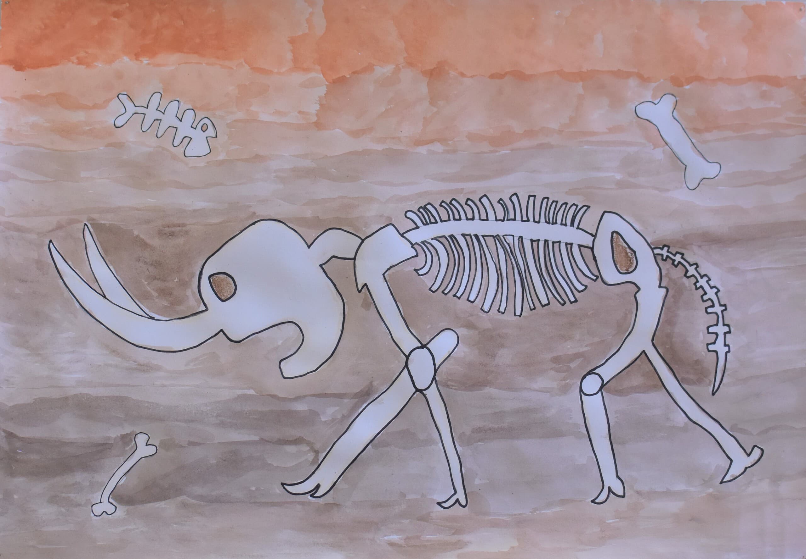 特に見て欲しい所は象の骨側です。白いだけじゃなくて、土がついている所をイメージして少し薄い黄色を付けました。木の部分は、クレパスで塗って、指で広げました。空のところも、グラデーションを使い、工夫して色を付けました。