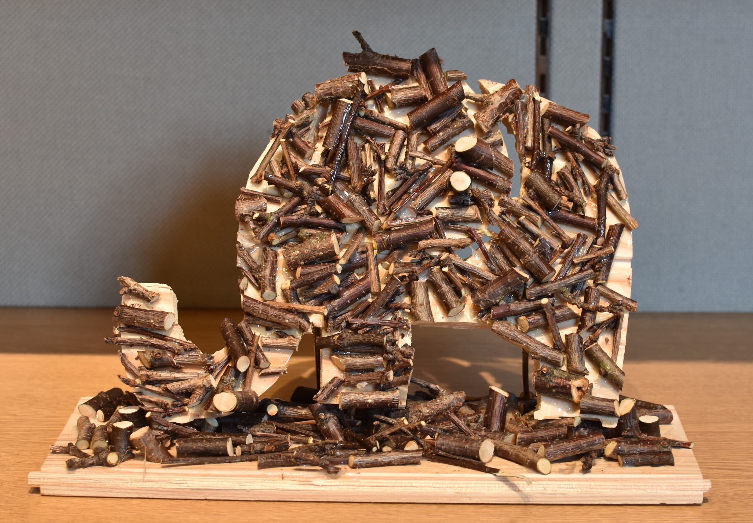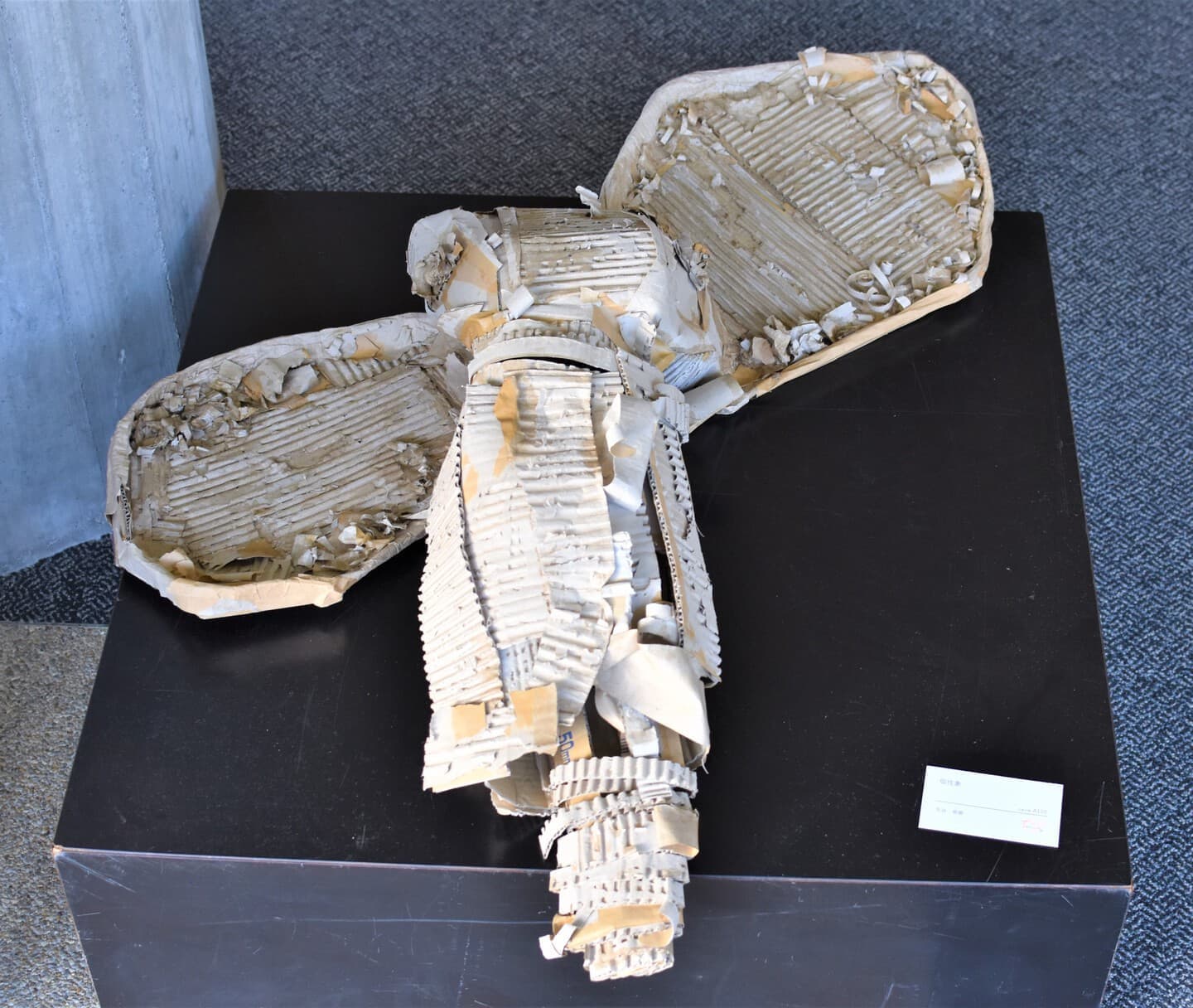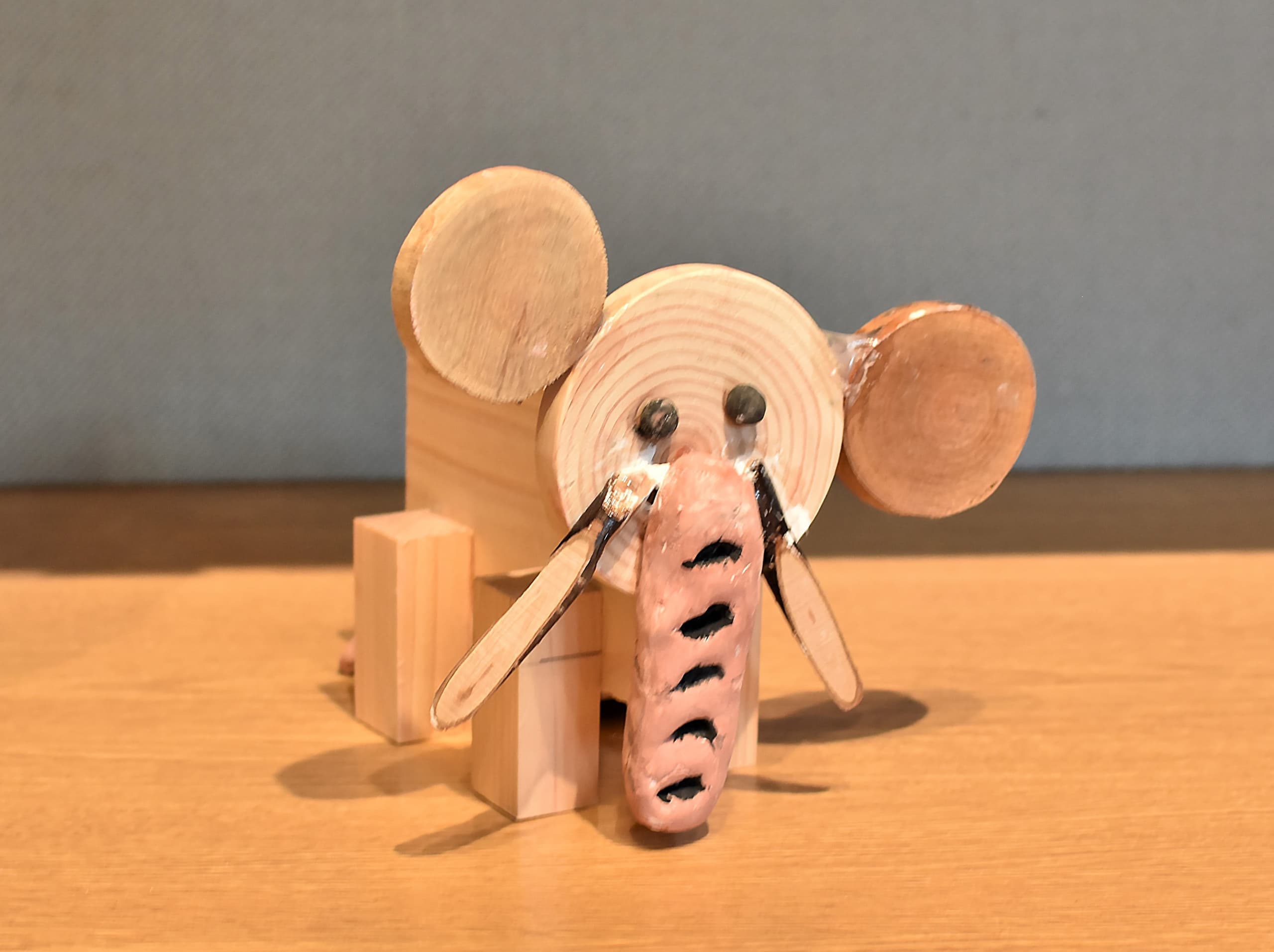 土台の材料に使った段ボールには温かみやゾウの皮膚をかもし出す凹凸があり、イメージが膨らみました。アケボノゾウの化石がシガタガゾウとしてが蘇ったらと思うとワクワクします!これから生まれるたくさんの伝説のひとつになれば嬉しいです。