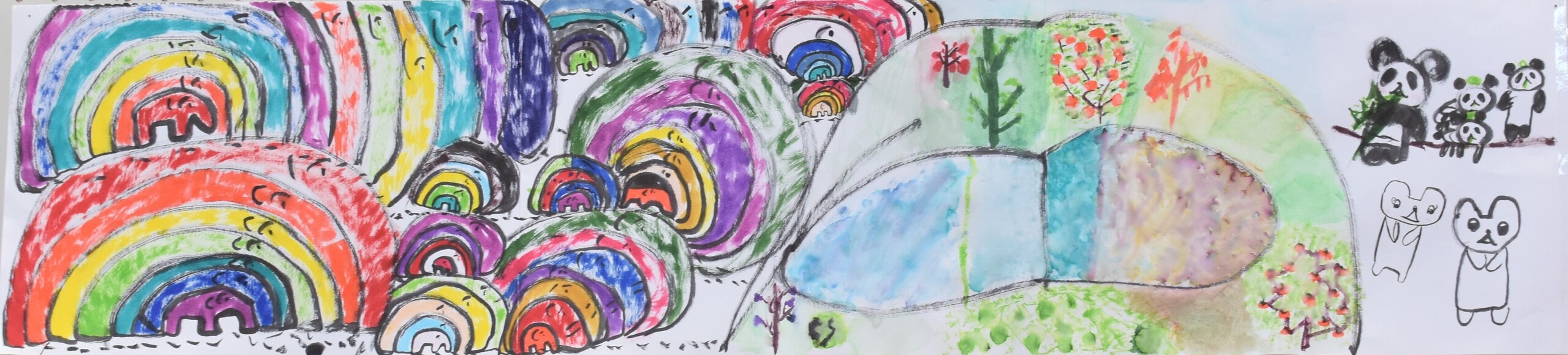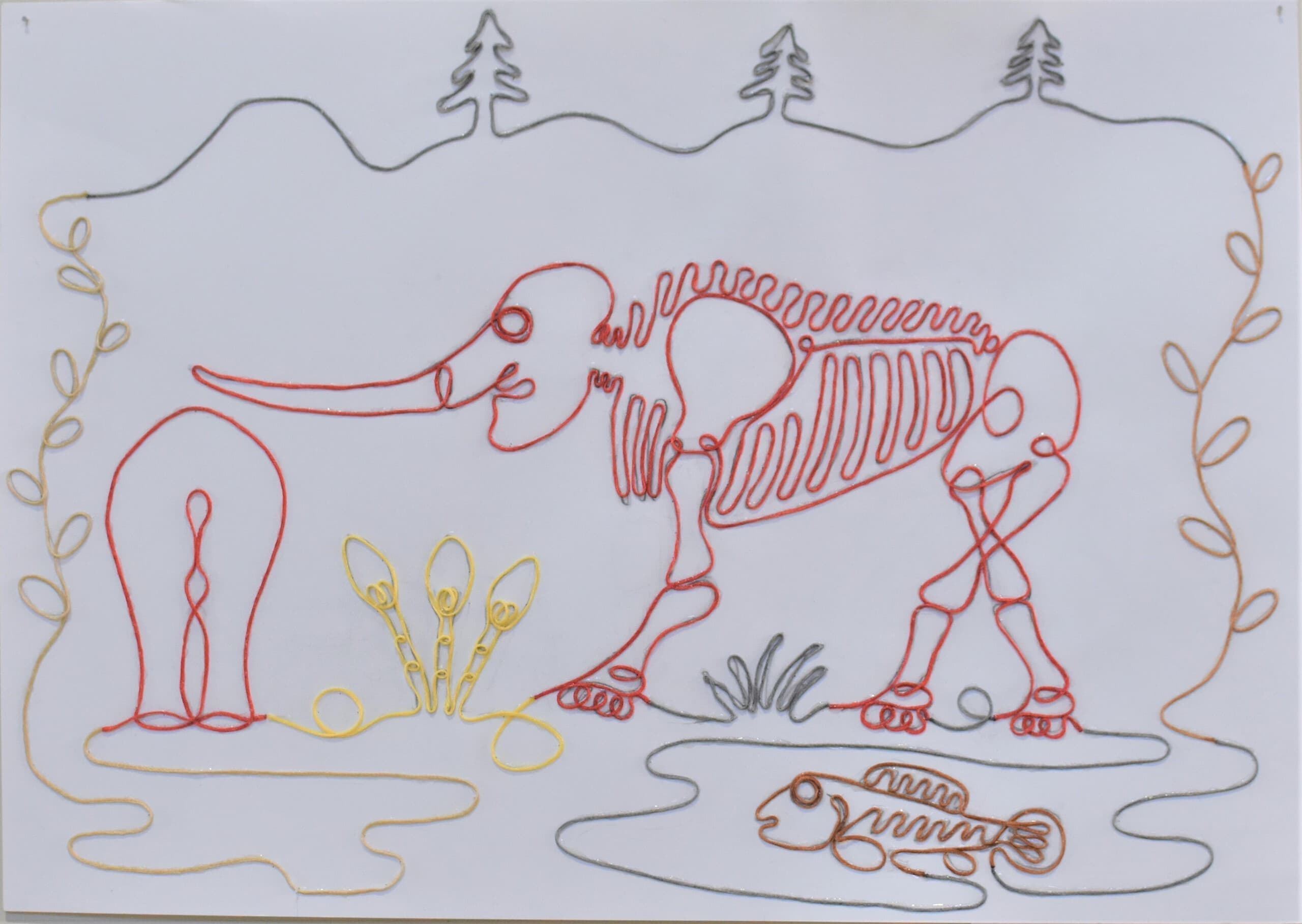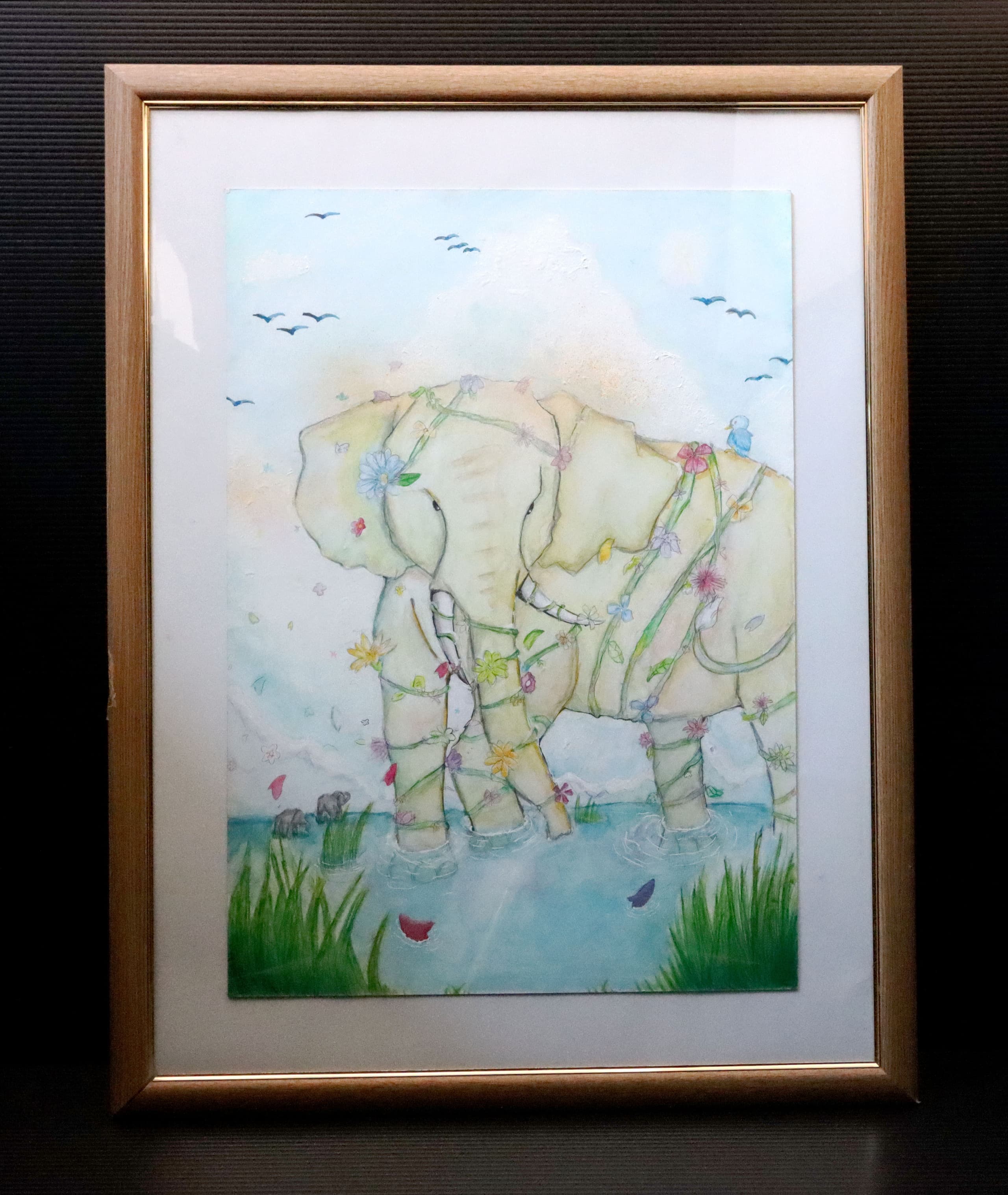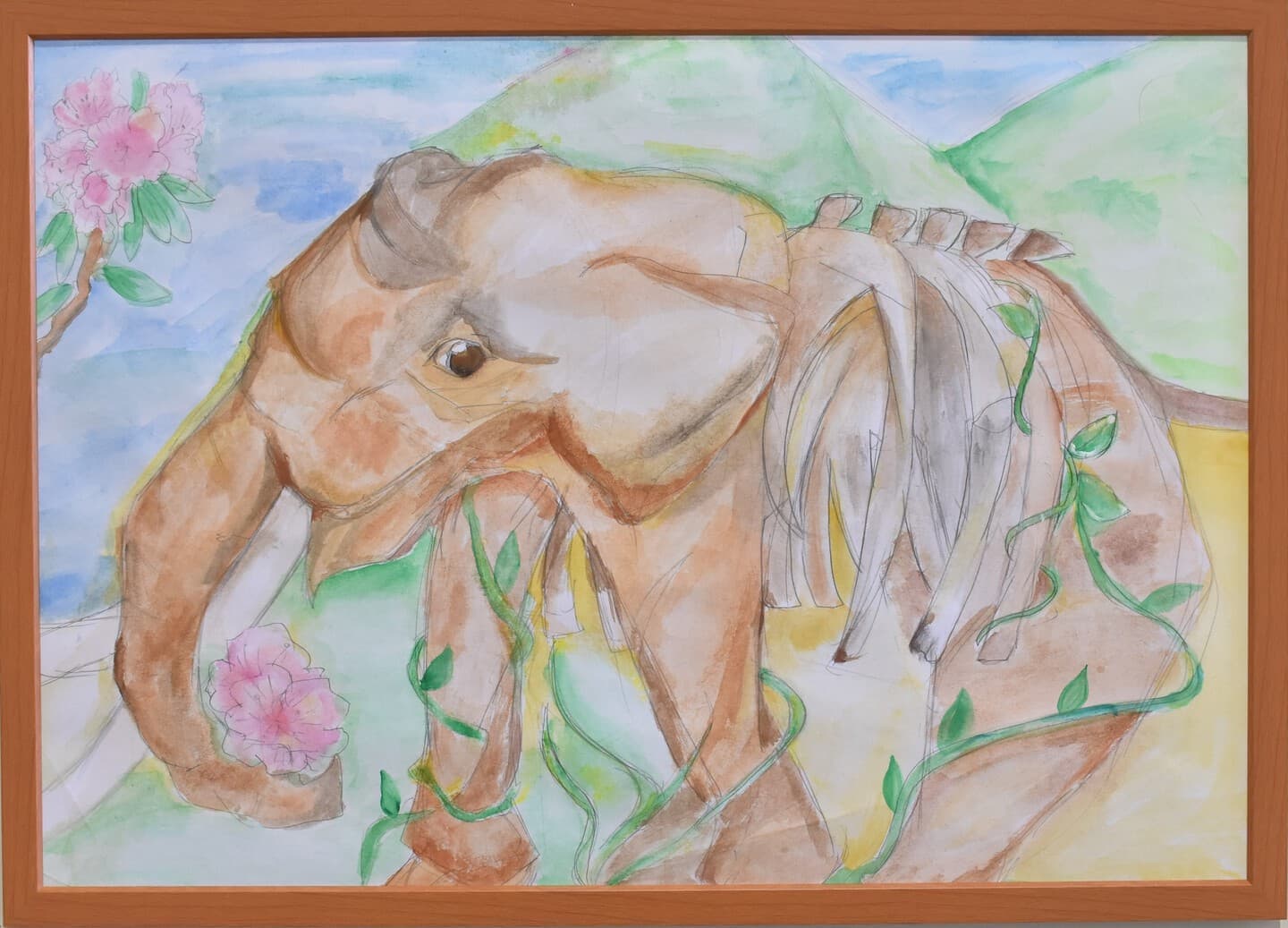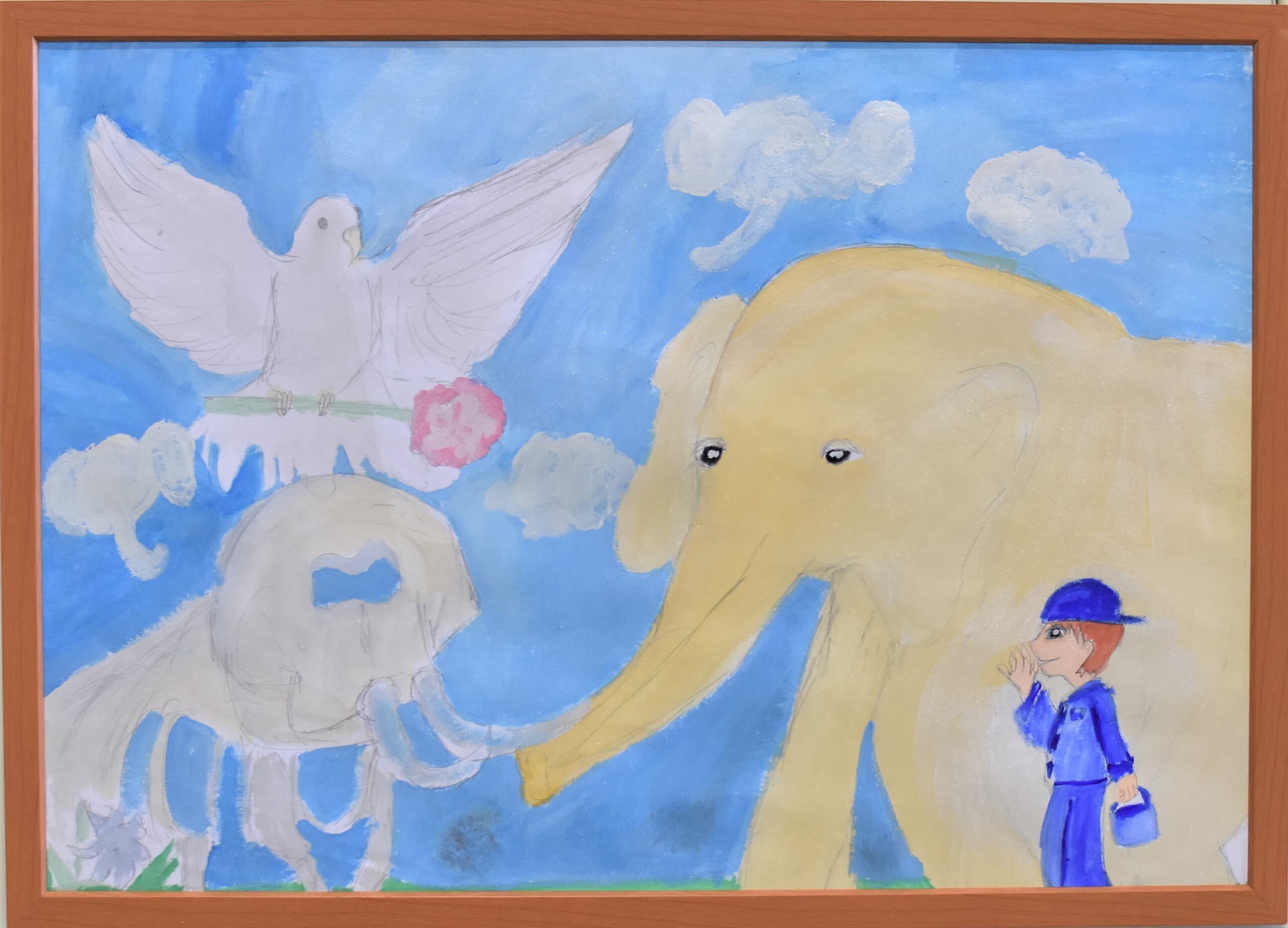 この作品は「もしも未来でアケボノゾウが生きていたらこんな風に暮らしていたらいいな」と思い想像しながら描きました。この作品で一番見て欲しい所は、子どものアケボノゾウが水を噴射しているところです。細かい水のところまで丁寧に描きました。未来でのアケボノゾウの想像の姿を想像しながら見てください。
