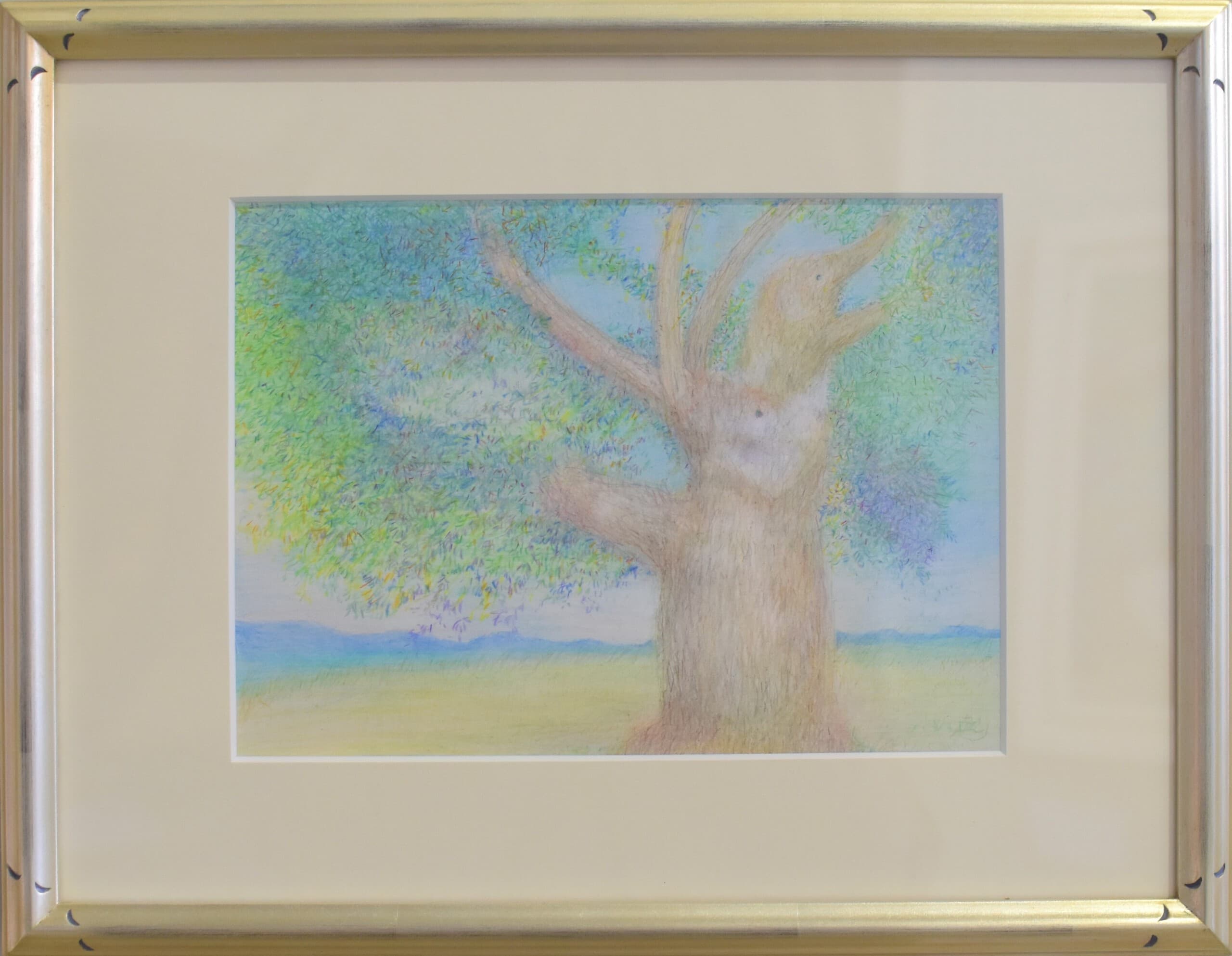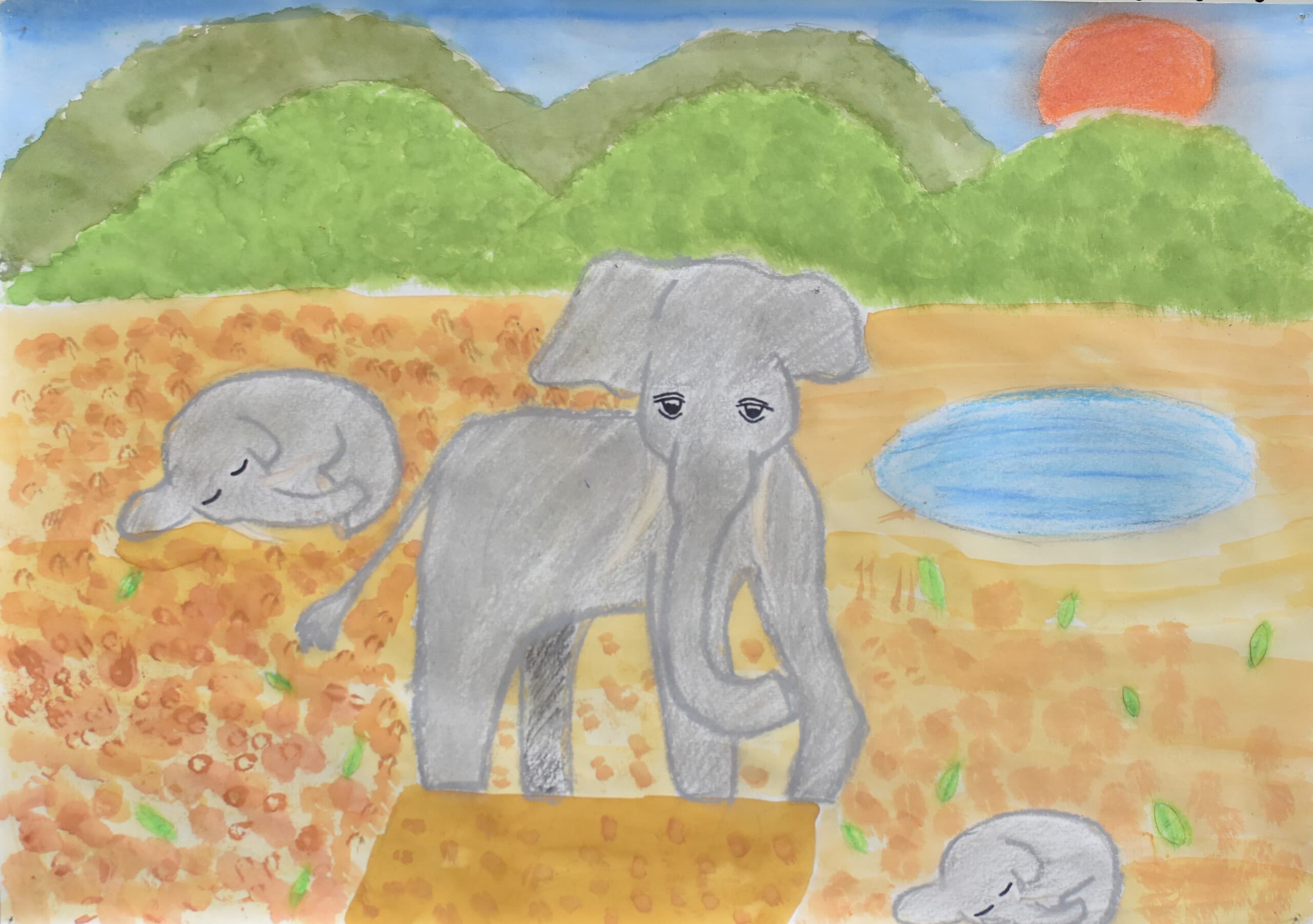 私のこの作品の見てほしいところは、ゾウを複数描きたかったため、ゾウの色の濃さを少しずつ変えてみたところです。私がこの作品で伝えたいことはアケボノゾウは昔このように朝から少しづつ少しづつ行進していたのではないかと思いました。その中で自然を丁寧に描くことで今はどんどん自然が減っていっているのだとこの絵を通して伝えたいと思いました。また、アケボノゾウが今もしかして生きていたのならこのような姿であったであろうと思いながら描きました。この作品の頑張ったところは朝日の時間帯を描きたかったため、背景はグラデーションで一部青空にすることで明るさも出せるのではと思いながら描きました。太陽は色鉛筆でテカリを出すようにぬりました。