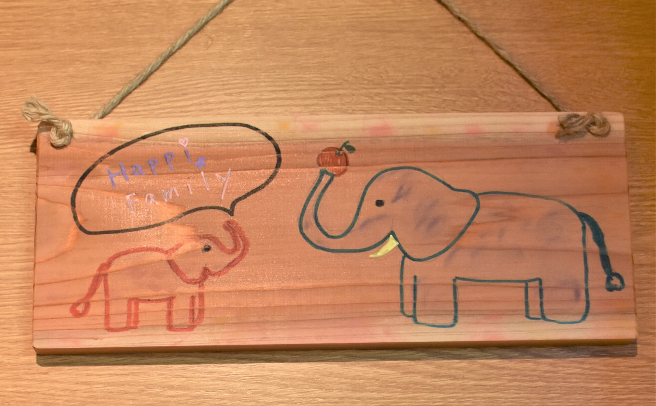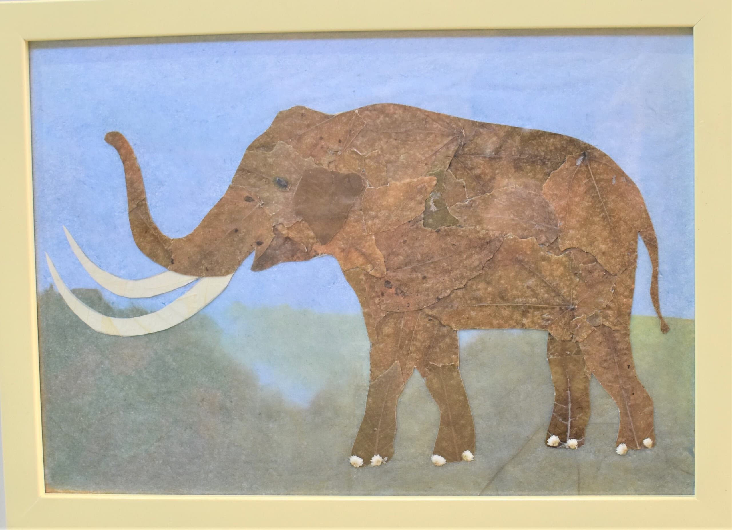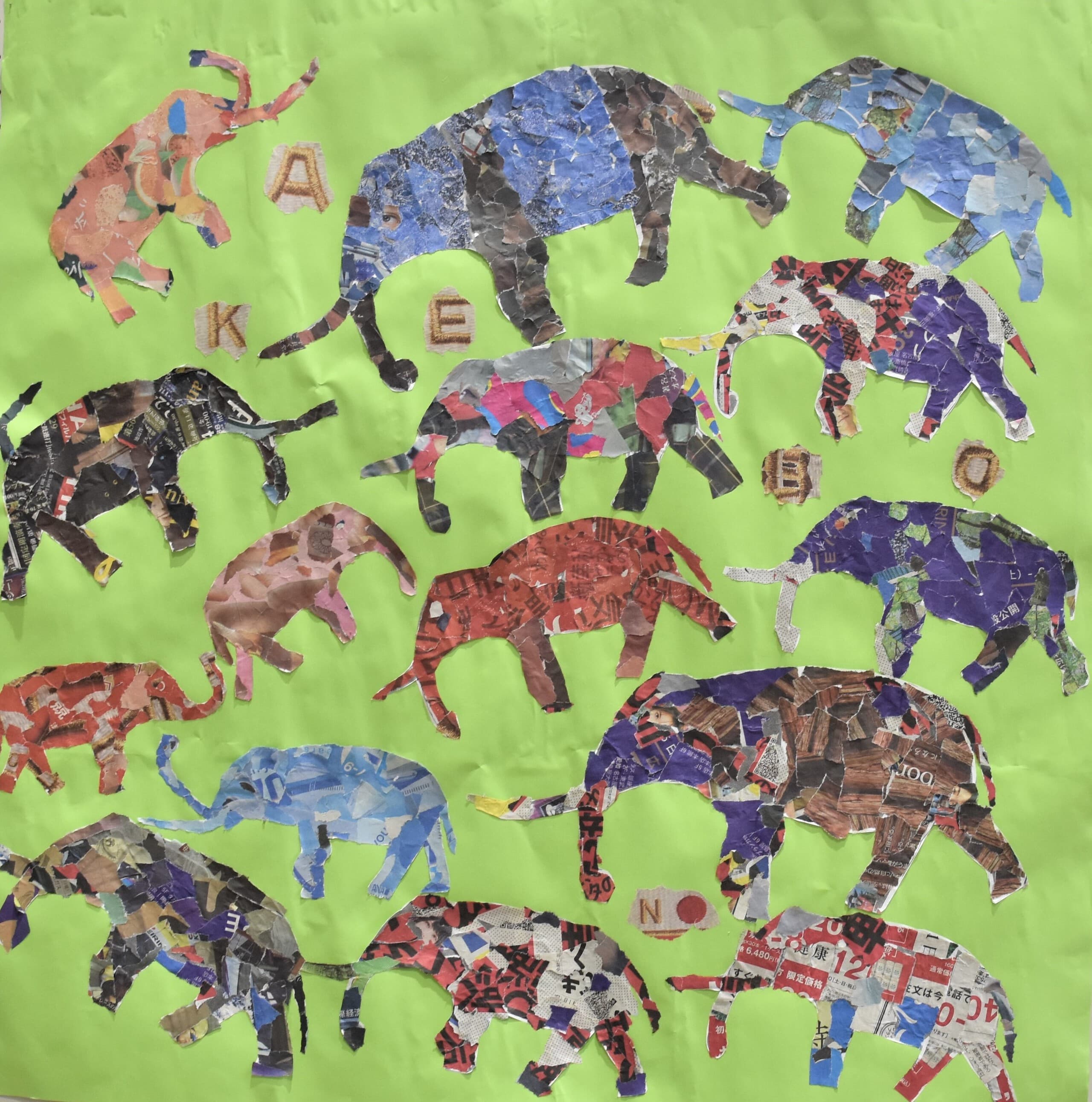 もうすぐ4歳になる娘と一緒に作りました。少し親が誘導しましたが、葉っぱの配置や出てきた言葉はほとんど娘が考えました。作品の最後にアケボノゾウの特徴の一つである長いキバをどれにするか、頑張って探して『これがいいね♫』と大満足で娘が決めました。どれがキバか見つけてもらえたら嬉しいです★