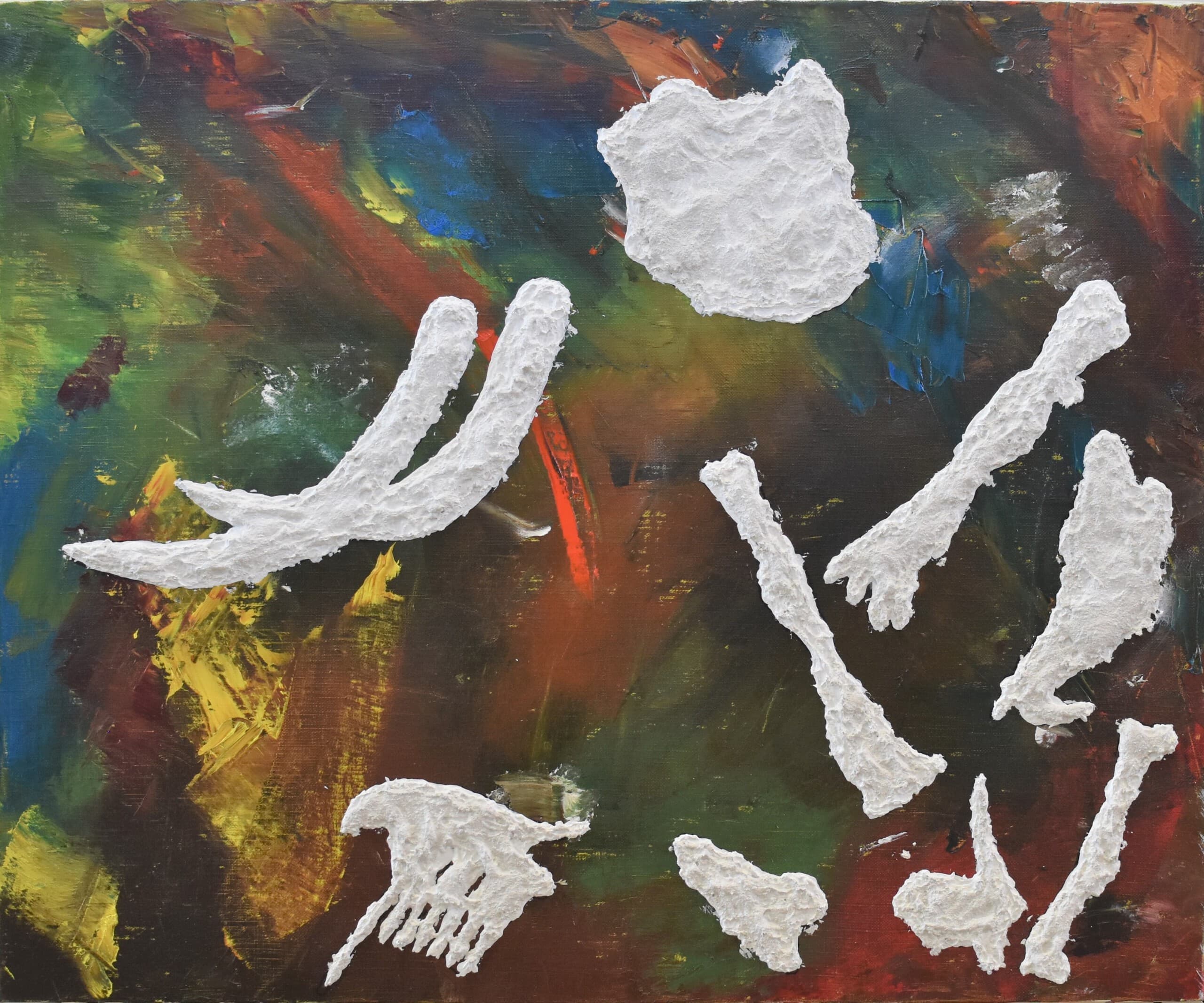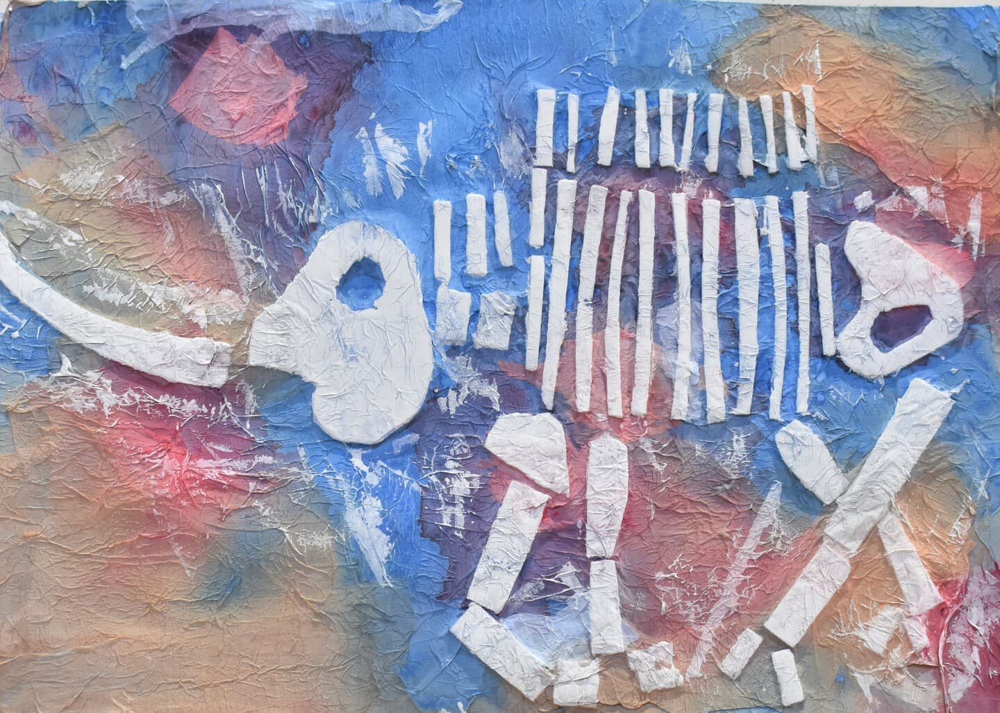 まず、今の多賀は自然が豊かなので下の葉っぱや木の葉などを筆で本物に近く見せれるように点々で塗ったり、雑巾を使ったりして工夫しました。他にも、空のグラデーションや骨の質を表せるようにクレヨンを使うなどと今まで習ったことを生かして自分の思うままに丁寧に書きました。